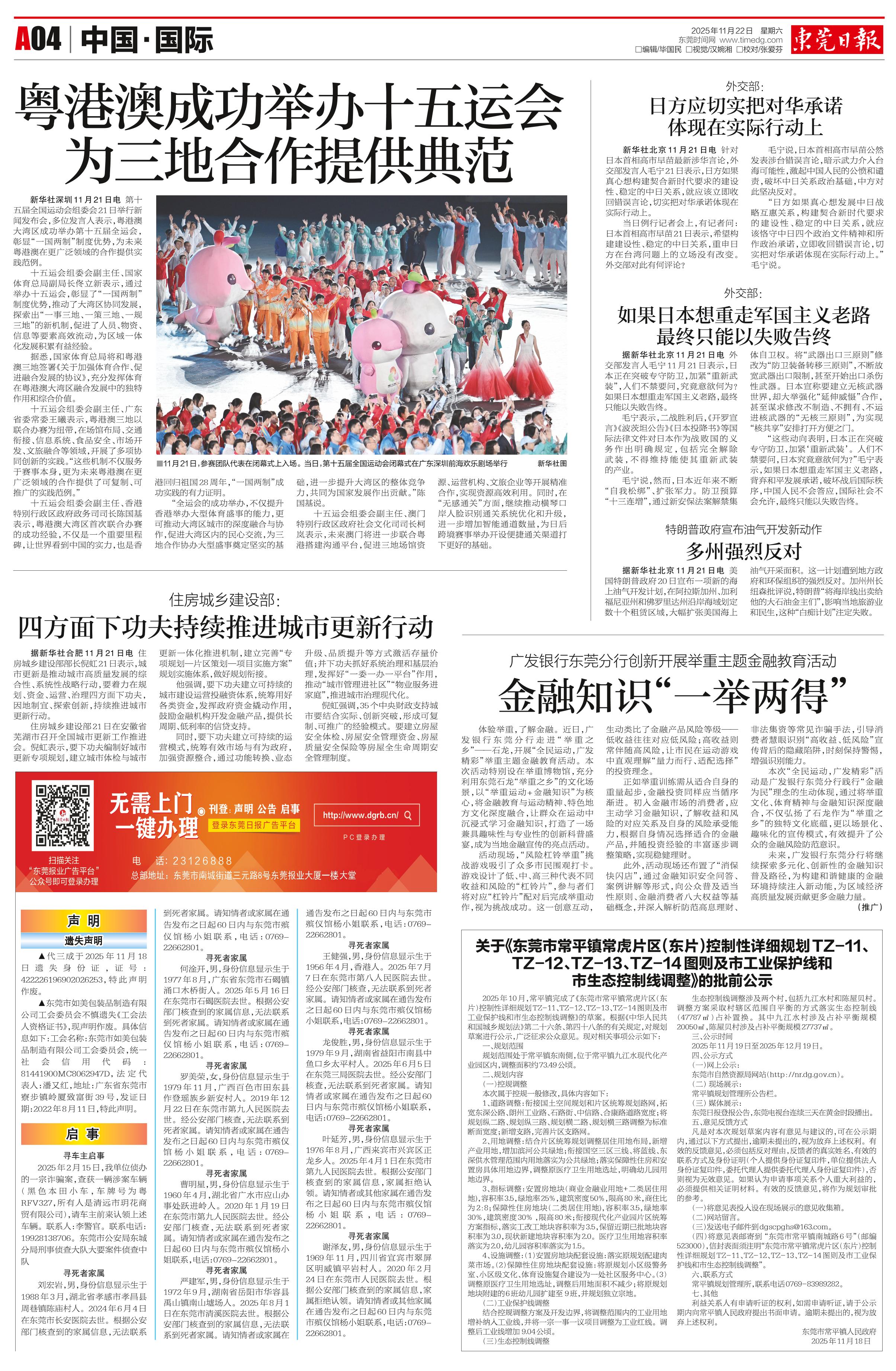 <div style='font-size: 16px!important;line-height: 28px!important;text-align: justify;color: #777!important;'>外交部:</div><div style='font-size: 22px!important;line-height: 34px!important;text-align: justify!important;color: #000!important'>日方应切实把对华承诺体现在实际行动上</div><div style='font-size: 14px!important;line-height: 22px!important;text-align: left!important;color: #777!important;margin-top: 20px;'>东莞日报  新华社北京11月21日电  2025-11-22</div><div><img id='paperImg' style='max-width: 100%;height: auto' src='//img.founderfx.cn/epaper/202511/22/53e456c8b89b481cb61c684bd56f7683/4.jpg' alt='' class='page-img'/></div><p> 针对日本首相高市早苗最新涉华言论,外交部发言人毛宁21日表示,日方如果真心想构建契合新时代要求的建设性、稳定的中日关系,就应该立即收回错误言论,切实把对华承诺体现在实际行动上。</p><p> 当日例行记者会上,有记者问:日本首相高市早苗21日表示,希望构建建设性、稳定的中日关系,重申日方在台湾问题上的立场没有改变。外交部对此有何评论?</p><p> 毛宁说,日本首相高市早苗公然发表涉台错误言论,暗示武力介入台海可能性,激起中国人民的公愤和谴责,破坏中日关系政治基础,中方对此坚决反对。</p><p> “日方如果真心想发展中日战略互惠关系,构建契合新时代要求的建设性、稳定的中日关系,就应该恪守中日四个政治文件精神和所作政治承诺,立即收回错误言论,切实把对华承诺体现在实际行动上。”毛宁说。</p>