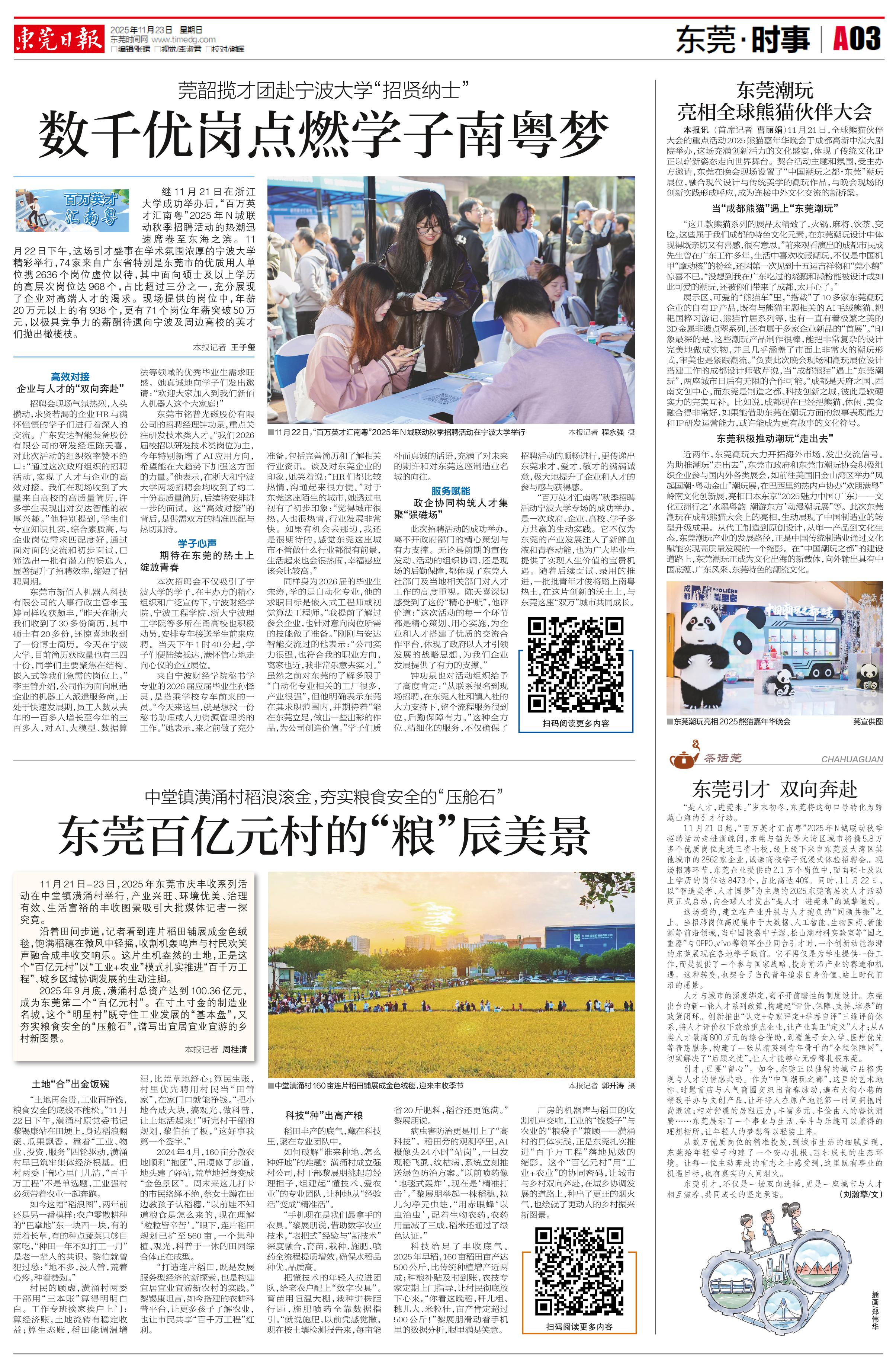 <div style='font-size: 16px!important;line-height: 28px!important;text-align: justify;color: #777!important;'>莞韶揽才团赴宁波大学“招贤纳士”</div><div style='font-size: 22px!important;line-height: 34px!important;text-align: justify!important;color: #000!important'>数千优岗点燃学子南粤梦</div><div style='font-size: 14px!important;line-height: 22px!important;text-align: left!important;color: #777!important;margin-top: 20px;'>东莞日报  本报记者 王子玺  2025-11-23</div><div><img id='paperImg' style='max-width: 100%;height: auto' src='//img.founderfx.cn/epaper/202511/23/0202ef00a232498bbecd819e9b7e315e/3.jpg' alt='' class='page-img'/></div><div style='font-size: 14px!important;line-height: 22px!important;text-align: center!important;color: #777!important;'><img src='//img.founderfx.cn/epaper/202511/23/0202ef00a232498bbecd819e9b7e315e/A03/20751885_sm1_1763812951023_s.jpg'style='display: block!important;margin: auto!important;max-width: 100%!important;'/> ■11月22日,“百万英才汇南粤”2025年N城联动秋季招聘活动在宁波大学举行 本报记者 程永强 摄</div><p> </p><p> </p><p> 继11月21日在浙江大学成功举办后,“百万英才汇南粤”2025年N城联动秋季招聘活动的热潮迅速席卷至东海之滨。11月22日下午,这场引才盛事在学术氛围浓厚的宁波大学精彩举行,74家来自广东省特别是东莞市的优质用人单位携2636个岗位虚位以待,其中面向硕士及以上学历的高层次岗位达968个,占比超过三分之一,充分展现了企业对高端人才的渴求。现场提供的岗位中,年薪20万元以上的有938个,更有71个岗位年薪突破50万元,以极具竞争力的薪酬待遇向宁波及周边高校的英才们抛出橄榄枝。</p><p> </p><p> </p><p> 高效对接</p><p> 企业与人才的“双向奔赴”</p><p> 招聘会现场气氛热烈,人头攒动,求贤若渴的企业HR与满怀憧憬的学子们进行着深入的交流。广东安达智能装备股份有限公司的研发经理陈天喜,对此次活动的组织效率赞不绝口:“通过这次政府组织的招聘活动,实现了人才与企业的高效对接。我们在现场收到了大量来自高校的高质量简历,许多学生表现出对安达智能的浓厚兴趣。”他特别提到,学生们专业知识扎实,综合素质高,与企业岗位需求匹配度好,通过面对面的交流和初步面试,已筛选出一批有潜力的候选人,显著提升了招聘效率,缩短了招聘周期。</p><p> 东莞市新佰人机器人科技有限公司的人事行政主管李玉婷同样收获颇丰,“昨天在浙大我们收到了30多份简历,其中硕士有20多份,还惊喜地收到了一份博士简历。今天在宁波大学,目前简历获取量也有三四十份,同学们主要聚焦在结构、嵌入式等我们急需的岗位上。”李主管介绍,公司作为面向制造企业的机器工人派遣服务商,正处于快速发展期,员工人数从去年的一百多人增长至今年的三百多人,对AI、大模型、数据算法等领域的优秀毕业生需求旺盛。她真诚地向学子们发出邀请:“欢迎大家加入到我们新佰人机器人这个大家庭!”</p><p> 东莞市铭普光磁股份有限公司的招聘经理钟功泉,重点关注研发技术类人才。“我们2026届校招以研发技术类岗位为主,今年特别新增了AI应用方向,希望能在大趋势下加强这方面的力量。”他表示,在浙大和宁波大学两场招聘会均收到了约二十份高质量简历,后续将安排进一步的面试。这“高效对接”的背后,是供需双方的精准匹配与热切期待。</p><p> 学子心声</p><p> 期待在东莞的热土上绽放青春</p><p> 本次招聘会不仅吸引了宁波大学的学子,在主办方的精心组织和广泛宣传下,宁波财经学院、宁波工程学院、浙大宁波理工学院等多所在甬高校也积极动员,安排专车接送学生前来应聘。当天下午1时40分起,学子们便陆续抵达,满怀信心地走向心仪的企业展位。</p><p> 来自宁波财经学院秘书学专业的2026届应届毕业生孙怿灵,是搭乘学校专车前来的一员。“今天来这里,就是想找一份秘书助理或人力资源管理类的工作。”她表示,来之前做了充分准备,包括完善简历和了解相关行业资讯。谈及对东莞企业的印象,她笑着说:“HR们都比较热情,沟通起来很方便。”对于东莞这座陌生的城市,她透过电视有了初步印象:“觉得城市很热,人也很热情,行业发展非常快。如果有机会去那边,我还是很期待的,感觉东莞这座城市不管做什么行业都很有前景,生活起来也会很热闹,幸福感应该会比较高。”</p><p> 同样身为2026届的毕业生宋涛,学的是自动化专业,他的求职目标是嵌入式工程师或视觉算法工程师。“我提前了解过参会企业,也针对意向岗位所需的技能做了准备。”刚刚与安达智能交流过的他表示:“公司实力很强,也符合我的职业方向,离家也近,我非常乐意去实习。”虽然之前对东莞的了解多限于“自动化专业相关的工厂很多,产业很强”,但他明确表示东莞在其求职范围内,并期待着“能在东莞立足,做出一些出彩的作品,为公司创造价值。”学子们质朴而真诚的话语,充满了对未来的期许和对东莞这座制造业名城的向往。</p><p> 服务赋能</p><p> 政企协同构筑人才集聚“强磁场”</p><p> 此次招聘活动的成功举办,离不开政府部门的精心策划与有力支撑。无论是前期的宣传发动、活动的组织协调,还是现场的后勤保障,都体现了东莞人社部门及当地相关部门对人才工作的高度重视。陈天喜深切感受到了这份“精心护航”,他评价道:“这次活动的每一个环节都是精心策划、用心实施,为企业和人才搭建了优质的交流合