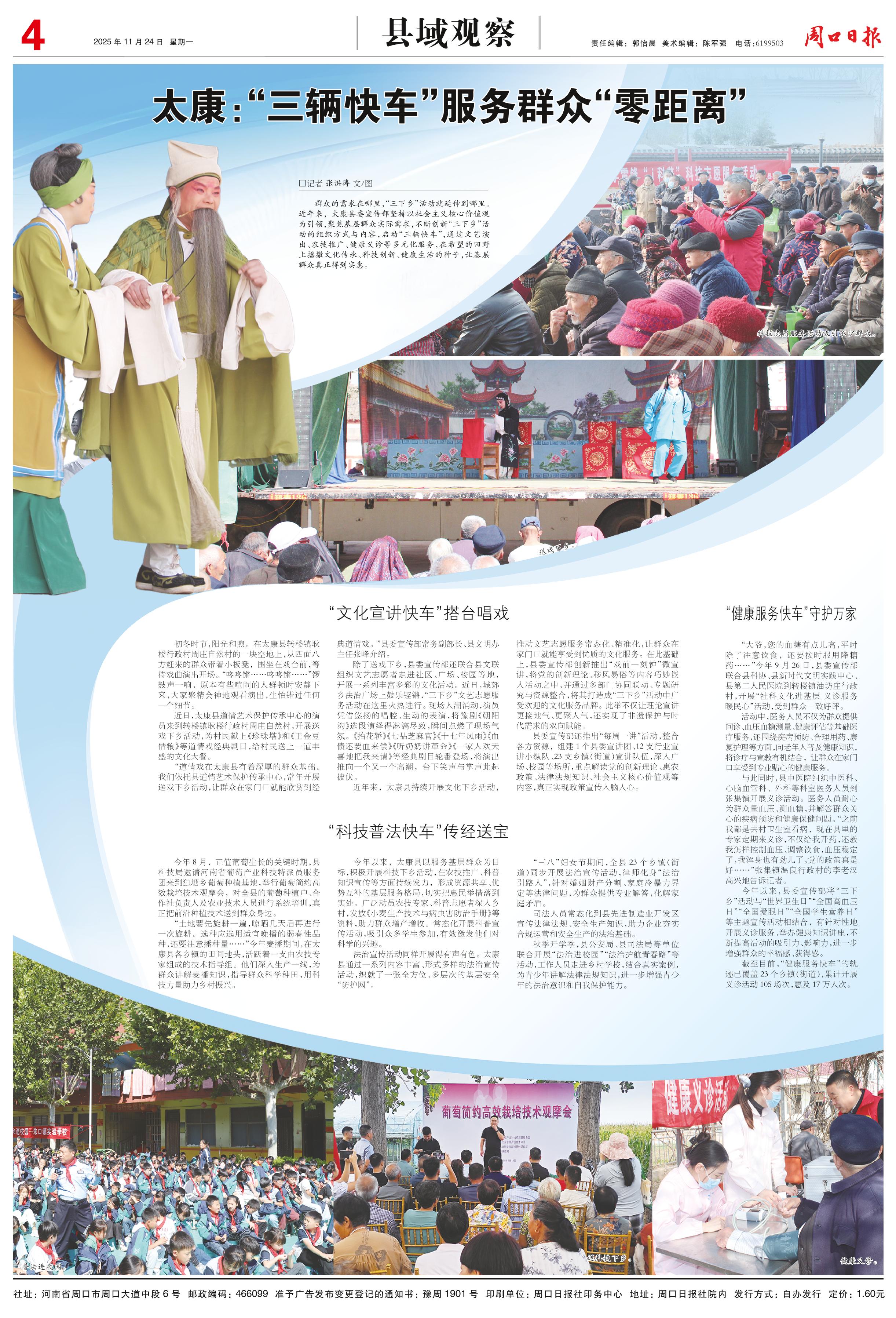 <div style='font-size: 22px!important;line-height: 34px!important;text-align: justify!important;color: #000!important'>太康:“三辆快车”服务群众“零距离”</div><div style='font-size: 14px!important;line-height: 22px!important;text-align: left!important;color: #777!important;margin-top: 20px;'>周口日报  2025-11-24</div><div><img id='paperImg' style='max-width: 100%;height: auto' src='//img.founderfx.cn/epaper/202511/24/37ac27497e9c4396b6d95cab6100b531/4.jpg' alt='' class='page-img'/></div><div style='font-size: 14px!important;line-height: 22px!important;text-align: center!important;color: #777!important;'><img src='//img.founderfx.cn/epaper/202511/24/37ac27497e9c4396b6d95cab6100b531/04/86b3539cc94285b44523a1ebb331fb9f_s.jpg'style='display: block!important;margin: auto!important;max-width: 100%!important;'/></div><p> □记者 张洪涛 文/图</p><p> 群众的需求在哪里,“三下乡”活动就延伸到哪里。近年来,太康县委宣传部坚持以社会主义核心价值观为引领,聚焦基层群众实际需求,不断创新“三下乡”活动的组织方式与内容,启动“三辆快车”,通过文艺演出、农技推广、健康义诊等多元化服务,在希望的田野上播撒文化传承、科技创新、健康生活的种子,让基层群众真正得到实惠。</p><p> </p><p> “文化宣讲快车”搭台唱戏</p><p> 初冬时节,阳光和煦。在太康县转楼镇耿楼行政村周庄自然村的一块空地上,从四面八方赶来的群众带着小板凳,围坐在戏台前,等待戏曲演出开场。“咚咚锵……咚咚锵……”锣鼓声一响,原本有些喧闹的人群顿时安静下来,大家聚精会神地观看演出,生怕错过任何一个细节。</p><p> 近日,太康县道情艺术保护传承中心的演员来到转楼镇耿楼行政村周庄自然村,开展送戏下乡活动,为村民献上《珍珠塔》和《王金豆借粮》等道情戏经典剧目,给村民送上一道丰盛的文化大餐。</p><p> “道情戏在太康县有着深厚的群众基础。我们依托县道情艺术保护传承中心,常年开展送戏下乡活动,让群众在家门口就能欣赏到经典道情戏。”县委宣传部常务副部长、县文明办主任张峰介绍。</p><p> 除了送戏下乡,县委宣传部还联合县文联组织文艺志愿者走进社区、广场、校园等地,开展一系列丰富多彩的文化活动。近日,城郊乡法治广场上鼓乐铿锵,“三下乡”文艺志愿服务活动在这里火热进行。现场人潮涌动,演员凭借悠扬的唱腔、生动的表演,将豫剧《朝阳沟》选段演绎得淋漓尽致,瞬间点燃了现场气氛。《抬花轿》《七品芝麻官》《十七年风雨》《血债还要血来偿》《听奶奶讲革命》《一家人欢天喜地把我来请》等经典剧目轮番登场,将演出推向一个又一个高潮,台下笑声与掌声此起彼伏。</p><p> 近年来,太康县持续开展文化下乡活动,推动文艺志愿服务常态化、精准化,让群众在家门口就能享受到优质的文化服务。在此基础上,县委宣传部创新推出“戏前一刻钟”微宣讲,将党的创新理论、移风易俗等内容巧妙嵌入活动之中,并通过多部门协同联动、专题研究与资源整合,将其打造成“三下乡”活动中广受欢迎的文化服务品牌。此举不仅让理论宣讲更接地气、更聚人气,还实现了非遗保护与时代需求的双向赋能。</p><p> 县委宣传部还推出“每周一讲”活动,整合各方资源,组建1个县委宣讲团、12支行业宣讲小纵队、23支乡镇(街道)宣讲队伍,深入广场、校园等场所,重点解读党的创新理论、惠农政策、法律法规知识、社会主义核心价值观等内容,真正实现政策宣传入脑入心。</p><p> </p><p> “科技普法快车”传经送宝</p><p> 今年8月,正值葡萄生长的关键时期,县科技局邀请河南省葡萄产业科技特派员服务团来到独塘乡葡萄种植基地,举行葡萄简约高效栽培技术观摩会,对全县的葡萄种植户、合作社负责人及农业技术人员进行系统培训,真正把前沿种植技术送到群众身边。</p><p> “土地要先旋耕一遍,晾晒几天后再进行一次旋耕。选种应选用适宜晚播的弱春性品种,还要注意播种量……”今年麦播期间,在太康县各乡镇的田间地头,活跃着一支由农技专家组成的技术指导组。他们深入生产一线,为群众讲解麦播知识,指导群众科学种田,用科技力量助力乡村振兴。</p><p> 今年以来,太康县以服务基层群众为目标,积极开展科技下乡活动,在农技推广、科普知识宣传等方面持续发力,形成资源共享、优势互补的基层服务格局,切实把惠民举措落到实处。广泛动员农技专家、科普志愿者深入乡村,发放《小麦生产技术与病虫害防治手册》等资料,助力群众增产增收。常态化开展科普宣传活动,吸引众多学生参加,有效激发他们对科学的兴趣。</p><p> 法治宣传活动同样开展得有声有色。太康县通过一系列内容丰富、形式多样的法治宣传活动,织就了一张全方位、多层次的基层安全“防护网”。</p><p> “三八”妇女节期间,全县23个乡镇(街道)同步开展法治宣传活动,律师化身“法治引路人”,针对婚姻财产分割、家庭冷暴力界定等法律问题,为群众提供专业解答,化解家庭矛盾。</p><p> 司法人员常态化到县先进制造业开发区宣传法律法规、安全生产知识,助力企业夯实合规运营和安全生产的法治基础。</p><p> 秋季开学季,县公安局、县司法局等单位联合开展“法治进校园”“法治护航青春路”等活动,工作人员走进乡村学校,结合真实案例,为青少年讲解法律法规知识,进一步增强青少年的法治意识和自我保护能力。</p><p> </p><p> “健康服务快车”守护万家