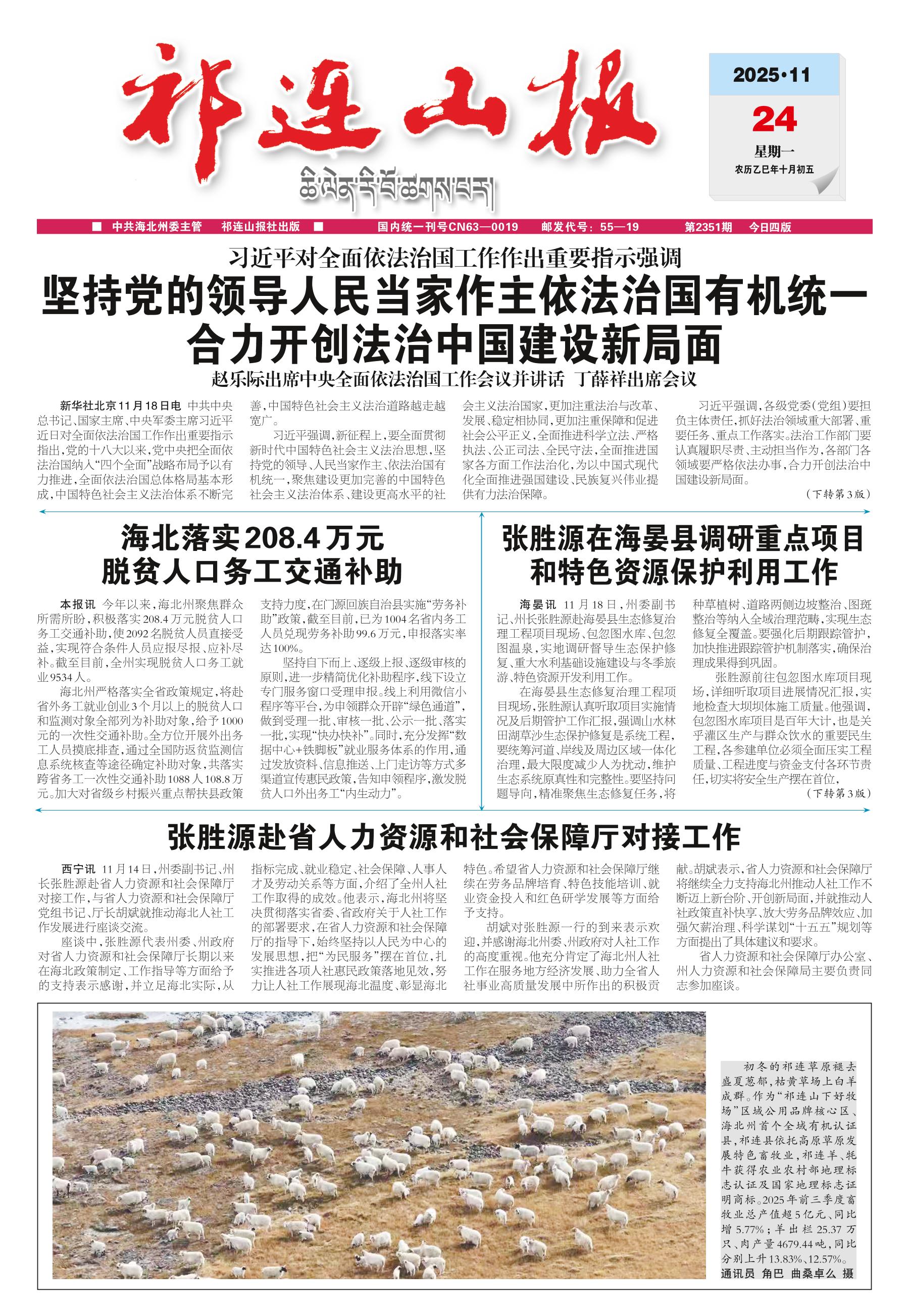 <div style='font-size: 16px!important;line-height: 28px!important;text-align: justify;color: #777!important;'>习近平对全面依法治国工作作出重要指示强调</div><div style='font-size: 22px!important;line-height: 34px!important;text-align: justify!important;color: #000!important'>坚持党的领导人民当家作主依法治国有机统一 合力开创法治中国建设新局面</div><div style='font-size: 16px!important;line-height: 28px!important;text-align: justify;color: #777!important;margin-top: 20px;'>赵乐际出席中央全面依法治国工作会议并讲话 丁薛祥出席会议</div><div style='font-size: 14px!important;line-height: 22px!important;text-align: left!important;color: #777!important;margin-top: 20px;'>祁连山报  2025-11-24</div><div><img id='paperImg' style='max-width: 100%;height: auto' src='//img.founderfx.cn/epaper/202511/25/bc30c7a505864de0ae40f25716139f9e/1.jpg' alt='' class='page-img'/></div><p> 新华社北京11月18日电 中共中央总书记、国家主席、中央军委主席习近平近日对全面依法治国工作作出重要指示指出,党的十八大以来,党中央把全面依法治国纳入“四个全面”战略布局予以有力推进,全面依法治国总体格局基本形成,中国特色社会主义法治体系不断完善,中国特色社会主义法治道路越走越宽广。</p><p> 习近平强调,新征程上,要全面贯彻新时代中国特色社会主义法治思想,坚持党的领导、人民当家作主、依法治国有机统一,聚焦建设更加完善的中国特色社会主义法治体系、建设更高水平的社会主义法治国家,更加注重法治与改革、发展、稳定相协同,更加注重保障和促进社会公平正义,全面推进科学立法、严格执法、公正司法、全民守法,全面推进国家各方面工作法治化,为以中国式现代化全面推进强国建设、民族复兴伟业提供有力法治保障。</p><p> 习近平强调,各级党委(党组)要担负主体责任,抓好法治领域重大部署、重要任务、重点工作落实。法治工作部门要认真履职尽责、主动担当作为,各部门各领域要严格依法办事,合力开创法治中国建设新局面。</p><p> (下转第3版)</p>