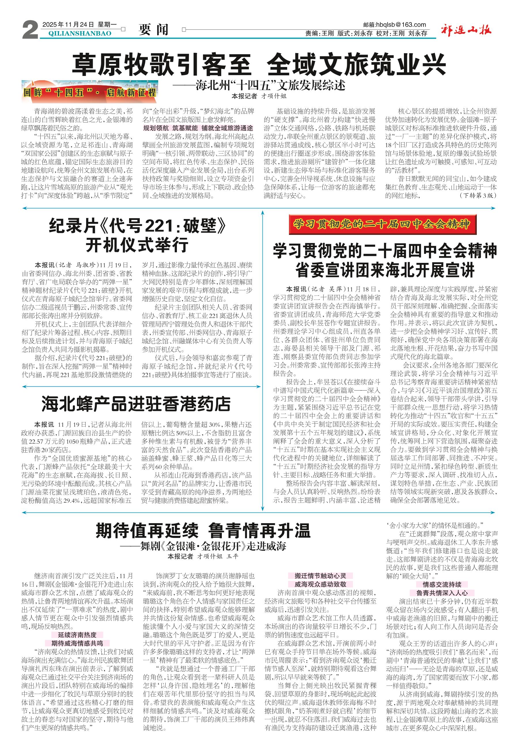 <div style='font-size: 22px!important;line-height: 34px!important;text-align: justify!important;color: #000!important'>草原牧歌引客至 全域文旅筑业兴</div><div style='font-size: 16px!important;line-height: 28px!important;text-align: justify;color: #777!important;margin-top: 20px;'>——海北州“十四五”文旅发展综述</div><div style='font-size: 14px!important;line-height: 22px!important;text-align: left!important;color: #777!important;margin-top: 20px;'>祁连山报  2025-11-24</div><div><img id='paperImg' style='max-width: 100%;height: auto' src='//img.founderfx.cn/epaper/202511/25/bc30c7a505864de0ae40f25716139f9e/2.jpg' alt='' class='page-img'/></div><p> 本报记者 才项什姐</p><p> 青海湖的碧波荡漾着生态之美,祁连山的白雪辉映着红色之光,金银滩的绿草飘荡着民俗之韵。</p><p> “十四五”以来,海北州以天地为幕、以全域资源为笔,立足祁连山、青海湖“双国家公园”创建区的生态禀赋与原子城的红色底蕴,锚定国际生态旅游目的地建设航向,统筹全州文旅发展布局,在生态保护与文旅融合的赛道上全速奔跑,让这片雪域高原的旅游产业从“观光打卡”向“深度体验”跨越,从“季节限定”向“全年出彩”升级,“梦幻海北”的品牌名片在全国文旅版图上愈发鲜亮。</p><p> 规划领航 筑基赋能 铺就全域旅游通途</p><p> 发展之路,规划为纲。海北州高起点擘画全州旅游发展蓝图,编制专项规划明确“一核引领、两带联动、三区协同”的空间布局,将红色传承、生态保护、民俗活化深度融入产业发展全局,出台系列扶持政策与奖励细则,设立专项资金引导市场主体参与,形成上下联动、政企协同、全域推进的发展格局。</p><p> 基础设施的持续升级,是旅游发展的“硬支撑”。海北州着力构建“快进慢游”立体交通网络,公路、铁路与机场联动发力,串联全州重点景区的景观道、旅游驿站贯通成线,核心景区半小时可达的便捷出行圈逐步形成。围绕游客体验需求,推进旅游厕所“建管护”一体化建设,新建生态停车场与标准化游客服务中心,完善全州导视系统、休息设施与应急保障体系,让每一位游客的旅途都充满舒适与安心。</p><p> 核心景区的提质增效,让全州资源优势加速转化为发展优势。金银滩-原子城景区对标高标准推进软硬件升级,通过“一厂一主题”的差异化保护模式,将18个旧厂区打造成各具特色的历史陈列馆与场景体验地,复原的爆轰试验场景让红色遗址成为可触摸、可感知、可互动的“活教材”。</p><p> 昔日默默无闻的同宝山,如今建成集红色教育、生态观光、山地运动于一体的网红地标,(下转第3版)</p>