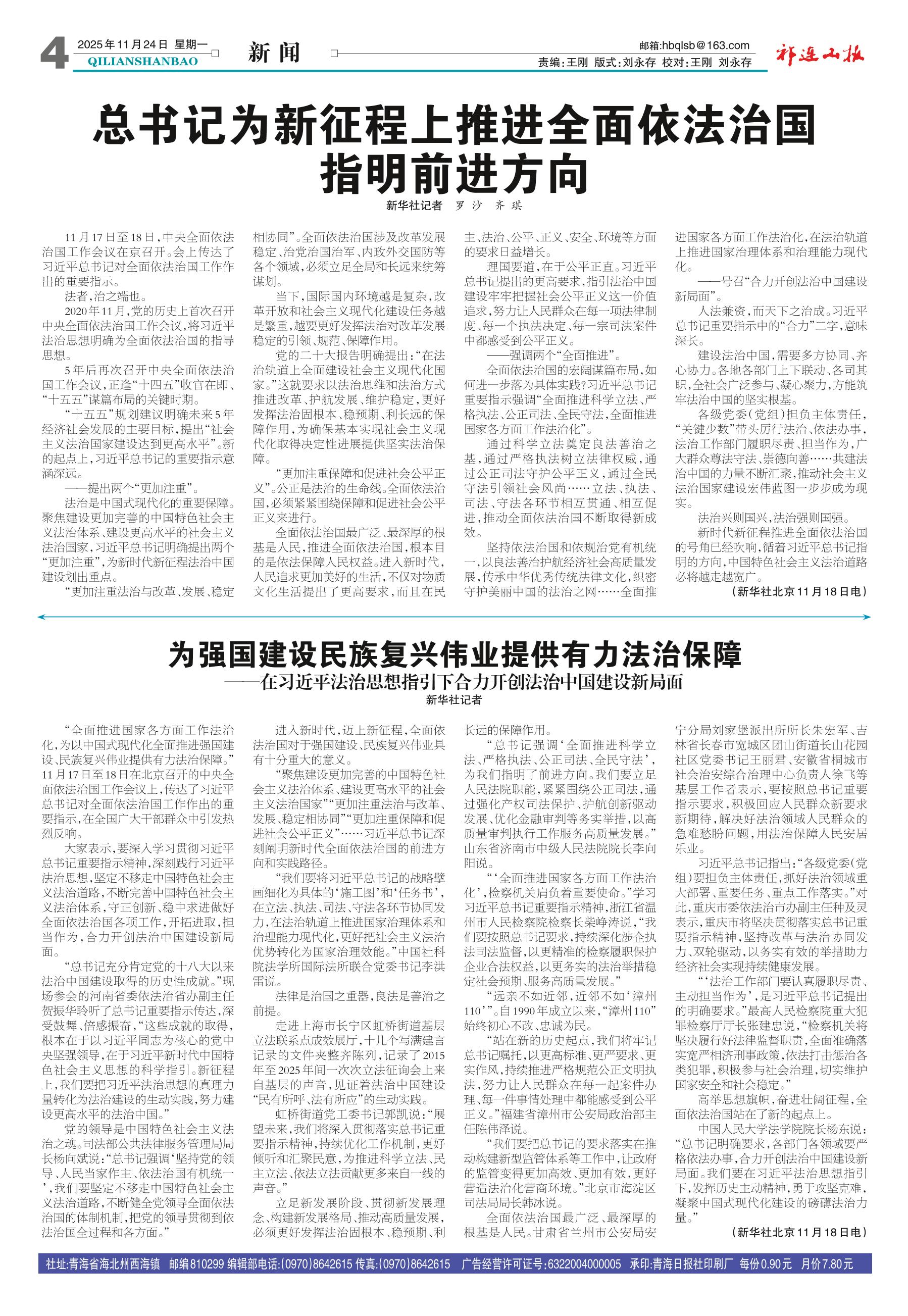 <div style='font-size: 22px!important;line-height: 34px!important;text-align: justify!important;color: #000!important'>总书记为新征程上推进全面依法治国 指明前进方向</div><div style='font-size: 14px!important;line-height: 22px!important;text-align: left!important;color: #777!important;margin-top: 20px;'>祁连山报  2025-11-24</div><div><img id='paperImg' style='max-width: 100%;height: auto' src='//img.founderfx.cn/epaper/202511/25/bc30c7a505864de0ae40f25716139f9e/4.jpg' alt='' class='page-img'/></div><p> 新华社记者 罗 沙 齐 琪</p><p> 11月17日至18日,中央全面依法治国工作会议在京召开。会上传达了习近平总书记对全面依法治国工作作出的重要指示。</p><p> 法者,治之端也。</p><p> 2020年11月,党的历史上首次召开中央全面依法治国工作会议,将习近平法治思想明确为全面依法治国的指导思想。</p><p> 5年后再次召开中央全面依法治国工作会议,正逢“十四五”收官在即、“十五五”谋篇布局的关键时期。</p><p> “十五五”规划建议明确未来5年经济社会发展的主要目标,提出“社会主义法治国家建设达到更高水平”。新的起点上,习近平总书记的重要指示意涵深远。</p><p> ——提出两个“更加注重”。</p><p> 法治是中国式现代化的重要保障。聚焦建设更加完善的中国特色社会主义法治体系、建设更高水平的社会主义法治国家,习近平总书记明确提出两个“更加注重”,为新时代新征程法治中国建设划出重点。</p><p> “更加注重法治与改革、发展、稳定相协同”。全面依法治国涉及改革发展稳定、治党治国治军、内政外交国防等各个领域,必须立足全局和长远来统筹谋划。</p><p> 当下,国际国内环境越是复杂,改革开放和社会主义现代化建设任务越是繁重,越要更好发挥法治对改革发展稳定的引领、规范、保障作用。</p><p> 党的二十大报告明确提出:“在法治轨道上全面建设社会主义现代化国家。”这就要求以法治思维和法治方式推进改革、护航发展、维护稳定,更好发挥法治固根本、稳预期、利长远的保障作用,为确保基本实现社会主义现代化取得决定性进展提供坚实法治保障。</p><p> “更加注重保障和促进社会公平正义”。公正是法治的生命线。全面依法治国,必须紧紧围绕保障和促进社会公平正义来进行。</p><p> 全面依法治国最广泛、最深厚的根基是人民,推进全面依法治国,根本目的是依法保障人民权益。进入新时代,人民追求更加美好的生活,不仅对物质文化生活提出了更高要求,而且在民主、法治、公平、正义、安全、环境等方面的要求日益增长。</p><p> 理国要道,在于公平正直。习近平总书记提出的更高要求,指引法治中国建设牢牢把握社会公平正义这一价值追求,努力让人民群众在每一项法律制度、每一个执法决定、每一宗司法案件中都感受到公平正义。</p><p> ——强调两个“全面推进”。</p><p> 全面依法治国的宏阔谋篇布局,如何进一步落为具体实践?习近平总书记重要指示强调“全面推进科学立法、严格执法、公正司法、全民守法,全面推进国家各方面工作法治化”。</p><p> 通过科学立法奠定良法善治之基,通过严格执法树立法律权威,通过公正司法守护公平正义,通过全民守法引领社会风尚……立法、执法、司法、守法各环节相互贯通、相互促进,推动全面依法治国不断取得新成效。</p><p> 坚持依法治国和依规治党有机统一,以良法善治护航经济社会高质量发展,传承中华优秀传统法律文化,织密守护美丽中国的法治之网……全面推进国家各方面工作法治化,在法治轨道上推进国家治理体系和治理能力现代化。</p><p> ——号召“合力开创法治中国建设新局面”。</p><p> 人法兼资,而天下之治成。习近平总书记重要指示中的“合力”二字,意味深长。</p><p> 建设法治中国,需要多方协同、齐心协力。各地各部门上下联动、各司其职,全社会广泛参与、凝心聚力,方能筑牢法治中国的坚实根基。</p><p> 各级党委(党组)担负主体责任,“关键少数”带头厉行法治、依法办事,法治工作部门履职尽责、担当作为,广大群众尊法守法、崇德向善……共建法治中国的力量不断汇聚,推动社会主义法治国家建设宏伟蓝图一步步成为现实。</p><p> 法治兴则国兴,法治强则国强。</p><p> 新时代新征程推进全面依法治国的号角已经吹响,循着习近平总书记指明的方向,中国特色社会主义法治道路必将越走越宽广。</p><p> (新华社北京11月18日电)</p>