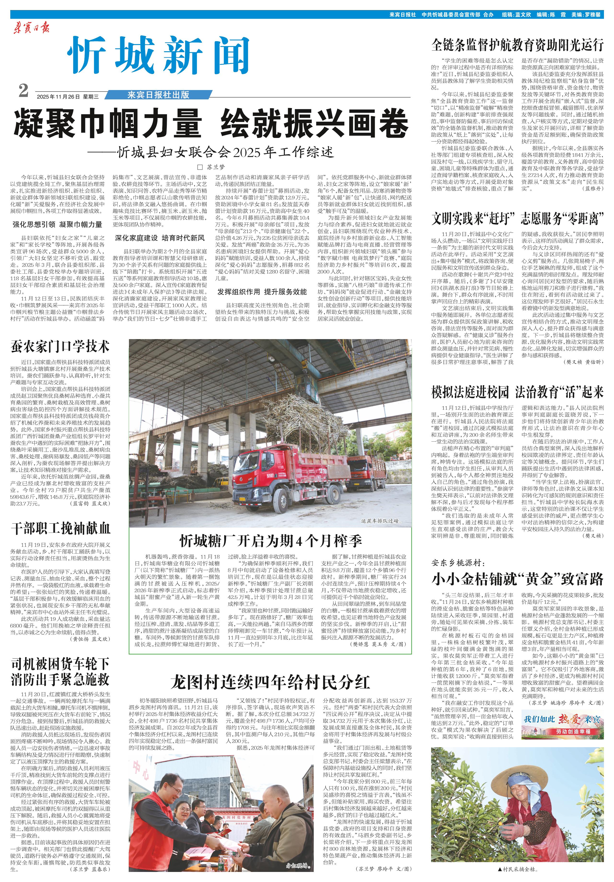 <div style='font-size: 22px!important;line-height: 34px!important;text-align: justify!important;color: #000!important'>凝聚巾帼力量 绘就振兴画卷</div><div style='font-size: 16px!important;line-height: 28px!important;text-align: justify;color: #777!important;margin-top: 20px;'>——忻城县妇女联合会2025年工作综述</div><div style='font-size: 14px!important;line-height: 22px!important;text-align: left!important;color: #777!important;margin-top: 20px;'>来宾日报  □ 苏兰梦  2025-11-26</div><div><img id='paperImg' style='max-width: 100%;height: auto' src='//img.founderfx.cn/epaper/202511/26/6bbf085aee0a46d98ba7c182ca6967ee/2.jpg' alt='' class='page-img'/></div><p> 今年以来,忻城县妇女联合会坚持以党建统揽全局工作,聚焦基层治理需求,扎实推进新经济组织、新社会组织、新就业群体等新领域妇联组织建设,强化暖“新”关爱服务,在经济社会发展中展现巾帼担当,各项工作取得显著成效。</p><p> 强化思想引领 凝聚巾帼力量</p><p> 县妇联依托“妇女之家”“儿童之家”和“家长学校”等阵地,开展各级各类宣讲96场次,受益群众5000余人,引领广大妇女坚定不移听党话、跟党走。2025年3月,联合县委组织部、县委社工部、县委党校举办专题培训班,118名基层妇女干部参加,有效提高基层妇女干部综合素质和基层社会治理能力。</p><p> 11月12日至13日,民族团结庆丰收·巾帼筑梦展风采——来宾市2025年巾帼兴粮节粮主题公益暨“巾帼普法乡村行”活动在忻城县举办。活动涵盖“妈妈集市”、文艺展演、普法宣传、非遗体验、农耕竞技等环节。主场活动中,文艺表演、知识问答、农特产品走秀等环节精彩绝伦,巾帼志愿者以山歌传唱普法知识,将法律条文融入悠扬曲调。在巾帼趣味竞技比赛环节,摘玉米、剥玉米、抛玉米等项目,不仅展现巾帼的农耕技能,更体现团队协作精神。</p><p> 深化家庭建设 培育时代新风</p><p> 县妇联举办为期2个月的全县家庭教育指导者培训课和智慧父母研修班,为30个亲子关系有问题的家庭提供线上线下“陪跑”打卡。系统组织开展“五进五送”等系列家庭教育指导活动10场,惠及500余户家庭。深入宣传《家庭教育促进法》《未成年人保护法》等法律法规。深化清廉家庭建设,开展家风家教理论宣讲活动,受益干部职工1000人次。结合传统节日开展家风主题活动32场次,举办“我们的节日·七夕”壮锦非遗手工艺品制作活动和清廉家风亲子研学活动,传递民族团结正能量。</p><p> 持续开展“春蕾计划”募捐活动,发放2024年“春蕾计划”资助款12.9万元,资助困境中小学女童81名;发放蓝天春蕾计划资助款16万元,资助高中女生40名。今年6月募捐活动共募集善款10.4万元。积极开展“母亲邮包”项目,发放“母亲邮包”213个、“母亲健康包”22个,总价值4.26万元,为235位贫困母亲送去关爱。发放“两癌”救助金35万元,为35名患病困境妇女提供帮助。开展“爱心妈妈”赋能培训,受益人数100余人,持续深化“爱心妈妈”志愿服务,招募882名“爱心妈妈”结对关爱1280名留守、困境儿童。</p><p> 发挥组织作用 提升服务效能</p><p> 县妇联高度关注性别角色、社会期望给女性带来的独特压力与挑战,积极创设自由表达与情感共鸣的“安全空间”。依托党群服务中心、新就业群体驿站、妇女之家等阵地,设立“娘家暖‘新’角”6个,配备女性用品、防寒消暑物资等“娘家人暖‘新’包”,让快递员、网约配送员等新就业群体妇女就近找到组织,感受“触手可及”的温暖。</p><p> 为提升新兴领域妇女产业发展能力与综合素养,促进妇女就地就近就业创业,县妇联围绕现代农业种养技术、庭院经济与乡村旅游新业态、人工智能赋能品牌打造与电商直播、经营管理等内容,组织新兴领域妇联“领头雁”参与“数字赋巾帼 电商筑梦行”竞赛、“庭院经济助力乡村振兴”等培训6次,覆盖2000人次。</p><p> 与此同时,针对辖区宝妈、失业女性等群体,实施“八桂巧娘”非遗传承工作坊、“妈妈岗”就业促进行动、“金融支持女性创业创新行动”等项目,提供技能培训、就业指导、实训孵化和金融支持等服务,帮助女性掌握实用技能与政策,实现居家灵活就业创业。</p>