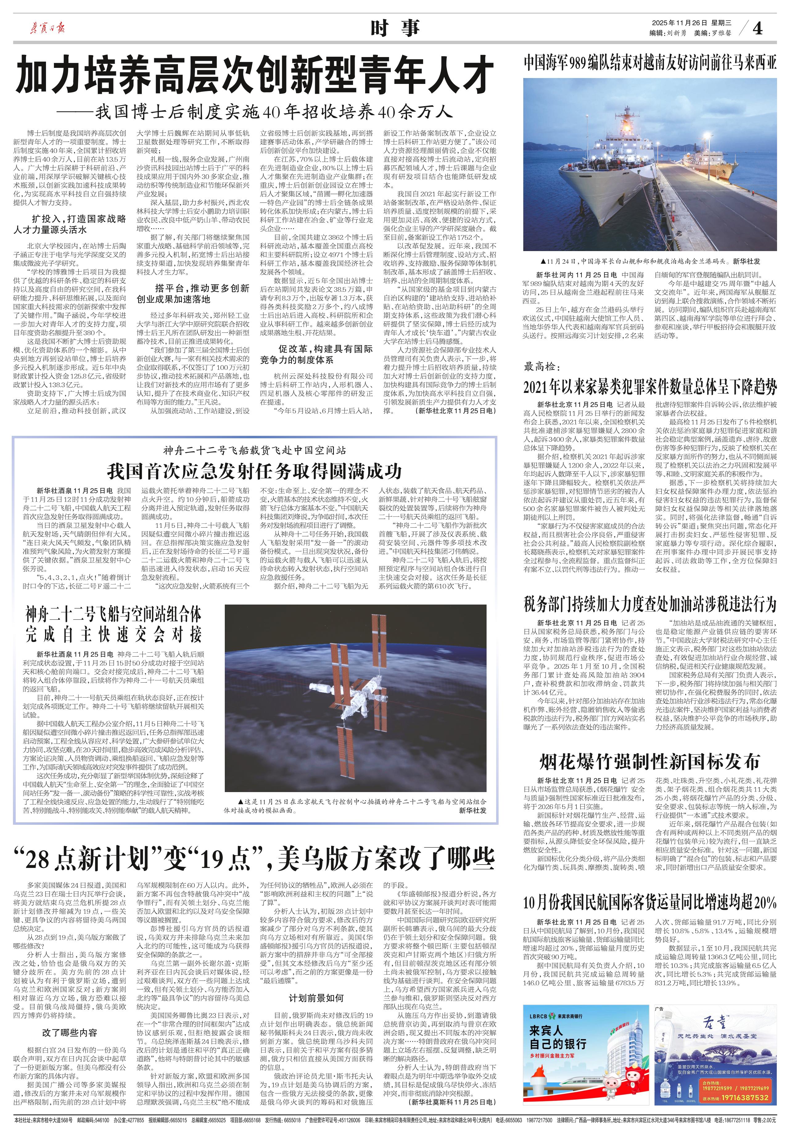 <div style='font-size: 22px!important;line-height: 34px!important;text-align: justify!important;color: #000!important'>中国海军989编队结束对越南友好访问前往马来西亚</div><div style='font-size: 14px!important;line-height: 22px!important;text-align: left!important;color: #777!important;margin-top: 20px;'>来宾日报  2025-11-26</div><div><img id='paperImg' style='max-width: 100%;height: auto' src='//img.founderfx.cn/epaper/202511/26/6bbf085aee0a46d98ba7c182ca6967ee/4.jpg' alt='' class='page-img'/></div><div style='font-size: 14px!important;line-height: 22px!important;text-align: center!important;color: #777!important;'><img src='//img.founderfx.cn/epaper/202511/26/6bbf085aee0a46d98ba7c182ca6967ee/04/093958-(4版)中国海军989编队结束对越南友好访问前往马来西亚—图片93955_s.jpg'style='display: block!important;margin: auto!important;max-width: 100%!important;'/> 11月24日,中国海军长白山舰和郑和舰夜泊越南金兰港码头。新华社发</div><p> 新华社河内11月25日电 中国海军989编队结束对越南为期4天的友好访问,25日从越南金兰港起程前往马来西亚。</p><p> 25日上午,越方在金兰港码头举行欢送仪式,中国驻越南大使馆工作人员、当地华侨华人代表和越南海军官兵到码头送行。按照远海实习计划安排,2名来自缅甸的军官登舰随编队出航同训。</p><p> 今年是中越建交75周年暨“中越人文交流年”。近年来,两国海军从舰艇互访到海上联合搜救演练,合作领域不断拓展。访问期间,编队组织官兵赴越南海军第四区、越南海军学院等单位进行拜会、参观和座谈,举行甲板招待会和舰艇开放活动等。</p>