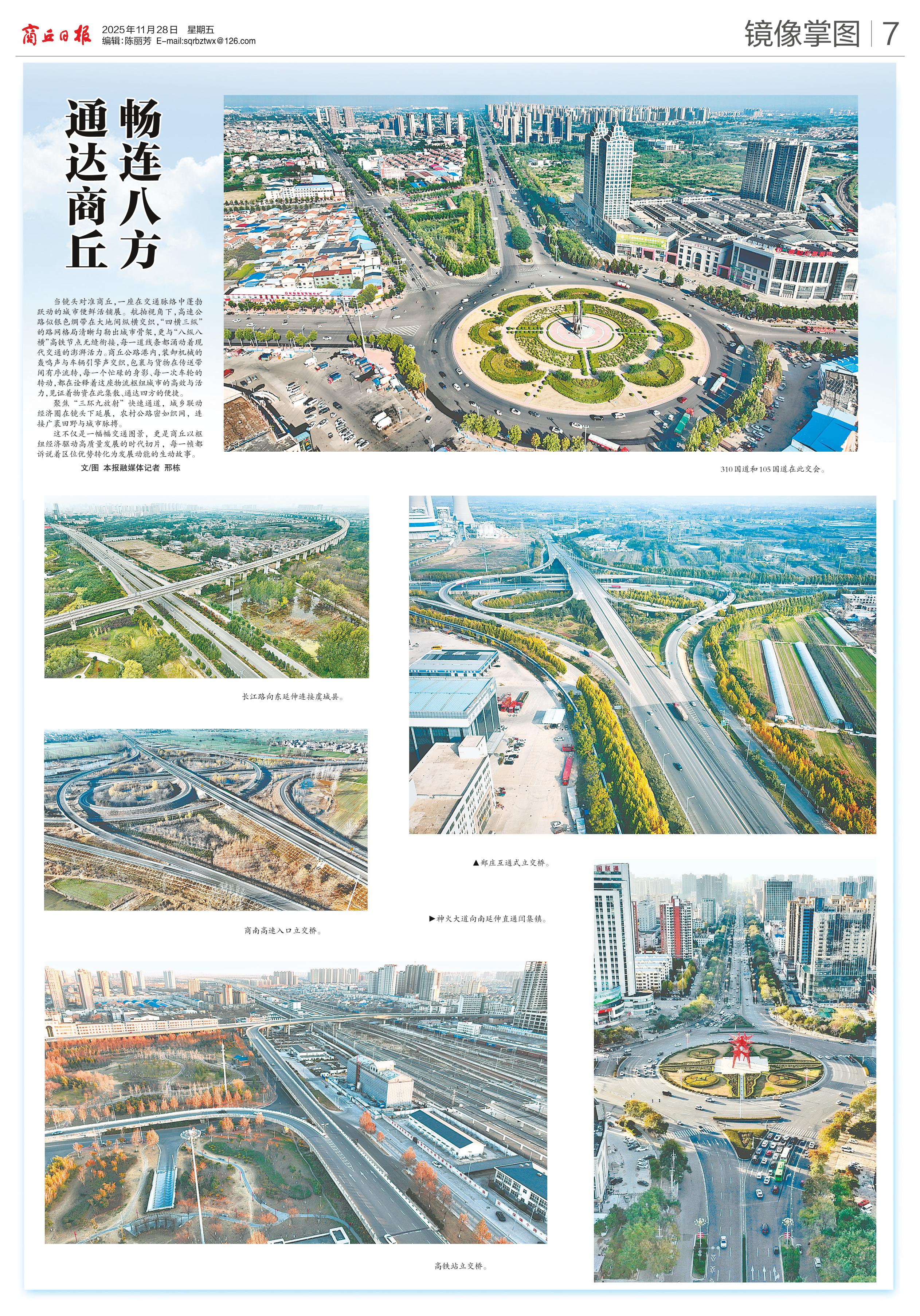 <div style='font-size: 22px!important;line-height: 34px!important;text-align: justify!important;color: #000!important'>通达商丘 畅连八方</div><div style='font-size: 14px!important;line-height: 22px!important;text-align: left!important;color: #777!important;margin-top: 20px;'>商丘日报云阅读  文/图 本报融媒体记者 邢栋  2025-11-28</div><div><img id='paperImg' style='max-width: 100%;height: auto' src='//img.founderfx.cn/epaper/202511/28/aaf66e2f77d64c019f1a0d677c330698/7.jpg' alt='' class='page-img'/></div><div style='font-size: 14px!important;line-height: 22px!important;text-align: center!important;color: #777!important;'><img src='//img.founderfx.cn/epaper/202511/28/aaf66e2f77d64c019f1a0d677c330698/07/1128_7a_s.jpg'style='display: block!important;margin: auto!important;max-width: 100%!important;'/> 310国道和105国道在此交会。<img src='//img.founderfx.cn/epaper/202511/28/aaf66e2f77d64c019f1a0d677c330698/07/1128_7h_s.jpg'style='display: block!important;margin: auto!important;max-width: 100%!important;'/> 长江路向东延伸连接虞城县。<img src='//img.founderfx.cn/epaper/202511/28/aaf66e2f77d64c019f1a0d677c330698/07/1128_7i_s.jpg'style='display: block!important;margin: auto!important;max-width: 100%!important;'/> ▲郑庄互通式立交桥。<img src='//img.founderfx.cn/epaper/202511/28/aaf66e2f77d64c019f1a0d677c330698/07/1128_7f_s.jpg'style='display: block!important;margin: auto!important;max-width: 100%!important;'/> 商南高速入口立交桥。<img src='//img.founderfx.cn/epaper/202511/28/aaf66e2f77d64c019f1a0d677c330698/07/1128_7c_s.jpg'style='display: block!important;margin: auto!important;max-width: 100%!important;'/> 高铁站立交桥。<img src='//img.founderfx.cn/epaper/202511/28/aaf66e2f77d64c019f1a0d677c330698/07/1128_7g_s.jpg'style='display: block!important;margin: auto!important;max-width: 100%!important;'/> ▶神火大道向南延伸直通闫集镇。</div><p> 当镜头对准商丘,一座在交通脉络中蓬勃跃动的城市便鲜活铺展。航拍视角下,高速公路似银色绸带在大地间纵横交织,“四横三纵”的路网格局清晰勾勒出城市骨架,更与“八纵八横”高铁节点无缝衔接,每一道线条都涌动着现代交通的澎湃活力。商丘公路港内,装卸机械的轰鸣声与车辆引擎声交织,包裹与货物在传送带间有序流转,每一个忙碌的身影、每一次车轮的转动,都在诠释着这座物流枢纽城市的高效与活力,见证着物资在此集散、通达四方的便捷。</p><p> 聚焦“三环九放射”快速通道,城乡联动经济圈在镜头下延展,农村公路密如织网,连接广袤田野与城市脉搏。</p><p> 这不仅是一幅幅交通图景,更是商丘以枢纽经济驱动高质量发展的时代切片,每一帧都诉说着区位优势转化为发展动能的生动故事。</p>