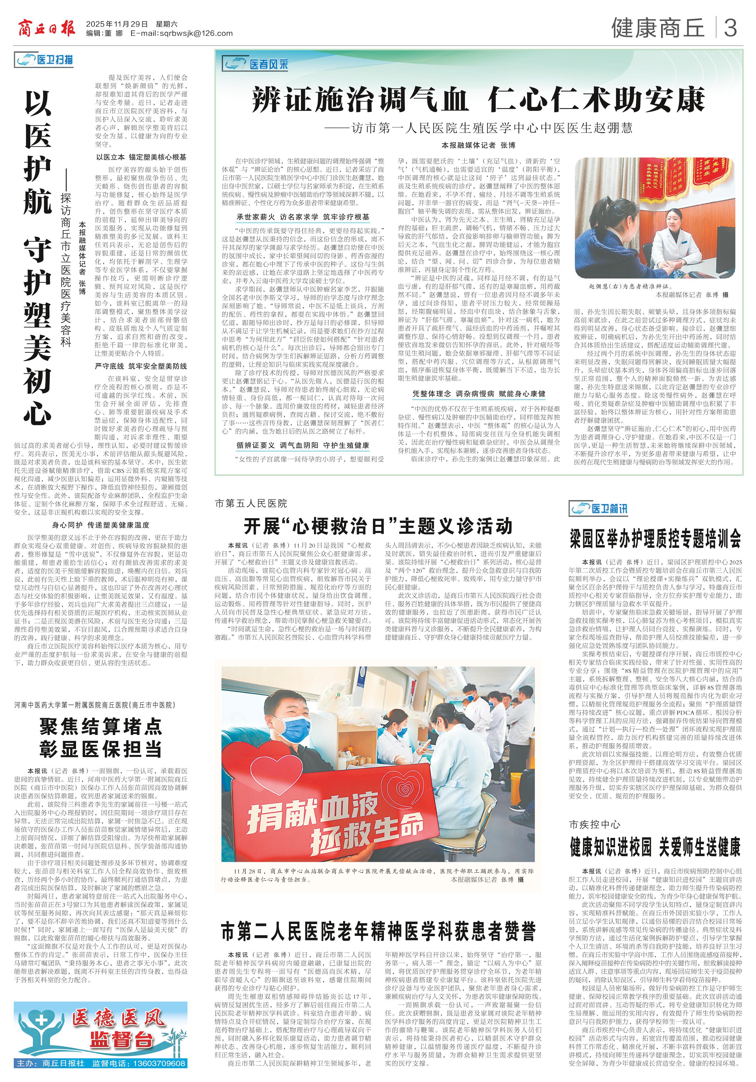 <div style='font-size: 22px!important;line-height: 34px!important;text-align: justify!important;color: #000!important'>市第二人民医院老年精神医学科获患者赞誉</div><div style='font-size: 14px!important;line-height: 22px!important;text-align: left!important;color: #777!important;margin-top: 20px;'>商丘日报云阅读  记者 张博  2025-11-29</div><div><img id='paperImg' style='max-width: 100%;height: auto' src='//img.founderfx.cn/epaper/202511/29/26394074fd004abf8f9b9f571c7a4207/3.jpg' alt='' class='page-img'/></div><p> 近日,商丘市第二人民医院老年精神医学科病房内暖意融融,已康复出院的患者周先生专程将一面写有“医德高尚医术精,尽职尽责暖人心”的锦旗送至该科室,感谢住院期间获得的专业诊疗与贴心照护。</p><p> 周先生罹患双相情感障碍伴结肠炎长达17年,病情反复困扰生活,经多方了解后前往商丘市第二人民医院老年精神医学科就诊。科室结合患者年龄、病情特点及合并症情况,量身定制综合治疗方案,在规范药物治疗基础上,搭配物理治疗与心理疏导双向干预,同时融入多样化娱乐康复活动,助力患者调节精神状态、改善身心机能,逐步恢复生活能力,顺利回归正常生活,融入社会。</p><p> 商丘市第二人民医院深耕精神卫生领域多年,老年精神医学科自开诊以来,始终坚守“治疗第一,服务第一,病人第一”理念,锚定“以病人为中心”原则,将优质医疗护理服务贯穿诊疗全环节,为老年精神疾病患者搭建专业康复平台。该科室依托医院先进诊疗设备与专业医护团队,聚焦老年患者身心需求,兼顾疾病治疗与人文关怀,为患者筑牢健康保障防线。</p><p> 一面锦旗承载一份认可,一声致谢凝聚一份信任。此次获赠锦旗,既是患者及家属对该院老年精神医学科诊疗服务的高度肯定,更是对医院精神卫生工作的激励与鞭策。该院老年精神医学科医务人员们表示,将持续秉持医者初心,以精湛医术守护群众精神健康,以温情服务传递医疗温度,不断提升诊疗水平与服务质量,为群众精神卫生需求提供更坚实的医疗支撑。</p>
