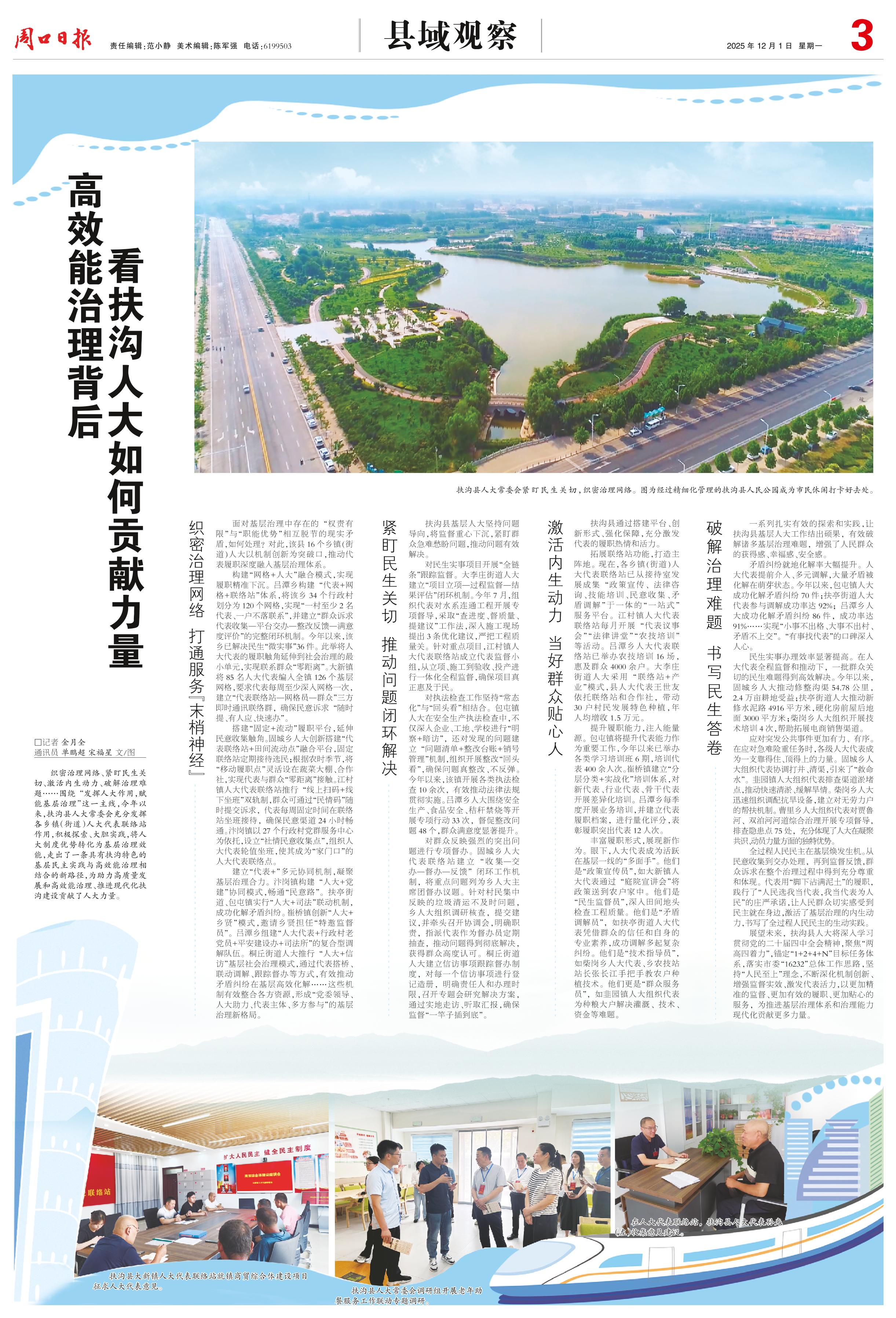 <div style='font-size: 22px!important;line-height: 34px!important;text-align: justify!important;color: #000!important'>高效能治理背后 看扶沟人大如何贡献力量</div><div style='font-size: 14px!important;line-height: 22px!important;text-align: left!important;color: #777!important;margin-top: 20px;'>周口日报  2025-12-01</div><div><img id='paperImg' style='max-width: 100%;height: auto' src='//img.founderfx.cn/epaper/202511/30/d890bf46fdb64da6849321fa497e27a9/3.jpg' alt='' class='page-img'/></div><div style='font-size: 14px!important;line-height: 22px!important;text-align: center!important;color: #777!important;'><img src='//img.founderfx.cn/epaper/202511/30/d890bf46fdb64da6849321fa497e27a9/03/31c4568774a5ff6052b4f1d99a177cfd_1_s.jpg'style='display: block!important;margin: auto!important;max-width: 100%!important;'/> 扶沟县人大常委会紧盯民生关切,织密治理网络。图为经过精细化管理的扶沟县人民公园成为市民休闲打卡好去处。</div><p> □记者 金月全 </p><p> 通讯员 单鹏超 宋福星 文/图</p><p> 织密治理网络、紧盯民生关切、激活内生动力、破解治理难题……围绕“发挥人大作用,赋能基层治理”这一主线,今年以来,扶沟县人大常委会充分发挥各乡镇(街道)人大代表联络站作用,积极探索、大胆实践,将人大制度优势转化为基层治理效能,走出了一条具有扶沟特色的基层民主实践与高效能治理相结合的新路径,为助力高质量发展和高效能治理、推进现代化扶沟建设贡献了人大力量。</p><p> 织密治理网络 打通服务『末梢神经』</p><p> 面对基层治理中存在的“权责有限”与“职能优势”相互脱节的现实矛盾,如何处理?对此,该县16个乡镇(街道)人大以机制创新为突破口,推动代表履职深度融入基层治理体系。</p><p> 构建“网格+人大”融合模式,实现履职精准下沉。吕潭乡构建“代表+网格+联络站”体系,将该乡34个行政村划分为120个网格,实现“一村至少2名代表、一户不落联系”,并建立“群众诉求代表收集—平台交办—整改反馈—满意度评价”的完整闭环机制。今年以来,该乡已解决民生“微实事”36件。此举将人大代表的履职触角延伸到社会治理的最小单元,实现联系群众“零距离”。大新镇将85名人大代表编入全镇126个基层网格,要求代表每周至少深入网格一次,建立“代表联络站—网格员—群众”三方即时通讯联络群,确保民意诉求“随时提、有人应、快速办”。</p><p> 搭建“固定+流动”履职平台,延伸民意收集触角。固城乡人大创新搭建“代表联络站+田间流动点”融合平台,固定联络站定期接待选民;根据农时季节,将“移动履职点”灵活设在蔬菜大棚、合作社,实现代表与群众“零距离”接触。江村镇人大代表联络站推行“线上扫码+线下坐班”双轨制,群众可通过“民情码”随时提交诉求,代表每周固定时间在联络站坐班接待,确保民意渠道24小时畅通。汴岗镇以27个行政村党群服务中心为依托,设立“社情民意收集点”,组织人大代表轮值坐班,使其成为“家门口”的人大代表联络点。</p><p> 建立“代表+”多元协同机制,凝聚基层治理合力。汴岗镇构建“人大+党建”协同模式,畅通“民意路”。扶亭街道、包屯镇实行“人大+司法”联动机制,成功化解矛盾纠纷。崔桥镇创新“人大+乡贤”模式,邀请乡贤担任“特邀监督员”。吕潭乡组建“人大代表+行政村老党员+平安建设办+司法所”的复合型调解队伍。桐丘街道人大推行“人大+信访”基层社会治理模式,通过代表搭桥、联动调解、跟踪督办等方式,有效推动矛盾纠纷在基层高效化解……这些机制有效整合各方资源,形成“党委领导、人大助力、代表主体、多方参与”的基层治理新格局。</p><p> 紧盯民生关切 推动问题闭环解决</p><p> 扶沟县基层人大坚持问题导向,将监督重心下沉,紧盯群众急难愁盼问题,推动问题有效解决。</p><p> 对民生实事项目开展“全链条”跟踪监督。大李庄街道人大建立“项目立项—过程监督—结果评估”闭环机制。今年7月,组织代表对水系连通工程开展专项督导,采取“查进度、督质量、提建议”工作法,深入施工现场提出3条优化建议,严把工程质量关。针对重点项目,江村镇人大代表联络站成立代表监督小组,从立项、施工到验收、投产进行一体化全程监督,确保项目真正惠及于民。</p><p> 对执法检查工作坚持“常态化”与“回头看”相结合。包屯镇人大在安全生产执法检查中,不仅深入企业、工地、学校进行“明察+暗访”,还对发现的问题建立“问题清单+整改台账+销号管理”机制,组织开展整改“回头看”,确保问题真整改、不反弹。今年以来,该镇开展各类执法检查10余次,有效推动法律法规贯彻实施。吕潭乡人大围绕安全生产、食品安全、秸秆禁烧等开展专项行动33次,督促整改问题48个,群众满意度显著提升。</p><p> 对群众反映强烈的突出问题进行专项督办。固城乡人大代表联络站建立“收集—交办—督办—反馈”闭环工作机制,将重点问题列为乡人大主席团督办议题。针对村民集中反映的垃圾清运不及时问题,乡人大组织调研核查,提交建议,并牵头召开协调会,明确职责,指派代表作为督办员定期抽查,推动问题得到彻底解决,获得群众高度认可。桐丘街道人大建立信访事项跟踪督办制度,对每一个信访事项进行登记造册,明确责任人和办理时限,召开专题会研究解决方案,通过实地走访、听取汇报,确保监督“一竿子插到底”。</p><p> 激活