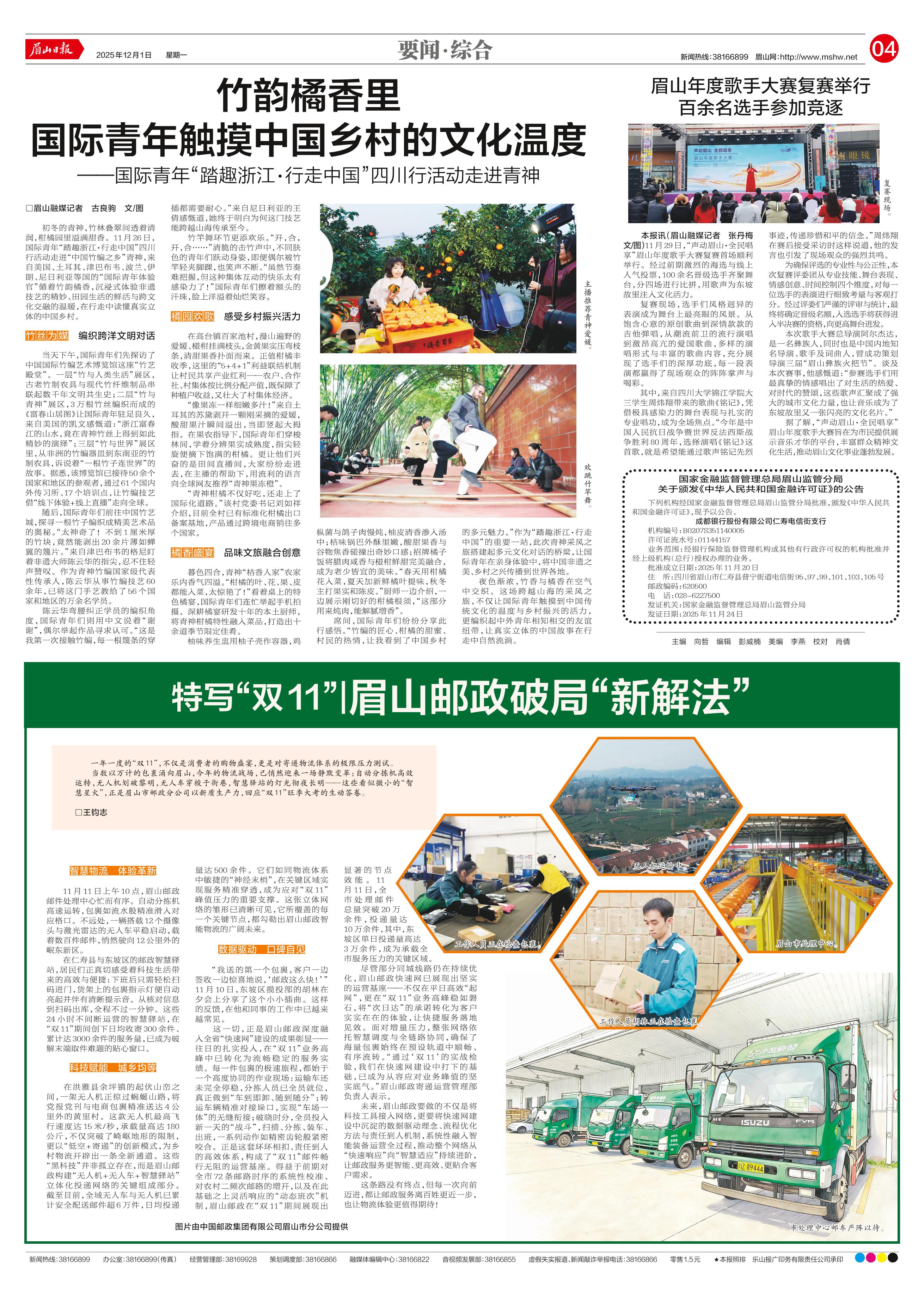 <div style='font-size: 22px!important;line-height: 34px!important;text-align: justify!important;color: #000!important'>眉山年度歌手大赛复赛举行 百余名选手参加竞逐</div><div style='font-size: 14px!important;line-height: 22px!important;text-align: left!important;color: #777!important;margin-top: 20px;'>眉山日报  2025-12-01</div><div><img id='paperImg' style='max-width: 100%;height: auto' src='//img.founderfx.cn/epaper/202512/01/2d09e491cb434b23b0c50b4f51ad1e85/3.jpg' alt='' class='page-img'/></div><div style='font-size: 14px!important;line-height: 22px!important;text-align: center!important;color: #777!important;'><img src='//img.founderfx.cn/epaper/202512/01/2d09e491cb434b23b0c50b4f51ad1e85/04/251201b-9_s.jpg'style='display: block!important;margin: auto!important;max-width: 100%!important;'/> 复赛现场。</div><p> 本报讯(眉山融媒记者 张丹梅 文/图)11月29日,“声动眉山·全民唱享”眉山年度歌手大赛复赛首场顺利举行。经过前期激烈的海选与线上人气投票,100余名晋级选手齐聚舞台,分四场进行比拼,用歌声为东坡故里注入文化活力。</p><p> 复赛现场,选手们风格迥异的表演成为舞台上最亮眼的风景。从饱含心意的原创歌曲到深情款款的吉他弹唱,从潮流前卫的流行演唱到激昂高亢的爱国歌曲,多样的演唱形式与丰富的歌曲内容,充分展现了选手们的深厚功底,每一段表演都赢得了现场观众的阵阵掌声与喝彩。</p><p> 其中,来自四川大学锦江学院大三学生周炜翔带来的歌曲《铭记》,凭借极具感染力的舞台表现与扎实的专业唱功,成为全场焦点。“今年是中国人民抗日战争暨世界反法西斯战争胜利80周年,选择演唱《铭记》这首歌,就是希望能通过歌声铭记先烈事迹,传递珍惜和平的信念。”周炜翔在赛后接受采访时这样说道,他的发言也引发了现场观众的强烈共鸣。</p><p> 为确保评选的专业性与公正性,本次复赛评委团从专业技能、舞台表现、情感创意、时间控制四个维度,对每一位选手的表演进行细致考量与客观打分。经过评委们严谨的评审与统计,最终将确定晋级名额,入选选手将获得进入半决赛的资格,向更高舞台进发。</p><p> 本次歌手大赛总导演阿尔杰达,是一名彝族人,同时也是中国内地知名导演、歌手及词曲人,曾成功策划导演三届“眉山彝族火把节”。谈及本次赛事,他感慨道:“参赛选手们用最真挚的情感唱出了对生活的热爱、对时代的赞颂,这些歌声汇聚成了强大的城市文化力量,也让音乐成为了东坡故里又一张闪亮的文化名片。”</p><p> 据了解,“声动眉山·全民唱享”眉山年度歌手大赛旨在为市民提供展示音乐才华的平台,丰富群众精神文化生活,推动眉山文化事业蓬勃发展。</p>