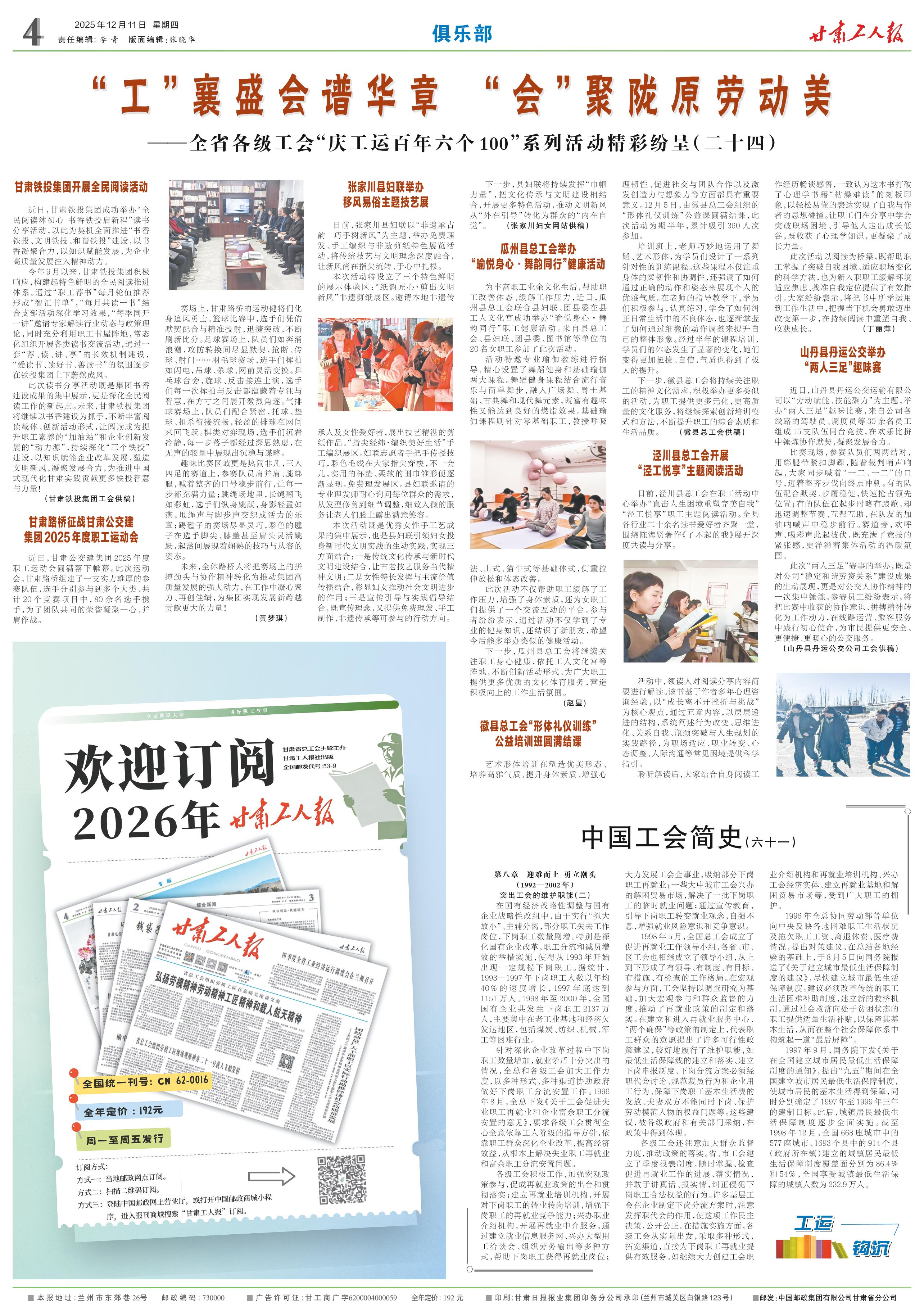 <div style='font-size: 22px!important;line-height: 34px!important;text-align: justify!important;color: #000!important'>“工”襄盛会谱华章 “会”聚陇原劳动美</div><div style='font-size: 16px!important;line-height: 28px!important;text-align: justify;color: #777!important;margin-top: 20px;'>——全省各级工会“庆工运百年六个100”系列活动精彩纷呈(二十四)</div><div style='font-size: 14px!important;line-height: 22px!important;text-align: left!important;color: #777!important;margin-top: 20px;'>甘肃工人报  2025-12-11</div><div><img id='paperImg' style='max-width: 100%;height: auto' src='//img.founderfx.cn/epaper/202512/15/17e555f3c2f64928afae1d4c78830997/4.jpg' alt='' class='page-img'/></div><div style='font-size: 14px!important;line-height: 22px!important;text-align: center!important;color: #777!important;'><img src='//img.founderfx.cn/epaper/202512/15/17e555f3c2f64928afae1d4c78830997/4B/14523_4L_20251211_s.jpg'style='display: block!important;margin: auto!important;max-width: 100%!important;'/><img src='//img.founderfx.cn/epaper/202512/15/17e555f3c2f64928afae1d4c78830997/4B/14536_4L_20251211_s.jpg'style='display: block!important;margin: auto!important;max-width: 100%!important;'/><img src='//img.founderfx.cn/epaper/202512/15/17e555f3c2f64928afae1d4c78830997/4B/14529_4L_20251211_s.jpg'style='display: block!important;margin: auto!important;max-width: 100%!important;'/><img src='//img.founderfx.cn/epaper/202512/15/17e555f3c2f64928afae1d4c78830997/4B/14538_4L_20251211_s.jpg'style='display: block!important;margin: auto!important;max-width: 100%!important;'/><img src='//img.founderfx.cn/epaper/202512/15/17e555f3c2f64928afae1d4c78830997/4B/14337_4L_20251211_s.jpg'style='display: block!important;margin: auto!important;max-width: 100%!important;'/></div><p>甘肃铁投集团开展全民阅读活动</p><p>近日,甘肃铁投集团成功举办“全民阅读沐初心 书香铁投启新程”读书分享活动,以此为契机全面推进“书香铁投、文明铁投、和谐铁投”建设,以书香凝聚合力,以知识赋能发展,为企业高质量发展注入精神动力。</p><p>今年9月以来,甘肃铁投集团积极响应,构建起特色鲜明的全民阅读推进体系。通过“职工荐书”每月轮值推荐形成“智汇书单”,“每月共读一书”结合支部活动深化学习效果,“每季同开一讲”邀请专家解读行业动态与政策理论,同时充分利用职工书屋阵地,常态化组织开展各类读书交流活动,通过一套“荐、读、讲、享”的长效机制建设,“爱读书、读好书、善读书”的氛围逐步在铁投集团上下蔚然成风。</p><p>此次读书分享活动既是集团书香建设成果的集中展示,更是深化全民阅读工作的新起点。未来,甘肃铁投集团将继续以书香建设为抓手,不断丰富阅读载体、创新活动形式,让阅读成为提升职工素养的“加油站”和企业创新发展的“动力源”,持续深化“三个铁投”建设,以知识赋能企业改革发展,塑造文明新风,凝聚发展合力,为推进中国式现代化甘肃实践贡献更多铁投智慧与力量!</p><p> (甘肃铁投集团工会供稿)</p><p>甘肃路桥征战甘肃公交建</p><p>集团2025年度职工运动会</p><p>近日,甘肃公交建集团2025年度职工运动会圆满落下帷幕。此次运动会,甘肃路桥组建了一支实力雄厚的参赛队伍,选手分别参与到多个大类、共计20个竞赛项目中,80余名选手携手,为了团队共同的荣誉凝聚一心、并肩作战。</p><p>赛场上,甘肃路桥的运动健将们化身追风勇士。篮球比赛中,选手们凭借默契配合与精准投射,迅捷突破,不断刷新比分。足球赛场上,队员们如奔涌浪潮,攻防转换间尽显默契,抢断、传球、射门……羽毛球赛场,选手们挥拍如闪电,吊球、杀球、网前灵活变换。乒乓球台旁,旋球、反击接连上演,选手们每一次挥拍与反击都蕴藏着专注与智慧,在方寸之间展开激烈角逐。气排球赛场上,队员们配合紧密,托球、垫球、扣杀衔接流畅,轻盈的排球在网间来回飞跃。棋类对弈现场,选手们沉着冷静,每一步落子都经过深思熟虑,在无声的较量中展现出沉稳与谋略。</p><p>趣味比赛区域更是热闹非凡,三人四足的赛道上,参赛队员肩并肩、腿绑腿,喊着整齐的口号稳步前行,让每一步都充满力量;跳绳场地里,长绳翻飞如彩虹,选手们纵身跳跃,身影轻盈如燕,甩绳声与脚步声交织成活力的乐章;踢毽子的赛场尽显灵巧,彩色的毽子在选手脚尖、膝盖甚至肩头灵活跳跃,起落间展现着娴熟的技巧与从容的姿态。</p><p>未来,全体路桥人将把赛场上的拼搏劲头与协作精神转化为推动集团高质量发展的强大动力,在工作中凝心聚力、再创佳绩,为集团实现发展新跨越贡献更大的力量!</p><p> (黄梦琪)</p><p>张家川县妇联举办</p><p>移风易俗主题技艺展</p><p>日前,张家川县妇联以“非遗承古韵 巧手树新风”为主题,举办免费理发、手工编织与非遗剪纸特色展览活动,将传统技艺与文明理念深度融合,让新风尚在指尖流转、于心中扎根。</p><p>本次活动特设立了三个特色鲜明的展示体验区:“纸韵匠心·剪出文明新风”非遗剪纸展区。邀请本地非遗传承人及女性爱好者,展出技艺精湛的剪纸作品。“指尖经纬·编织美好生活”手工编织展区。妇联志愿者手把手传授技巧,彩色毛线在大家指尖穿梭,不一会儿,实用的杯垫、柔软的围巾雏形便逐渐显现。免费理发展区。县妇联邀请的专业理发师耐心询问每位群众的需求,从发型修剪到细节调整,细致入微的服务让老人们脸上露出满意笑容。</p><p>本次活动既是优秀女性手工艺成果的集中展示,也是县妇联引领妇女投身新时代