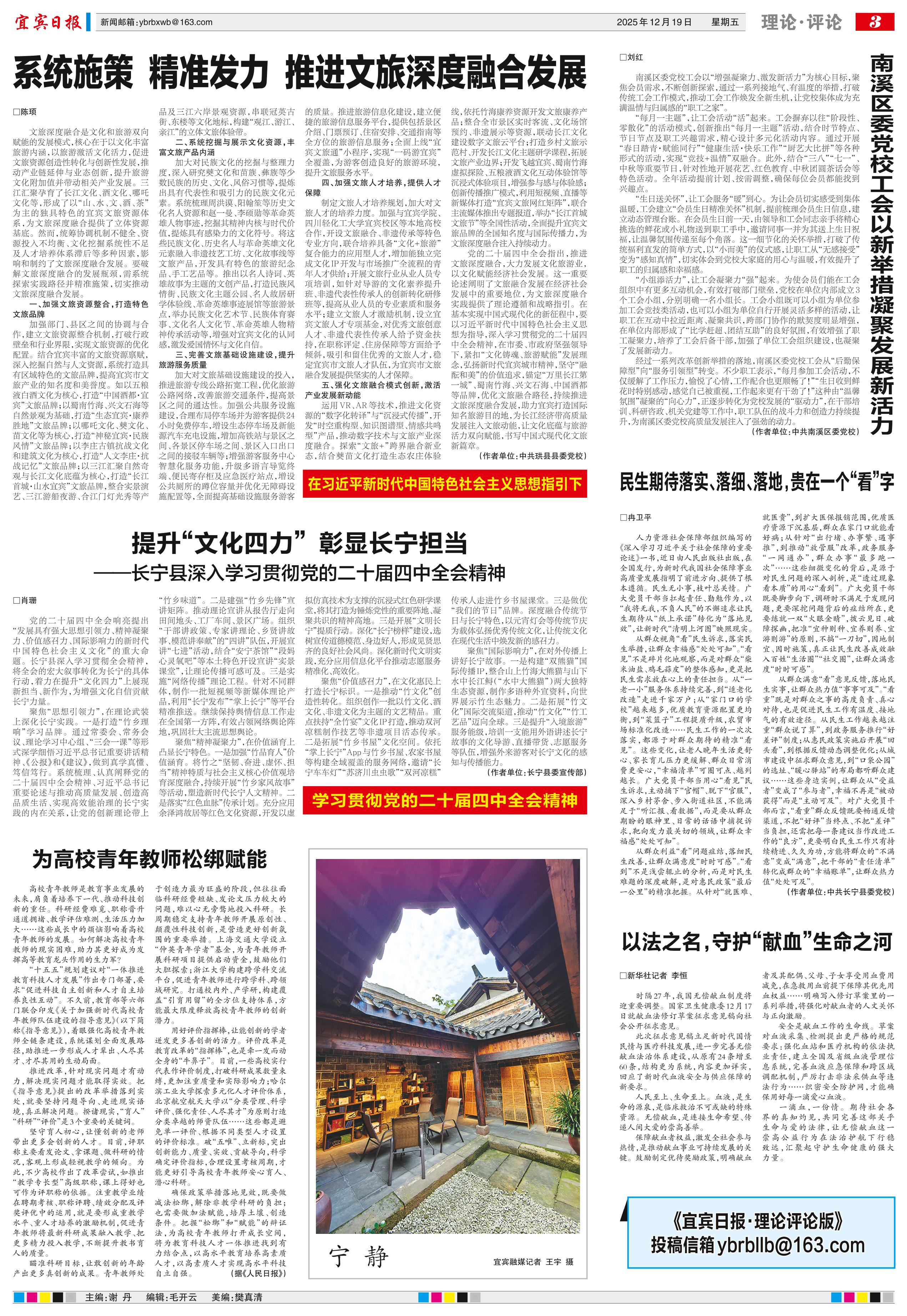 <div style='font-size: 22px!important;line-height: 34px!important;text-align: justify!important;color: #000!important'>系统施策 精准发力 推进文旅深度融合发展</div><div style='font-size: 14px!important;line-height: 22px!important;text-align: left!important;color: #777!important;margin-top: 20px;'>宜宾日报  2025-12-19</div><div><img id='paperImg' style='max-width: 100%;height: auto' src='//img.founderfx.cn/epaper/202512/19/c19006b088034e0ba535211b1a91aecc/3.jpg' alt='' class='page-img'/></div><p> □陈顼</p><p> 文旅深度融合是文化和旅游双向赋能的发展模式,核心在于以文化丰富旅游内涵,以旅游激活文化活力,促进文旅资源创造性转化与创新性发展,推动产业链延伸与业态创新,提升旅游文化附加值并带动相关产业发展。三江汇聚孕育了长江文化、酒文化、哪吒文化等,形成了以“山、水、文、酒、茶”为主的独具特色的宜宾文旅资源体系,为文旅深度融合提供了立体资源基底。然而,统筹协调机制不健全、资源投入不均衡、文化挖掘系统性不足及人才培养体系滞后等多种因素,影响和制约了文旅深度融合发展。要破解文旅深度融合的发展瓶颈,需系统探索实践路径并精准施策,切实推动文旅深度融合发展。</p><p> 一、加强文旅资源整合,打造特色文旅品牌</p><p> 加强部门、县区之间的协调与合作,建立文旅资源整合机制,打破行政壁垒和行业界限,实现文旅资源的优化配置。结合宜宾丰富的文旅资源禀赋,深入挖掘自然与人文资源,系统打造具有区域特色的文旅品牌,提高宜宾市文旅产业的知名度和美誉度。如以五粮液白酒文化为核心,打造“中国酒都·宜宾”文旅品牌;以蜀南竹海、兴文石海等自然景观为基础,打造“生态宜宾·康养胜地”文旅品牌;以哪吒文化、僰文化、苗文化等为核心,打造“神秘宜宾·民族风情”文旅品牌;以李庄古镇抗战文化和建筑文化为核心,打造“人文李庄·抗战记忆”文旅品牌;以三江汇聚自然奇观与长江文化底蕴为核心,打造“长江首城·山水宜宾”文旅品牌,整合实景演艺、三江游船夜游、合江门灯光秀等产品及三江六岸景观资源,串联冠英古街、东楼等文化地标,构建“观江、游江、亲江”的立体文旅体验带。</p><p> 二、系统挖掘与展示文化资源,丰富文旅产品内涵</p><p> 加大对民族文化的挖掘与整理力度,深入研究僰文化和苗族、彝族等少数民族的历史、文化、风俗习惯等,提炼出具有代表性和吸引力的民族文化元素。系统梳理周洪谟、阳翰笙等历史文化名人资源和赵一曼、李硕勋等革命英雄人物事迹,挖掘其精神内核与时代价值,提炼具有感染力的文化符号。将这些民族文化、历史名人与革命英雄文化元素融入非遗技艺工坊、文化故事线等文旅产品,开发具有特色的旅游纪念品、手工艺品等。推出以名人诗词、英雄故事为主题的文创产品,打造民族风情街、民族文化主题公园、名人故居研学体验线、革命英雄事迹展馆等旅游景点,举办民族文化艺术节、民族体育赛事、文化名人文化节、革命英雄人物精神传承活动等,增强对宜宾文化的认同感,激发爱国情怀与文化自信。</p><p> 三、完善文旅基础设施建设,提升旅游服务质量</p><p> 加大对文旅基础设施建设的投入,推进旅游专线公路拓宽工程,优化旅游公路网络,改善旅游交通条件,提高景区之间的通达性。加强公共服务设施建设,合理布局停车场并为游客提供24小时免费停车,增设生态停车场及新能源汽车充电设施,增加高铁站与景区之间、各景区停车场之间、景区入口出口之间的接驳车辆等;增强游客服务中心智慧化服务功能,升级多语言导览终端、便民寄存柜及应急医疗站点,增设公共厕所的蹲位容量并优化无障碍设施配置等,全面提高基础设施服务游客的质量。推进旅游信息化建设,建立便捷的旅游信息服务平台,提供包括景区介绍、门票预订、住宿安排、交通指南等全方位的旅游信息服务;全面上线“宜宾文旅通”小程序,实现“一码游宜宾”全覆盖,为游客创造良好的旅游环境,提升文旅服务水平。</p><p> 四、加强文旅人才培养,提供人才保障</p><p> 制定文旅人才培养规划,加大对文旅人才的培养力度。加强与宜宾学院、四川轻化工大学宜宾校区等本地高校合作,开设文旅融合、非遗传承等特色专业方向,联合培养具备“文化+旅游”复合能力的应用型人才,增加能独立完成文化IP开发与市场推广全流程的青年人才供给;开展文旅行业从业人员专项培训,如针对导游的文化素养提升班、非遗代表性传承人的创新转化研修班等,提高从业人员的专业素质和服务水平;建立文旅人才激励机制,设立宜宾文旅人才专项基金,对优秀文旅创意人才、非遗代表性传承人给予资金扶持,在职称评定、住房保障等方面给予倾斜,吸引和留住优秀的文旅人才,稳定宜宾市文旅人才队伍,为宜宾市文旅融合发展提供坚实的人才保障。</p><p> 五、强化文旅融合模式创新,激活产业发展新动能</p><p> 运用VR、AR等技术,推进文化资源的“数字化转译”与“沉浸式传播”,开发“时空重构型、知识图谱型、情感共鸣型”产品,推动数字技术与文旅产业深度融合。探索“文旅+”跨界融合新业态,结合僰苗文化打造生态农庄体验线,依托竹海康养资源开发文旅康养产品;整合全市景区实时客流、文化场馆预约、非遗展示等资源,联动长江文化建设数字文旅云平台;打造乡村文旅示范村、开发长江文化主题研学