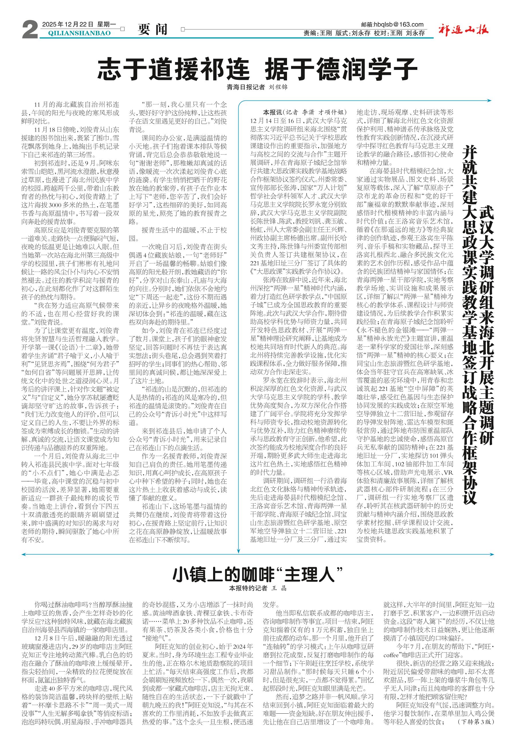 <div style='font-size: 22px!important;line-height: 34px!important;text-align: justify!important;color: #000!important'>小镇上的咖啡“主理人”</div><div style='font-size: 14px!important;line-height: 22px!important;text-align: left!important;color: #777!important;margin-top: 20px;'>祁连山报  2025-12-22</div><div><img id='paperImg' style='max-width: 100%;height: auto' src='//img.founderfx.cn/epaper/202512/22/1c25df0f04254afaa8d78aba849508eb/2.jpg' alt='' class='page-img'/></div><p> 本报特约记者 王 晶</p><p> 你喝过酥油咖啡吗?当醇厚酥油撞上咖啡豆的焦香,会产生怎样奇妙的化学反应?这种独特风味,就藏在海北藏族自治州海晏县西海镇的一家咖啡店里。</p><p> 12月8日午后,暖融融的阳光透过玻璃窗漫进店内,29岁的咖啡店主阿旺克知正专注地转动蒸汽棒。乳白色的奶泡在融合了酥油的咖啡液上缓缓晕开,指尖轻抬间,一朵精致的拉花便绽放在杯面,氤氲出独特香气。</p><p> 走进40多平方米的咖啡店,现代风格的装饰简洁温馨,砖块样的壁纸上贴着“一杯摩卡思路不卡”“周一美式一周没事”“人生无解多喝拿铁”等俏皮标语;泡泡玛特玩偶、明星海报、手冲咖啡器具的奇妙混搭,又为小店增添了一抹时尚感。黄油啤酒拿铁、青稞豆拿铁、卡布奇诺……菜单上20多种饮品不止咖啡,还有果茶、奶茶及各类小食,价格也十分“接地气”。</p><p> 阿旺克知的创业初心,始于2024年夏末。当时,身为环境生态工程专业毕业生的他,正在格尔木地质勘察院的项目上忙活。“每天结束高强度工作后,我都会刷刷短视频放松一下。偶然一次,我刷到成都一家藏式咖啡店,店主无拘无束、随性自在的生活状态,一下子就戳中了朝九晚五的我!”阿旺克知说,“与其在不喜欢的工作里消耗,不如放手去做真正热爱的事。”这个念头一旦生根,便迅速发芽。</p><p> 他当即私信联系成都的咖啡店主,咨询咖啡制作等事宜。项目一结束,阿旺克知揣着仅有的1万元积蓄,独自坐上前往成都的动车。那一个月里,他开启了“连轴转”的学习模式:上午从咖啡豆研磨到拉花成型,反复打磨咖啡制作的每一个细节;下午则赶往烹饪学校,系统学习甜品制作。“那时候每天只睡6个小时,但是很充实,一点都不觉得累。”回忆起那段时光,阿旺克知眼里满是光芒。</p><p> 然而,追梦之路并非一帆风顺。学习结束回到小镇,阿旺克知面临着最大的难题——资金短缺。好在朋友伸出援手,先让他在自己店里增设了一个咖啡角。就这样,大半年的时间里,阿旺克知一边打磨手艺、积累客户,一边积攒开店启动资金。这段“寄人篱下”的经历,不仅让他的咖啡制作技术日益娴熟,更让他逐渐摸清了小镇居民的口味偏好。</p><p> 今年7月,在朋友的帮助下,“阿旺·coffee”咖啡店正式开门迎客。</p><p> 很快,新店的经营之路又迎来挑战:附近居民偏爱带甜味的咖啡,却不太喜欢甜品,那一阵上架的爆浆牛角包等几乎无人问津;而且纯咖啡的客群也十分有限,怎样才能把顾客留住呢?</p><p> 阿旺克知没有气馁,迅速调整方向。他学习餐饮制作,在菜单里加入鸡公煲等年轻人喜爱的饮食;(下转第3版)</p>