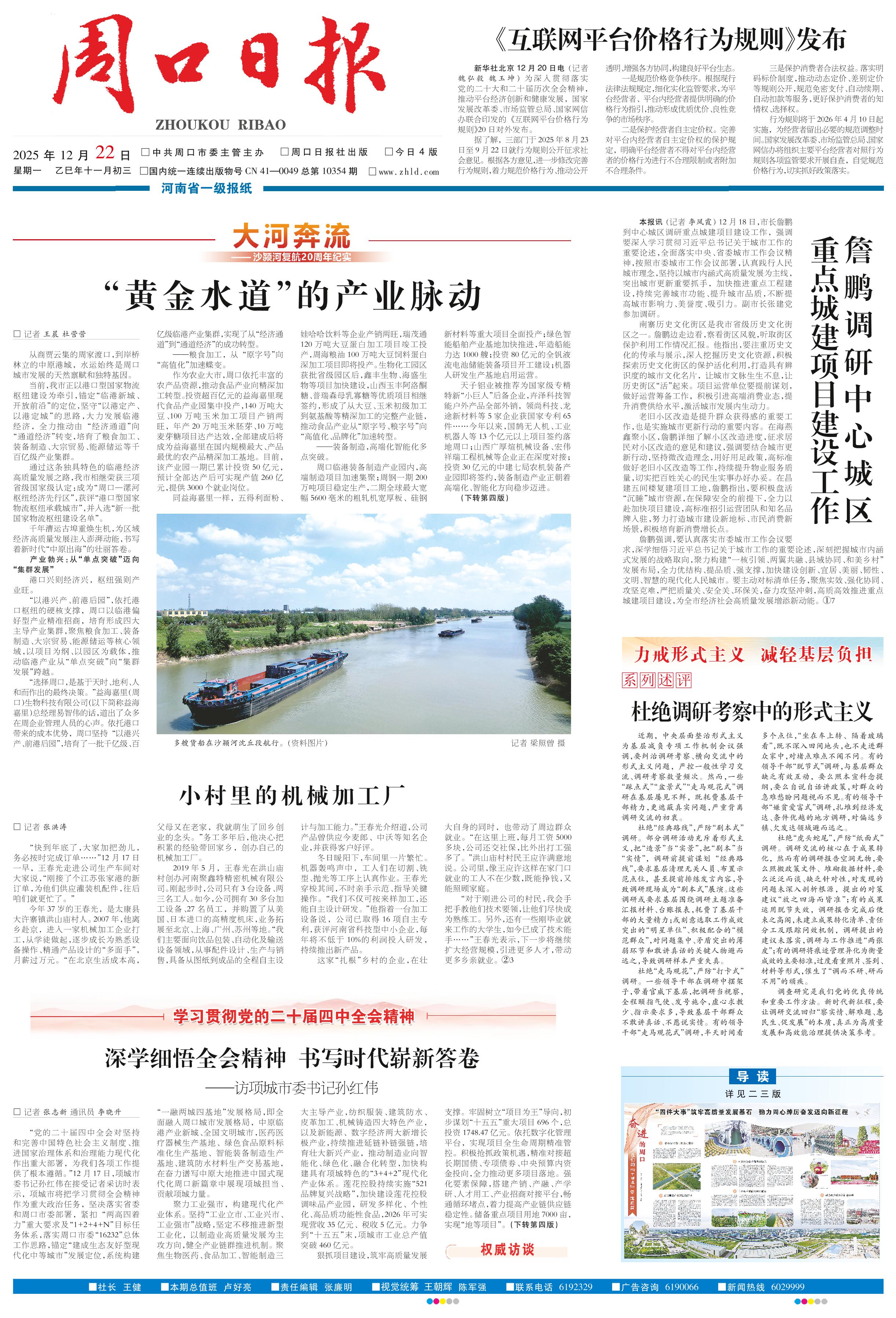 <div style='font-size: 22px!important;line-height: 34px!important;text-align: justify!important;color: #000!important'>詹鹏调研中心城区重点城建项目建设工作</div><div style='font-size: 14px!important;line-height: 22px!important;text-align: left!important;color: #777!important;margin-top: 20px;'>周口日报  2025-12-22</div><div><img id='paperImg' style='max-width: 100%;height: auto' src='//img.founderfx.cn/epaper/202512/22/5b7c0e0b39e74191bba0ad70cfebef95/1.jpg' alt='' class='page-img'/></div><p> 本报讯 (记者 李凤霞) 12月18日,市长詹鹏到中心城区调研重点城建项目建设工作,强调要深入学习贯彻习近平总书记关于城市工作的重要论述,全面落实中央、省委城市工作会议精神,按照市委城市工作会议部署,认真践行人民城市理念,坚持以城市内涵式高质量发展为主线,突出城市更新重要抓手,加快推进重点工程建设,持续完善城市功能、提升城市品质,不断提高城市影响力、美誉度、吸引力。副市长张建党参加调研。</p><p> 南寨历史文化街区是我市省级历史文化街区之一。詹鹏边走边看,察看街区风貌,听取街区保护利用工作情况汇报。他指出,要注重历史文化的传承与展示,深入挖掘历史文化资源,积极探索历史文化街区的保护活化利用,打造具有辨识度的城市文化名片,让城市文脉生生不息,让历史街区“活”起来。项目运营单位要提前谋划,做好运营筹备工作,积极引进高端消费业态,提升消费供给水平,激活城市发展内生动力。</p><p> 老旧小区改造是提升群众获得感的重要工作,也是实施城市更新行动的重要内容。在海燕鑫聚小区,詹鹏详细了解小区改造进度,征求居民对小区改造的意见和建议,强调要结合城市更新行动,坚持微改造理念,用好用足政策,高标准做好老旧小区改造等工作,持续提升物业服务质量,切实把百姓关心的民生实事办好办妥。在昌建五间楼复建项目工地,詹鹏指出,要积极盘活“沉睡”城市资源,在保障安全的前提下,全力以赴加快项目建设,高标准招引运营团队和知名品牌入驻,努力打造城市建设新地标、市民消费新场景,积极培育新消费增长点。</p><p> 詹鹏强调,要认真落实市委城市工作会议要求,深学细悟习近平总书记关于城市工作的重要论述,深刻把握城市内涵式发展的战略取向,聚力构建“一核引领、两翼共融、县域协同、和美乡村”发展布局,全力优结构、提品质、强支撑,加快建设创新、宜居、美丽、韧性、文明、智慧的现代化人民城市。要主动对标清单任务,聚焦实效、强化协同、攻坚克难,严把质量关、安全关、环保关,奋力攻坚冲刺,高质高效推进重点城建项目建设,为全市经济社会高质量发展增添新动能。①7</p>