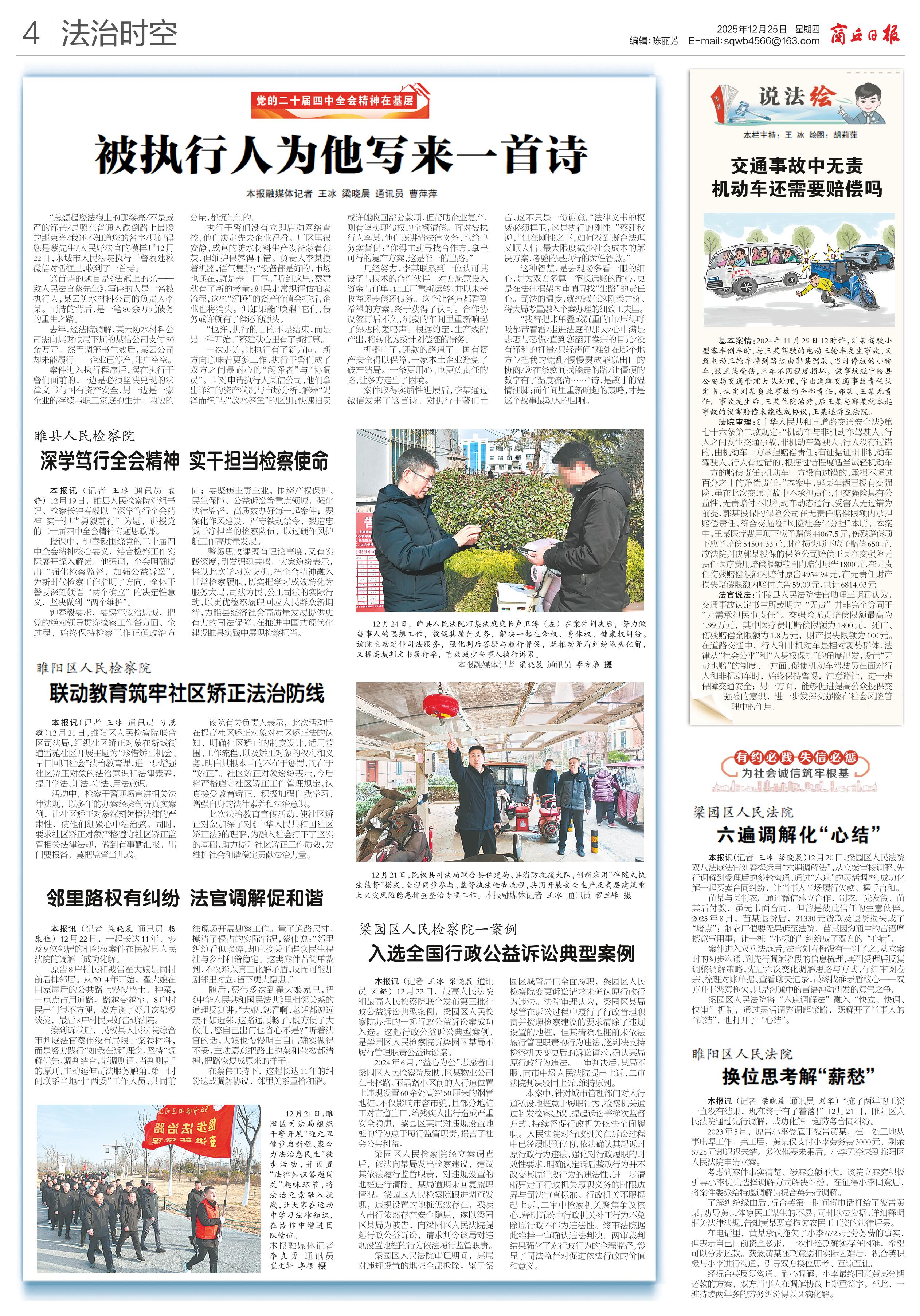 <div style='font-size: 22px!important;line-height: 34px!important;text-align: justify!important;color: #000!important'>图片新闻</div><div style='font-size: 14px!important;line-height: 22px!important;text-align: left!important;color: #777!important;margin-top: 20px;'>商丘日报云阅读  2025-12-25</div><div><img id='paperImg' style='max-width: 100%;height: auto' src='//img.founderfx.cn/epaper/202512/25/f1a0248560b04c9789458d5165da8abb/4.jpg' alt='' class='page-img'/></div><div style='font-size: 14px!important;line-height: 22px!important;text-align: center!important;color: #777!important;'><img src='//img.founderfx.cn/epaper/202512/25/f1a0248560b04c9789458d5165da8abb/04/1225_4g_s.jpg'style='display: block!important;margin: auto!important;max-width: 100%!important;'/> 12月24日,睢县人民法院河集法庭庭长卢卫涛(左)在案件判决后,努力做当事人的思想工作,敦促其履行义务,解决一起生命权、身体权、健康权纠纷。该院主动延伸司法服务,强化判后答疑与履行督促,既推动矛盾纠纷源头化解,又提高裁判文书履行率,有效减少当事人执行诉累。本报融媒体记者 梁晓晨 通讯员 李方弟 摄<img src='//img.founderfx.cn/epaper/202512/25/f1a0248560b04c9789458d5165da8abb/04/1225_4f_s.jpg'style='display: block!important;margin: auto!important;max-width: 100%!important;'/> 12月21日,民权县司法局联合县住建局、县消防救援大队,创新采用“伴随式执法监督”模式,全程同步参与、监督执法检查流程,共同开展安全生产及高层建筑重大火灾风险隐患排查整治专项工作。本报融媒体记者 王冰 通讯员 程兰峰 摄</div><p></p>