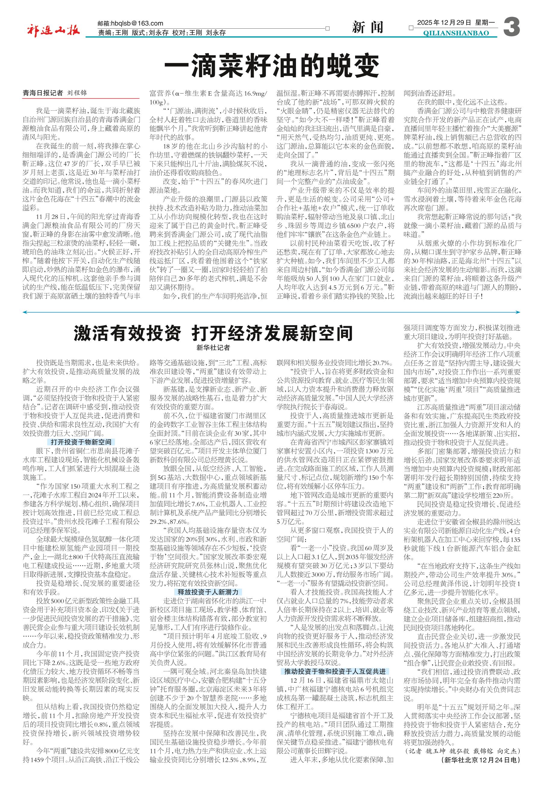 <div style='font-size: 22px!important;line-height: 34px!important;text-align: justify!important;color: #000!important'>一滴菜籽油的蜕变</div><div style='font-size: 14px!important;line-height: 22px!important;text-align: left!important;color: #777!important;margin-top: 20px;'>祁连山报  2025-12-29</div><div><img id='paperImg' style='max-width: 100%;height: auto' src='//img.founderfx.cn/epaper/202512/29/ea0326f7cae946abac37a039afcbb0ae/3.jpg' alt='' class='page-img'/></div><p> 青海日报记者 刘程锦</p><p> 我是一滴菜籽油,诞生于海北藏族自治州门源回族自治县的青海香满金门源粮油食品有限公司,身上藏着高原的清风与阳光。</p><p> 在我诞生的前一刻,将我捧在掌心细细端详的,是香满金门源公司的厂长靳正峰。这位47岁的厂长,双手早已被岁月刻上老茧,这是近30年与菜籽油打交道的印记。他常说,他也是一滴小菜籽油。而我知道,我们的命运,共同折射着这片金色花海在“十四五”春潮中的流金溢彩。</p><p> 11月28日,午间的阳光穿过青海香满金门源粮油食品有限公司的厂房天窗,靳正峰的身影在油雾中愈发清晰。他指尖捏起三粒滚烫的油菜籽,轻轻一碾,琥珀色的油珠立刻沁出。“火候正好,开榨。”随着他按下开关,自动化生产线随即启动,炒熟的油菜籽如金色的瀑布,涌入现代化的压榨机。这套他亲手参与调试的生产线,能在低温低压下,完美保留我们源于高原富硒土壤的独特香气与丰富营养(α-维生素E含量高达16.9mg/100g)。</p><p> “‘门源油,满街流’,小时候秋收后,全村人赶着牲口去油坊,巷道里的香味能飘半个月。”我常听到靳正峰讲起他青年时代的故事。</p><p> 18岁的他在北山乡沙沟脑村的小作坊里,守着燃煤的铁锅翻炒菜籽,一天下来只能榨出几十斤油,满脸煤灰不说,油价还得看收购商脸色。</p><p> 改变,始于“十四五”的春风吹进门源油菜地。</p><p> 产业升级的浪潮里,门源县以政策扶持、技术改造补贴为助力,推动油菜加工从小作坊向规模化转型,我也在这时迎来了属于自己的黄金时代。靳正峰受聘来到香满金门源公司,成了现代油脂加工线上把控品质的“关键先生”。当政府技改补贴引入的全自动高原冷榨生产线运抵厂区,我看着他围着这个“铁家伙”转了一圈又一圈,回家时轻轻拍了拍陪伴自己20多年的老式榨机,满是不舍却又满怀期待。</p><p> 如今,我们的生产车间明亮洁净,恒温恒湿。靳正峰不再需要赤膊挥汗,控制台成了他的新“战场”,可那双辨火候的“火眼金睛”,仍是精密仪器无法替代的坚守。“如今大不一样喽!”靳正峰看着金灿灿的我汩汩流出,语气里满是自豪,“用天然气,受热均匀,油质更纯、更亮。这门源油,总算能以它本来的金色面貌,走向全国了。”</p><p> 我从一滴普通的油,变成一张闪亮的“地理标志名片”,背后是“十四五”期间一个完整产业的“点油成金”。</p><p> 产业升级带来的不仅是效率的提升,更是生活的蜕变。公司采用“公司+合作社+基地+农户”模式,统一订单收购油菜籽,辐射带动当地及泉口镇、北山乡、珠固乡等周边乡镇6500户农户,将他们牢牢“镶嵌”在这条金色产业链上。</p><p> 以前村民种油菜看天吃饭,收了籽还愁卖,现在有了订单,大家都放心地去扩大种植。如今,我们车间里不少工人都来自周边村镇,“如今香满金门源公司每年能吸纳50人到100人在家门口就业,人均年收入达到4.5万元到6万元。”靳正峰说,看着乡亲们踏实挣钱的笑脸,比闻到油香还舒坦。</p><p> 在我的眼中,变化远不止这些。</p><p> 香满金门源公司与中粮营养健康研究院合作开发的新产品正在试产,电商直播间里年轻主播忙着推介“大美亹源”牌菜籽油,线上销售额已占总营收的四成。“以前想都不敢想,咱高原的菜籽油能通过直播卖到全国。”靳正峰指着厂区里的物流车,“这都是‘十四五’海北州搞产业融合的好处,从种植到销售的产业链全打通了。”</p><p> 车间外的油菜田里,残雪正在融化,雪水浸润着土壤,等待着来年金色花海再次席卷门源。</p><p> 我常想起靳正峰常说的那句话:“我就像一滴小菜籽油,藏着门源的品质与味道。”</p><p> 从烟熏火燎的小作坊到标准化厂房,从糊口谋生到守护家乡品牌,靳正峰的30年榨油路,正是海北州“十四五”以来社会经济发展的生动缩影。而我,这滴来自门源的菜籽油,将顺着这条升级产业链,带着高原的味道与门源人的期盼,流淌出越来越旺的好日子!</p>