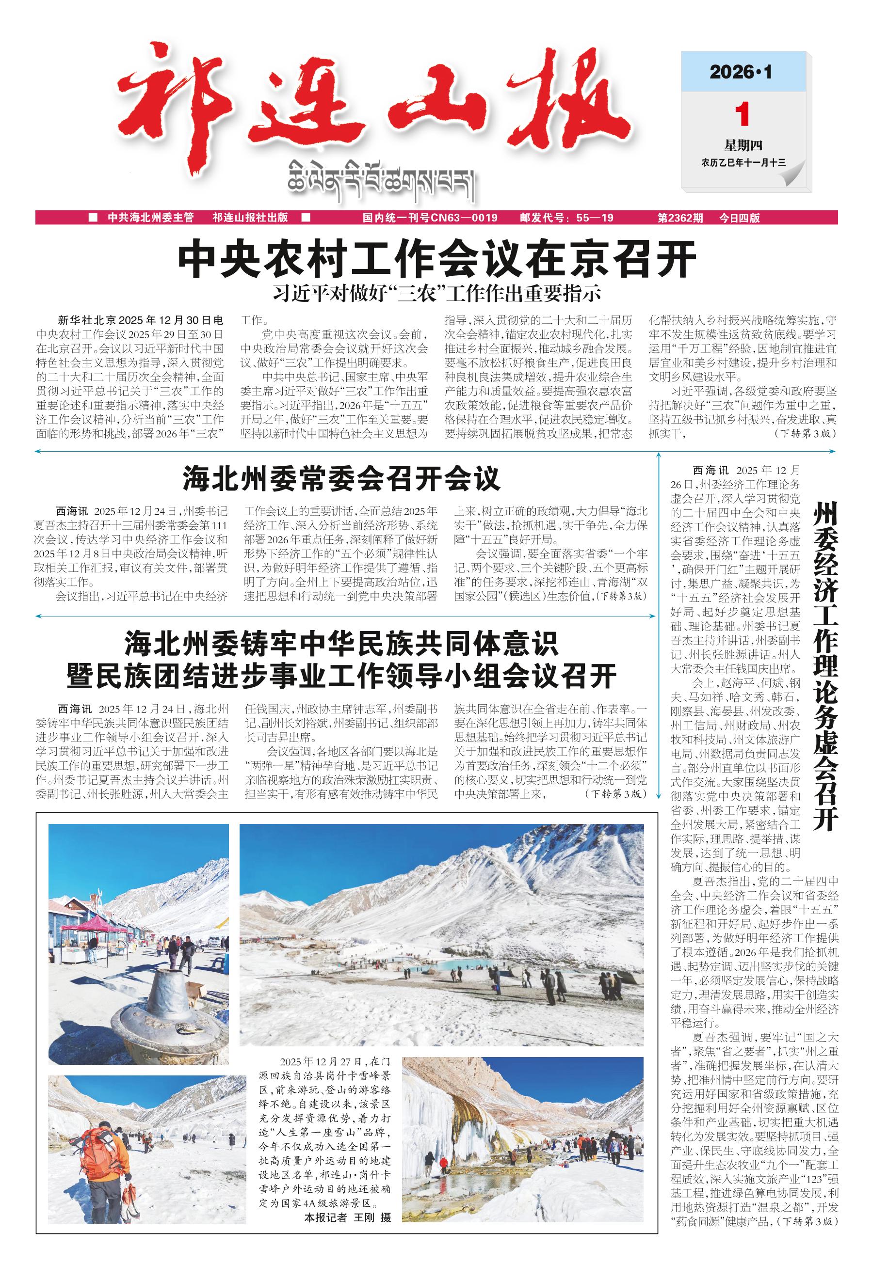 <div style='font-size: 22px!important;line-height: 34px!important;text-align: justify!important;color: #000!important'>中央农村工作会议在京召开</div><div style='font-size: 16px!important;line-height: 28px!important;text-align: justify;color: #777!important;margin-top: 20px;'>习近平对做好“三农”工作作出重要指示</div><div style='font-size: 14px!important;line-height: 22px!important;text-align: left!important;color: #777!important;margin-top: 20px;'>祁连山报  2026-01-01</div><div><img id='paperImg' style='max-width: 100%;height: auto' src='//img.founderfx.cn/epaper/202512/31/ce3239bda8594f11b12c7f7d2ace3374/1.jpg' alt='' class='page-img'/></div><p> 新华社北京2025年12月30日电 中央农村工作会议2025年29日至30日在北京召开。会议以习近平新时代中国特色社会主义思想为指导,深入贯彻党的二十大和二十届历次全会精神,全面贯彻习近平总书记关于“三农”工作的重要论述和重要指示精神,落实中央经济工作会议精神,分析当前“三农”工作面临的形势和挑战,部署2026年“三农”工作。</p><p> 党中央高度重视这次会议。会前,中央政治局常委会会议就开好这次会议、做好“三农”工作提出明确要求。</p><p> 中共中央总书记、国家主席、中央军委主席习近平对做好“三农”工作作出重要指示。习近平指出,2026年是“十五五”开局之年,做好“三农”工作至关重要。要坚持以新时代中国特色社会主义思想为指导,深入贯彻党的二十大和二十届历次全会精神,锚定农业农村现代化,扎实推进乡村全面振兴,推动城乡融合发展。要毫不放松抓好粮食生产,促进良田良种良机良法集成增效,提升农业综合生产能力和质量效益。要提高强农惠农富农政策效能,促进粮食等重要农产品价格保持在合理水平,促进农民稳定增收。要持续巩固拓展脱贫攻坚成果,把常态化帮扶纳入乡村振兴战略统筹实施,守牢不发生规模性返贫致贫底线。要学习运用“千万工程”经验,因地制宜推进宜居宜业和美乡村建设,提升乡村治理和文明乡风建设水平。</p><p> 习近平强调,各级党委和政府要坚持把解决好“三农”问题作为重中之重,坚持五级书记抓乡村振兴,奋发进取、真抓实干,(下转第3版)</p>