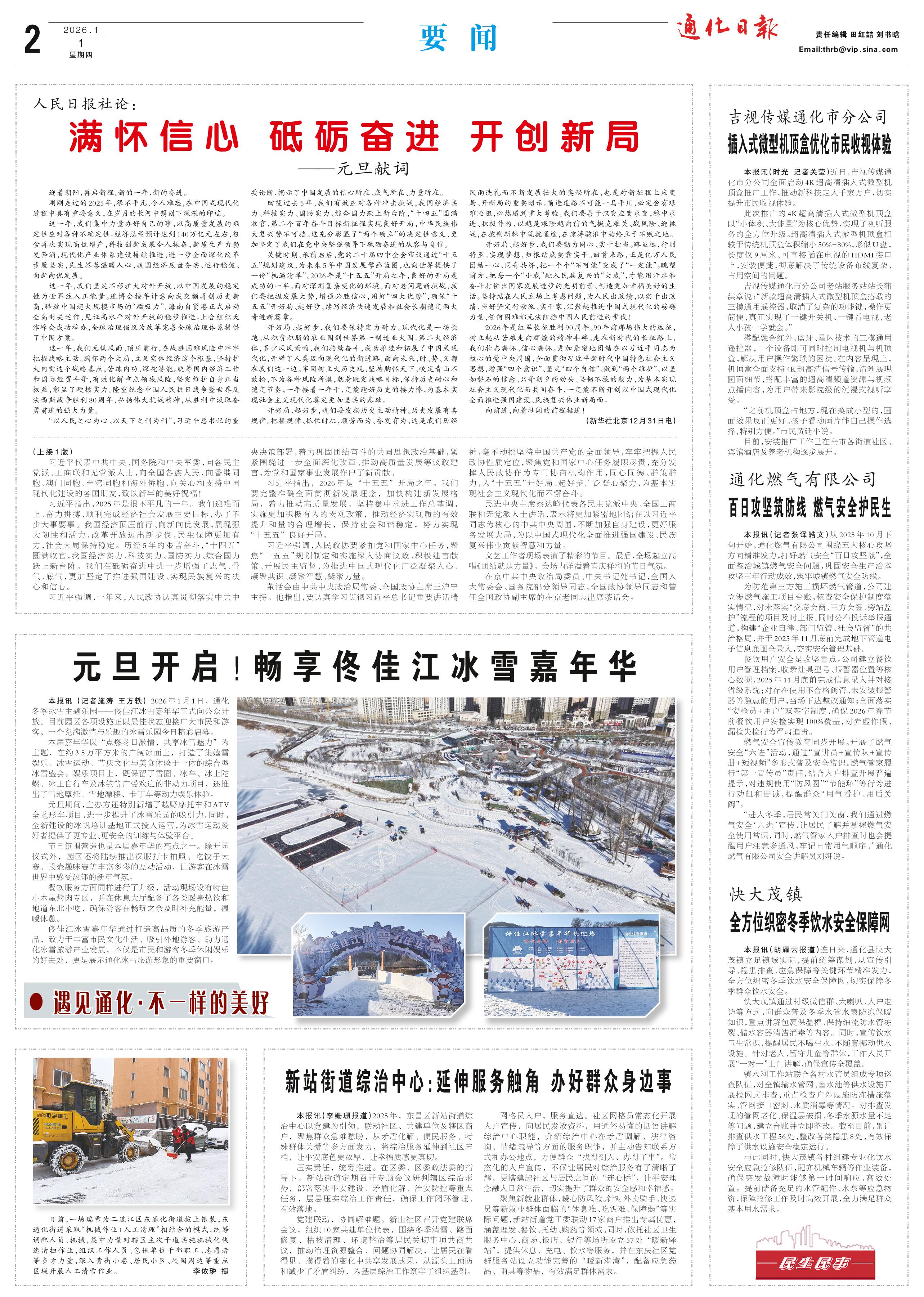 <div style='font-size: 22px!important;line-height: 34px!important;text-align: justify!important;color: #000!important'>通化日报2026年01月01日-文章</div><div style='font-size: 14px!important;line-height: 22px!important;text-align: left!important;color: #777!important;margin-top: 20px;'>通化日报  2026-01-01</div><div><img id='paperImg' style='max-width: 100%;height: auto' src='//img.founderfx.cn/epaper/202601/04/b680d461dfa741f58ea63f7b85200df8/2.jpg' alt='' class='page-img'/></div><p>(上接1版)</p><p>习近平代表中共中央、国务院和中央军委,向各民主党派、工商联和无党派人士,向全国各族人民,向香港同胞、澳门同胞、台湾同胞和海外侨胞,向关心和支持中国现代化建设的各国朋友,致以新年的美好祝福!</p><p>习近平指出,2025年是很不平凡的一年。我们迎难而上、奋力拼搏,顺利完成经济社会发展主要目标,办了不少大事要事。我国经济顶压前行、向新向优发展,展现强大韧性和活力,改革开放迈出新步伐,民生保障更加有力,社会大局保持稳定。历经5年的艰苦奋斗,“十四五”圆满收官,我国经济实力、科技实力、国防实力、综合国力跃上新台阶。我们在砥砺奋进中进一步增强了志气、骨气、底气,更加坚定了推进强国建设、实现民族复兴的决心和信心。</p><p>习近平强调,一年来,人民政协认真贯彻落实中共中央决策部署,着力巩固团结奋斗的共同思想政治基础,紧紧围绕进一步全面深化改革、推动高质量发展等议政建言,为党和国家事业发展作出了新贡献。</p><p>习近平指出,2026年是“十五五”开局之年。我们要完整准确全面贯彻新发展理念,加快构建新发展格局,着力推动高质量发展,坚持稳中求进工作总基调,实施更加积极有为的宏观政策,推动经济实现质的有效提升和量的合理增长,保持社会和谐稳定,努力实现“十五五”良好开局。</p><p>习近平强调,人民政协要紧扣党和国家中心任务,聚焦“十五五”规划制定和实施深入协商议政、积极建言献策、开展民主监督,为推进中国式现代化广泛凝聚人心、凝聚共识、凝聚智慧、凝聚力量。</p><p>茶话会由中共中央政治局常委、全国政协主席王沪宁主持。他指出,要认真学习贯彻习近平总书记重要讲话精神,毫不动摇坚持中国共产党的全面领导,牢牢把握人民政协性质定位,聚焦党和国家中心任务履职尽责,充分发挥人民政协作为专门协商机构作用,同心同德、群策群力,为“十五五”开好局、起好步广泛凝心聚力,为基本实现社会主义现代化而不懈奋斗。</p><p>民进中央主席蔡达峰代表各民主党派中央、全国工商联和无党派人士讲话,表示将更加紧密地团结在以习近平同志为核心的中共中央周围,不断加强自身建设,更好服务发展大局,为以中国式现代化全面推进强国建设、民族复兴伟业贡献智慧和力量。</p><p>文艺工作者现场表演了精彩的节目。最后,全场起立高唱《团结就是力量》。会场内洋溢着喜庆祥和的节日气氛。</p><p>在京中共中央政治局委员、中央书记处书记,全国人大常委会、国务院部分领导同志,全国政协领导同志和曾任全国政协副主席的在京老同志出席茶话会。</p>