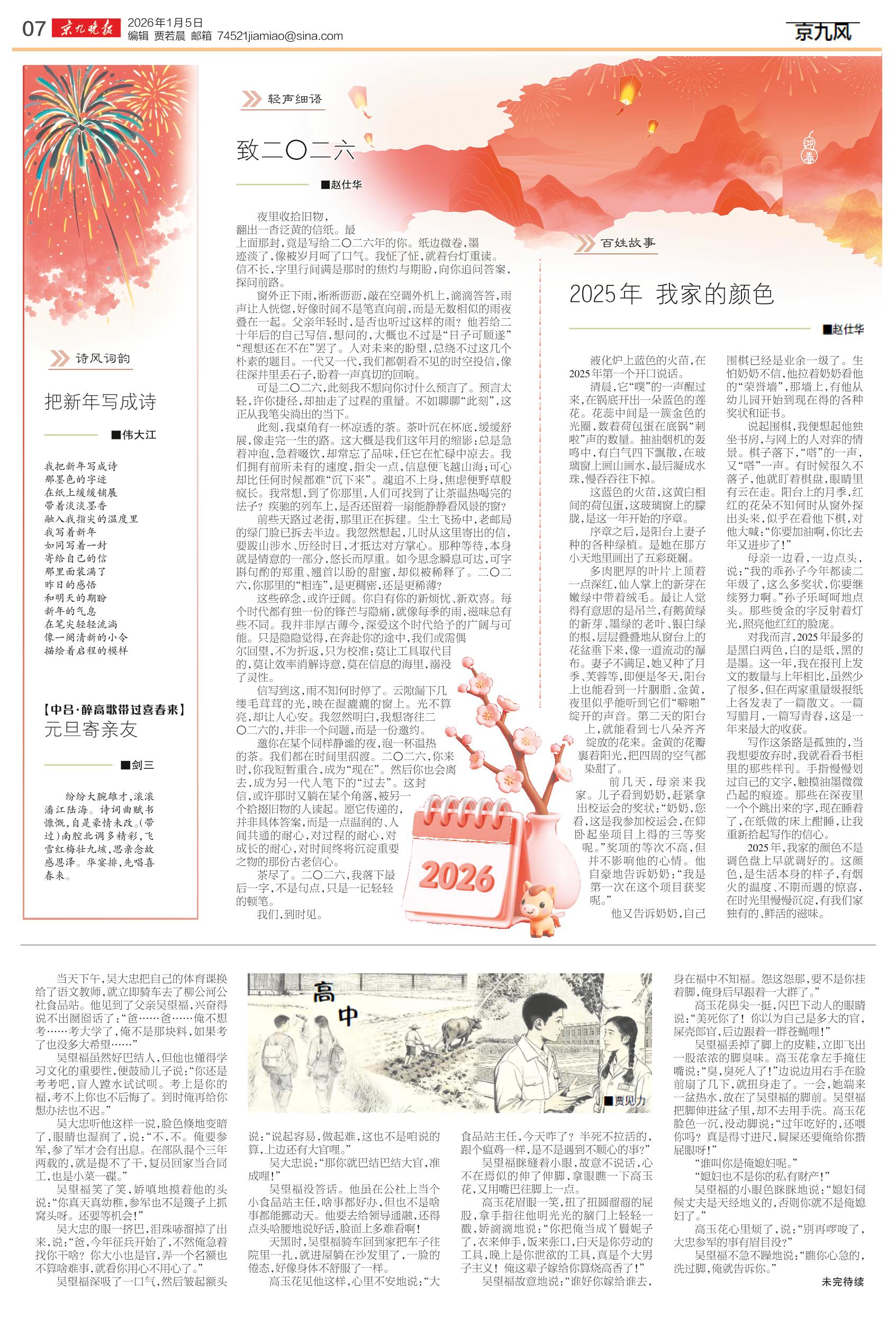 <div style='font-size: 16px!important;line-height: 28px!important;text-align: justify;color: #777!important;'>【中吕·醉高歌带过喜春来】</div><div style='font-size: 22px!important;line-height: 34px!important;text-align: justify!important;color: #000!important'>元旦寄亲友</div><div style='font-size: 14px!important;line-height: 22px!important;text-align: left!important;color: #777!important;margin-top: 20px;'>京九晚报云阅读  2026-01-05</div><div><img id='paperImg' style='max-width: 100%;height: auto' src='//img.founderfx.cn/epaper/202601/05/d7254f2ee0b24b72927640d494feb63e/7.jpg' alt='' class='page-img'/></div><p> ■剑三</p><p> 纷纷大腕雄才,滚滚潘江陆海。诗词曲赋书慷慨,自是豪情未改。(带过)南腔北调多精彩,飞雪红梅壮九垓,思亲念故感恩泽。华宴排,先唱喜春来。</p>
