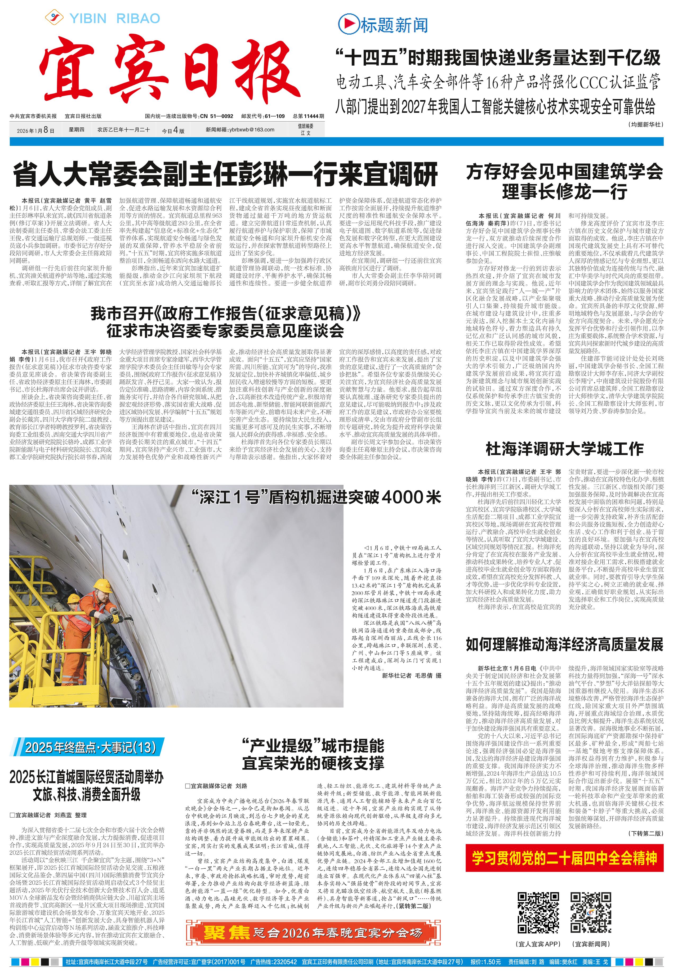 <div style='font-size: 22px!important;line-height: 34px!important;text-align: justify!important;color: #000!important'>标题新闻</div><div style='font-size: 14px!important;line-height: 22px!important;text-align: left!important;color: #777!important;margin-top: 20px;'>宜宾日报  2026-01-08</div><div><img id='paperImg' style='max-width: 100%;height: auto' src='//img.founderfx.cn/epaper/202601/08/1108350affae4204a27b8e577277813a/1.jpg' alt='' class='page-img'/></div><p> “十四五”时期我国快递业务量达到千亿级</p><p> 电动工具、汽车安全部件等16种产品将强化CCC认证监管</p><p> 八部门提出到2027年我国人工智能关键核心技术实现安全可靠供给</p><p> (均据新华社)</p>