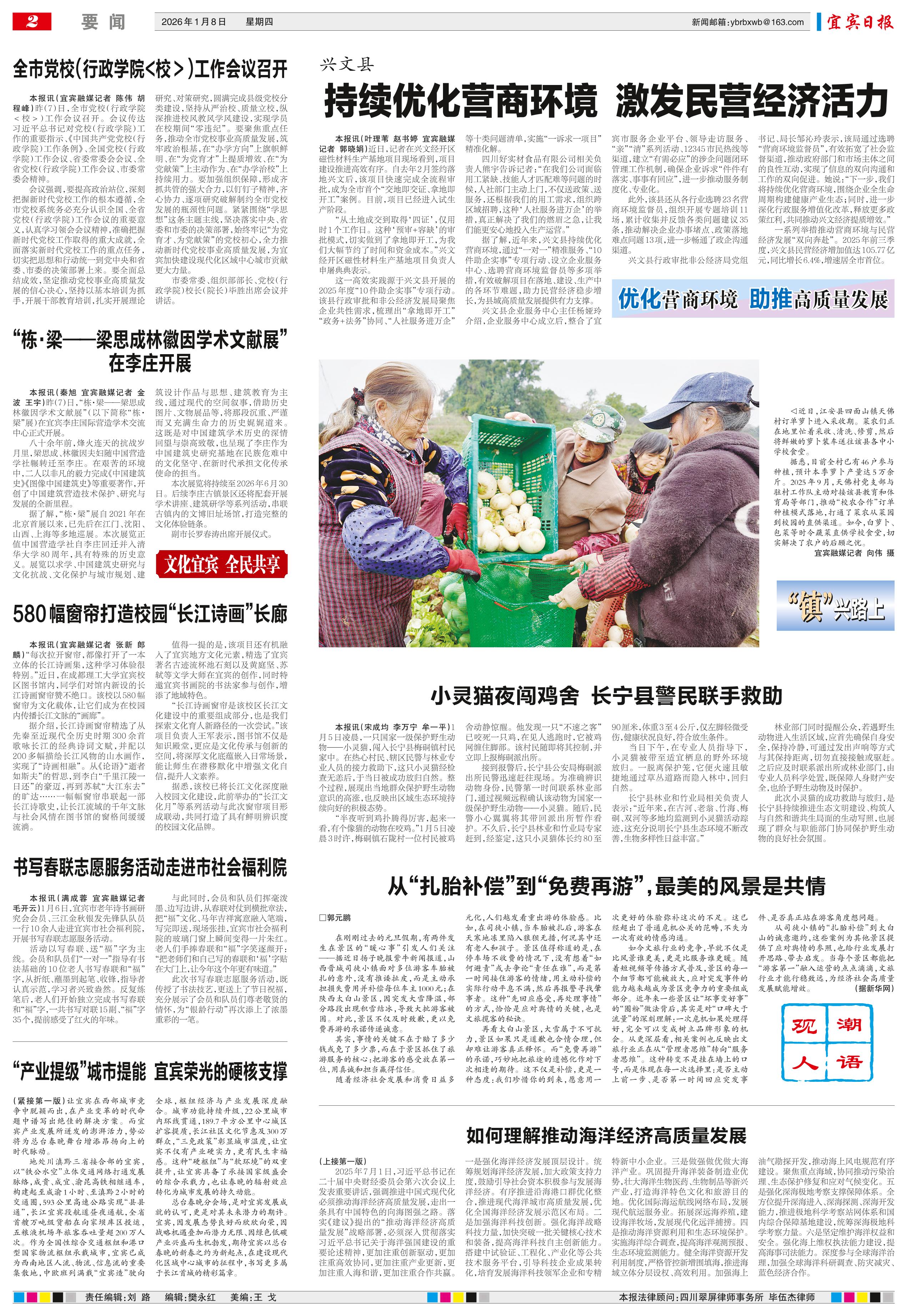 <div style='font-size: 22px!important;line-height: 34px!important;text-align: justify!important;color: #000!important'>小灵猫夜闯鸡舍 长宁县警民联手救助</div><div style='font-size: 14px!important;line-height: 22px!important;text-align: left!important;color: #777!important;margin-top: 20px;'>宜宾日报  2026-01-08</div><div><img id='paperImg' style='max-width: 100%;height: auto' src='//img.founderfx.cn/epaper/202601/08/1108350affae4204a27b8e577277813a/2.jpg' alt='' class='page-img'/></div><p> 本报讯(宋成均 李万宁 牟一平)1月5日凌晨,一只国家一级保护野生动物——小灵猫,闯入长宁县梅硐镇村民家中。在热心村民、辖区民警与林业专业人员的接力救助下,这只小灵猫经检查无恙后,于当日被成功放归自然。整个过程,展现出当地群众保护野生动物意识的高涨,也反映出区域生态环境持续向好的积极态势。</p><p> “半夜听到鸡扑腾得厉害,起来一看,有个像猫的动物在咬鸡。”1月5日凌晨3时许,梅硐镇石陇村一位村民被鸡舍动静惊醒。他发现一只“不速之客”已咬死一只鸡,在见人逃跑时,它被鸡网缠住脚部。该村民随即将其控制,并立即上报梅硐派出所。</p><p> 接到报警后,长宁县公安局梅硐派出所民警迅速赶往现场。为准确辨识动物身份,民警第一时间联系林业部门,通过视频远程确认该动物为国家一级保护野生动物——小灵猫。随后,民警小心翼翼将其带回派出所暂作看护。不久后,长宁县林业和竹业局专家赶到,经鉴定,这只小灵猫体长约80至90厘米,体重3至4公斤,仅左脚轻微受伤,健康状况良好,符合放生条件。</p><p> 当日下午,在专业人员指导下,小灵猫被带至适宜栖息的野外环境放归。一脱离保护笼,它便火速且敏捷地通过草丛道路而隐入林中,回归自然。</p><p> 长宁县林业和竹业局相关负责人表示:“近年来,在古河、老翁、竹海、梅硐、双河等多地均监测到小灵猫活动踪迹,这充分说明长宁县生态环境不断改善,生物多样性日益丰富。”</p><p> 林业部门同时提醒公众,若遇野生动物进入生活区域,应首先确保自身安全,保持冷静,可通过发出声响等方式与其保持距离,切勿直接接触或驱赶。之后应及时联系派出所或林业部门,由专业人员科学处置,既保障人身财产安全,也给予野生动物及时保护。</p><p> 此次小灵猫的成功救助与放归,是长宁县持续推进生态文明建设、构筑人与自然和谐共生局面的生动写照,也展现了群众与职能部门协同保护野生动物的良好社会氛围。</p>