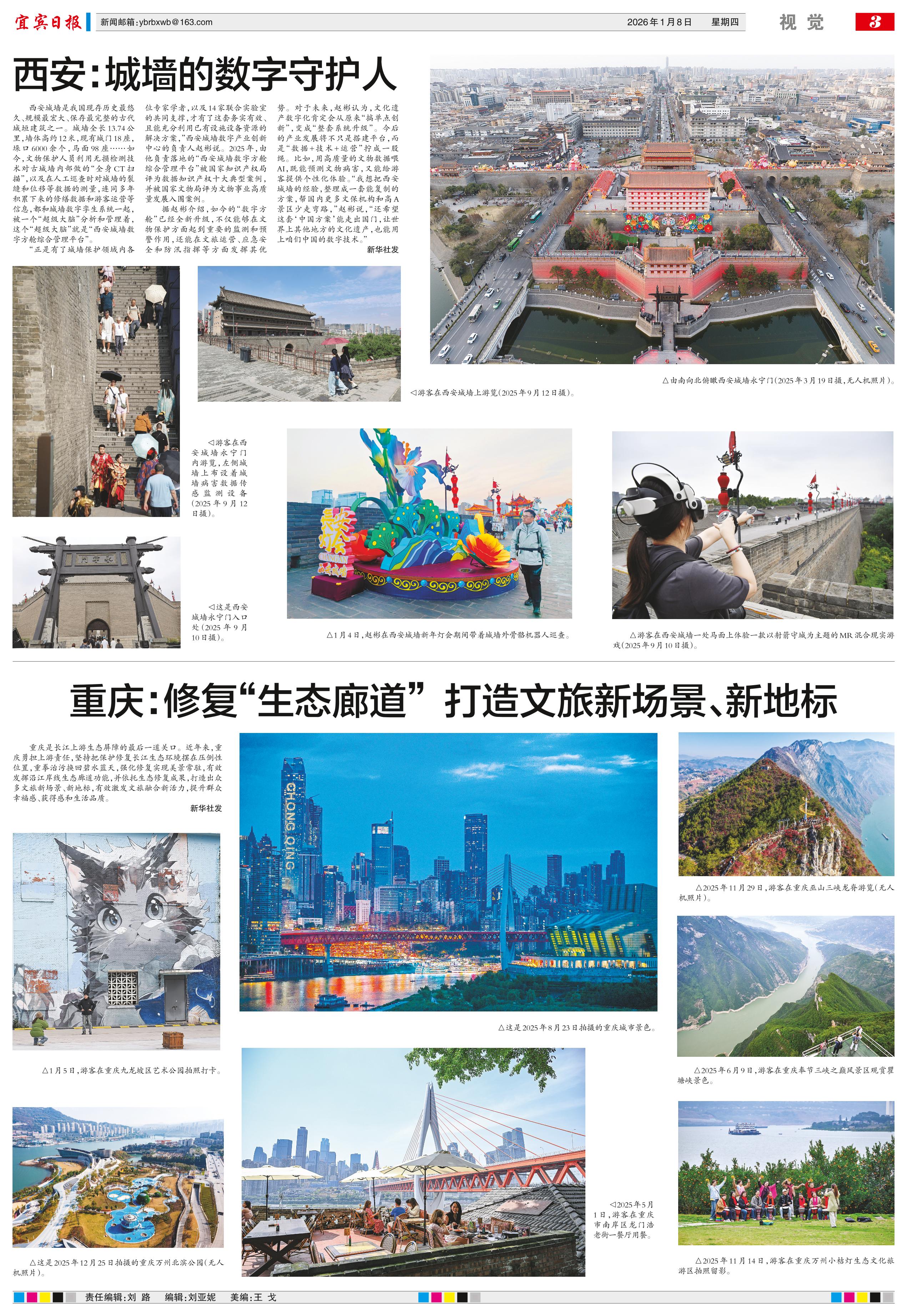 <div style='font-size: 22px!important;line-height: 34px!important;text-align: justify!important;color: #000!important'>重庆:修复“生态廊道” 打造文旅新场景、新地标</div><div style='font-size: 14px!important;line-height: 22px!important;text-align: left!important;color: #777!important;margin-top: 20px;'>宜宾日报  2026-01-08</div><div><img id='paperImg' style='max-width: 100%;height: auto' src='//img.founderfx.cn/epaper/202601/08/1108350affae4204a27b8e577277813a/3.jpg' alt='' class='page-img'/></div><div style='font-size: 14px!important;line-height: 22px!important;text-align: center!important;color: #777!important;'><img src='//img.founderfx.cn/epaper/202601/08/1108350affae4204a27b8e577277813a/A3/2337633_liuyn_1767784285599_s.jpg'style='display: block!important;margin: auto!important;max-width: 100%!important;'/> △这是2025年8月23日拍摄的重庆城市景色。<img src='//img.founderfx.cn/epaper/202601/08/1108350affae4204a27b8e577277813a/A3/2337620_liuyn_1767784237468_s.jpg'style='display: block!important;margin: auto!important;max-width: 100%!important;'/> △1月5日,游客在重庆九龙坡区艺术公园拍照打卡。<img src='//img.founderfx.cn/epaper/202601/08/1108350affae4204a27b8e577277813a/A3/2337626_liuyn_1767784258951_s.jpg'style='display: block!important;margin: auto!important;max-width: 100%!important;'/> △这是2025年12月25日拍摄的重庆万州北滨公园(无人机照片)。<img src='//img.founderfx.cn/epaper/202601/08/1108350affae4204a27b8e577277813a/A3/2337617_liuyn_1767784224942_s.jpg'style='display: block!important;margin: auto!important;max-width: 100%!important;'/> △2025年5月1日,游客在重庆市南岸区龙门浩老街一餐厅用餐。<img src='//img.founderfx.cn/epaper/202601/08/1108350affae4204a27b8e577277813a/A3/2337623_liuyn_1767784249491_s.jpg'style='display: block!important;margin: auto!important;max-width: 100%!important;'/> △2025年11月29日,游客在重庆巫山三峡龙脊游览(无人机照片)。<img src='//img.founderfx.cn/epaper/202601/08/1108350affae4204a27b8e577277813a/A3/2337631_liuyn_1767784275245_s.jpg'style='display: block!important;margin: auto!important;max-width: 100%!important;'/> △2025年6月9日,游客在重庆奉节三峡之巅风景区观赏瞿塘峡景色。<img src='//img.founderfx.cn/epaper/202601/08/1108350affae4204a27b8e577277813a/A3/2337615_liuyn_1767784214244_s.jpg'style='display: block!important;margin: auto!important;max-width: 100%!important;'/> △2025年11月14日,游客在重庆万州小桔灯生态文化旅游区拍照留影。</div><p> 重庆是长江上游生态屏障的最后一道关口。近年来,重庆勇担上游责任,坚持把保护修复长江生态环境摆在压倒性位置,重拳治污换回碧水蓝天,强化修复实现美景常驻,有效发挥沿江岸线生态廊道功能,并依托生态修复成果,打造出众多文旅新场景、新地标,有效激发文旅融合新活力,提升群众幸福感、获得感和生活品质。</p><p> 新华社发</p>