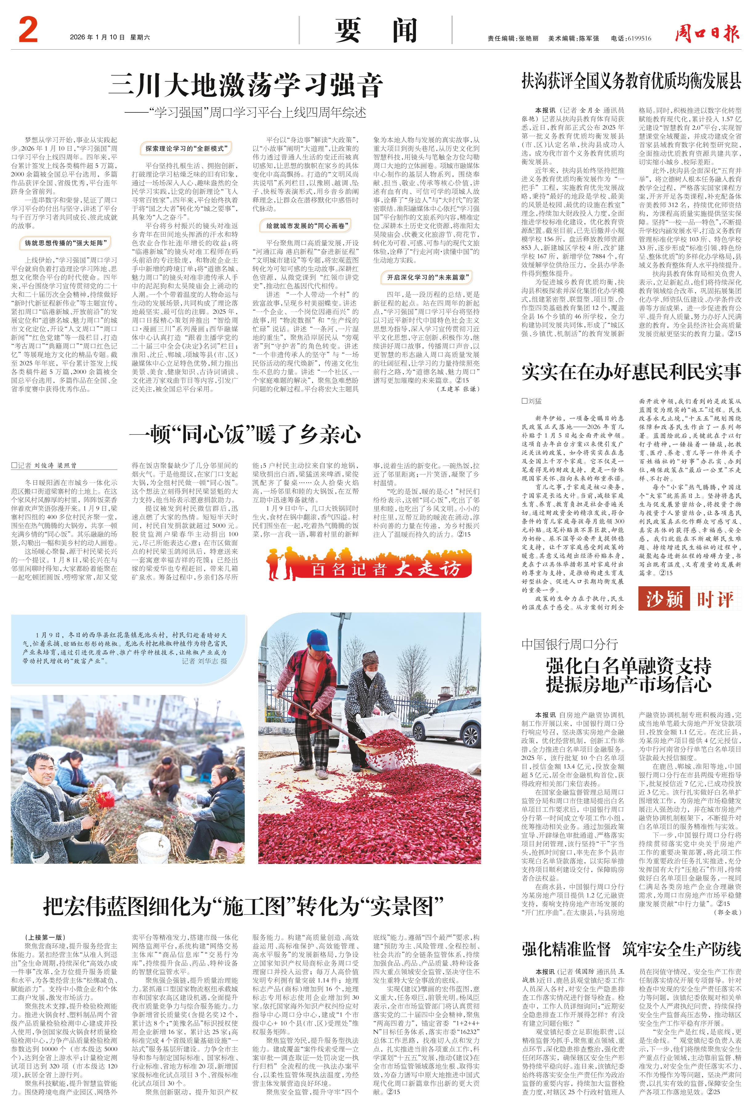 <div style='font-size: 22px!important;line-height: 34px!important;text-align: justify!important;color: #000!important'>三川大地激荡学习强音</div><div style='font-size: 16px!important;line-height: 28px!important;text-align: justify;color: #777!important;margin-top: 20px;'>——“学习强国”周口学习平台上线四周年综述</div><div style='font-size: 14px!important;line-height: 22px!important;text-align: left!important;color: #777!important;margin-top: 20px;'>周口日报  2026-01-10</div><div><img id='paperImg' style='max-width: 100%;height: auto' src='//img.founderfx.cn/epaper/202601/10/0b6264cc86434bb78a09e6c3277b00a3/2.jpg' alt='' class='page-img'/></div><p> 梦想从学习开始,事业从实践起步。2026年1月10日,“学习强国”周口学习平台上线四周年。四年来,平台累计签发上线各类稿件超5万篇,2000余篇被全国总平台选用,多篇作品获评全国、省级优秀,平台连年跻身全省前列。</p><p> 一连串数字和荣誉,见证了周口学习平台的付出与坚守,讲述了平台与千百万学习者共同成长、彼此成就的故事。</p><p> 铸就思想传播的“强大矩阵”</p><p> 上线伊始,“学习强国”周口学习平台就肩负着打造理论学习阵地、思想文化聚合平台的时代使命。四年来,平台围绕学习宣传贯彻党的二十大和二十届历次全会精神,持续做好“新时代新征程新伟业”等主题宣传,紧扣周口“临港新城、开放前沿”的发展定位和“道德名城、魅力周口”的城市文化定位,开设“人文周口”“周口新闻”“红色党建”等一级栏目,打造 “考古周口”“典籍周口”“周口红色记忆” 等展现地方文化的精品专题。截至2025年年底,平台累计签发上线各类稿件超5万篇,2000余篇被全国总平台选用,多篇作品在全国、全省季度赛中获得优秀作品。</p><p> 探索理论学习的“全新模式”</p><p> 平台坚持扎根生活、拥抱创新,打破理论学习枯燥乏味的旧有印象,通过一场场深入人心、趣味盎然的全民学习实践,让党的创新理论“飞入寻常百姓家”。四年来,平台始终执着于将“国之大者”转化为“城之要事”,具象为“人之奋斗”。</p><p> 平台将乡村振兴的镜头对准返乡青年在田间地头挥洒的汗水和特色农业合作社连年增长的收益;将“临港新城”的镜头对准工程师在码头前沿的专注脸庞,和物流企业主手中新增的跨境订单;将“道德名城、魅力周口”的镜头对准非遗传承人手中的泥泥狗和太昊陵庙会上涌动的人潮。一个个带着温度的人物命运与生动的发展场景,共同构成了理论落地最坚实、最可信的注脚。2025年,周口日报精心策划并推出“智绘周口·漫画三川”系列漫画;西华融媒体中心认真打造“跟着主播学党的二十届三中全会《决定》名词”栏目;淮阳、沈丘、郸城、项城等县(市、区)融媒体中心立足特色优势,倾力推出美景、美食、健康知识、古诗词诵读、文化进万家戏曲节目等内容,引发广泛关注,被全国总平台采用。</p><p> 平台以“身边事”解读“大政策”,以“小故事”阐明“大道理”,让政策的伟力透过普通人生活的变迁而被真切感知,让思想的旗帜在家乡的具体变化中高高飘扬。打造的“文明风尚共说唱”系列栏目,以豫剧、越调、坠子、快板等表演形式,用乡音乡韵阐释理念,让群众在潜移默化中感悟时代脉动。</p><p> 绘就城市发展的“同心画卷”</p><p> 平台聚焦周口高质量发展,开设“河通江海 港启新程”“奋进新征程”“文明城市建设”等专题,将宏观蓝图转化为可知可感的生动故事。深耕红色资源,从微党课到“红领巾讲党史”,推动红色基因代代相传。</p><p> 讲述 “一个人带动一个村” 的致富故事,呈现乡村美丽蝶变。讲述 “一个企业、一个岗位因港而兴” 的故事,用 “物流数据” 和 “生产线的忙碌” 说话。讲述 “一条河、一片湿地的重生”,聚焦沿岸居民从“旁观者”到“守护者”的角色转变。讲述 “一个非遗传承人的坚守” 与 “一场民俗活动的现代焕新”,传递文化生生不息的力量。讲述 “一个社区、一个家庭难题的解决”,聚焦急难愁盼问题的化解过程。平台将宏大主题具象为本地人物与发展的真实故事,从重大项目到街头巷尾,从历史文化到智慧科技,用镜头与笔触全方位勾勒周口大地的立体画卷。项城市融媒体中心制作的基层人物系列,围绕奉献、担当、敬业、传承等核心价值,讲述有血有肉、可信可学的项城人故事,诠释了“身边人”与“大时代”的紧密联结。淮阳融媒体中心依托“学习强国”平台制作的文旅系列内容,精准定位、深耕本土历史文化资源,将淮阳太昊陵庙会、伏羲文化旅游节、荷花节,转化为可看、可感、可参与的现代文旅体验,诠释了“行走河南·读懂中国”的生动地方实践。</p><p> 开启深化学习的“未来篇章”</p><p> 四年,是一段历程的总结,更是新征程的起点。站在四周年的新起点,“学习强国”周口学习平台将坚持以习近平新时代中国特色社会主义思想为指导,深入学习宣传贯彻习近平文化思想,守正创新、积极作为,继续讲好周口故事,传播周口声音,以更智慧的形态融入周口高质量发展的壮阔征程,让学习的力量持续照亮前行之路,为“道德名城、魅力周口”谱写更加璀璨的未来篇章。②15</p><p> (王建军 张谦)</p>