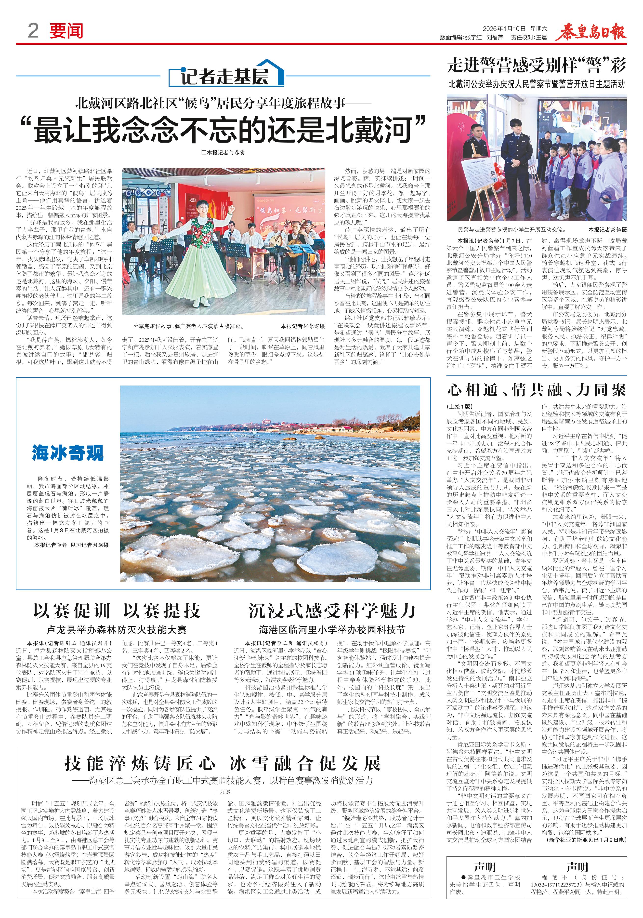 路北社区党支部书记张雅敏表示:“在联欢会中设置讲述旅程故事环节,是希望通过‘候鸟’居民分享故事,展现社区多元融合的温度。每一段足迹都是对生活的热爱,凝聚了大家共建共享新社区的归属感,诠释了‘此心安处是吾乡’的深刻内涵。”