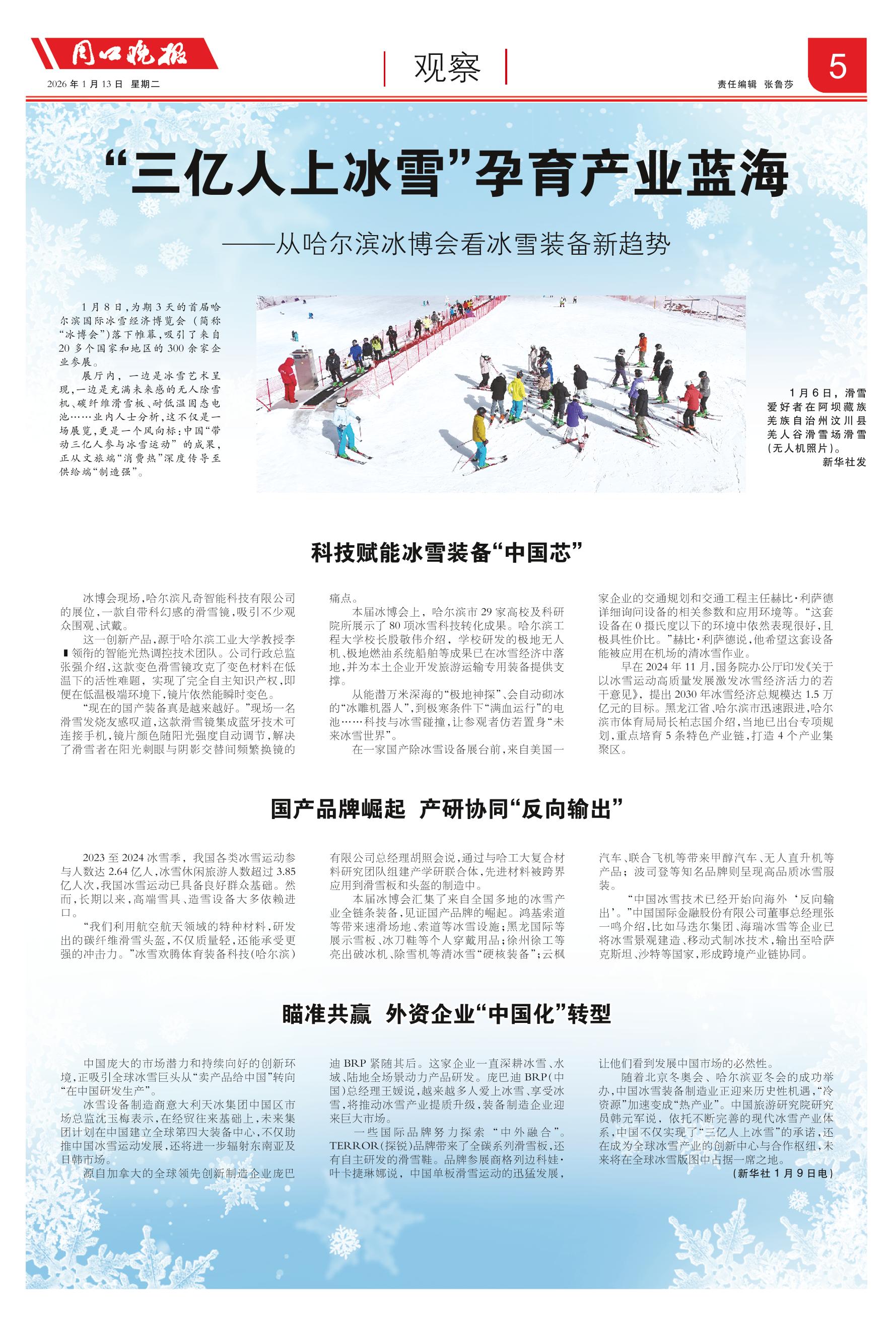 <div style='font-size: 22px!important;line-height: 34px!important;text-align: justify!important;color: #000!important'>“三亿人上冰雪”孕育产业蓝海</div><div style='font-size: 16px!important;line-height: 28px!important;text-align: justify;color: #777!important;margin-top: 20px;'>——从哈尔滨冰博会看冰雪装备新趋势</div><div style='font-size: 14px!important;line-height: 22px!important;text-align: left!important;color: #777!important;margin-top: 20px;'>周口晚报  2026-01-13</div><div><img id='paperImg' style='max-width: 100%;height: auto' src='//img.founderfx.cn/epaper/202601/13/aec953edcd6b4c9fb7c20aa4d7d1f070/5.jpg' alt='' class='page-img'/></div><div style='font-size: 14px!important;line-height: 22px!important;text-align: center!important;color: #777!important;'><img src='//img.founderfx.cn/epaper/202601/13/aec953edcd6b4c9fb7c20aa4d7d1f070/05/474cec5c9b86bc2d88729591fcceda6e_s.jpg'style='display: block!important;margin: auto!important;max-width: 100%!important;'/> 1月6日,滑雪爱好者在阿坝藏族羌族自治州汶川县羌人谷滑雪场滑雪(无人机照片)。