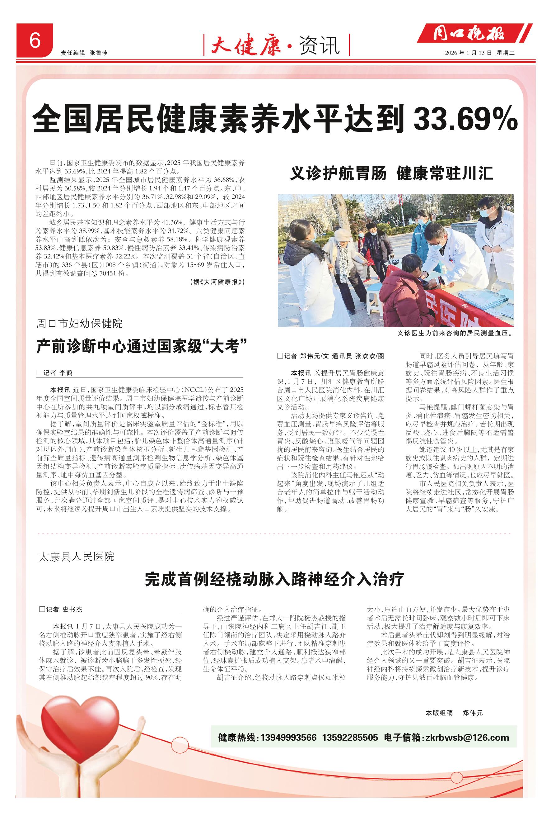 <div style='font-size: 16px!important;line-height: 28px!important;text-align: justify;color: #777!important;'>太康县人民医院</div><div style='font-size: 22px!important;line-height: 34px!important;text-align: justify!important;color: #000!important'>完成首例经桡动脉入路神经介入治疗</div><div style='font-size: 14px!important;line-height: 22px!important;text-align: left!important;color: #777!important;margin-top: 20px;'>周口晚报  2026-01-13</div><div><img id='paperImg' style='max-width: 100%;height: auto' src='//img.founderfx.cn/epaper/202601/13/aec953edcd6b4c9fb7c20aa4d7d1f070/6.jpg' alt='' class='page-img'/></div><p> □记者 史书杰</p><p> 本报讯 1月7日,太康县人民医院成功为一名右侧椎动脉开口重度狭窄患者,实施了经右侧桡动脉入路的神经介入支架植入手术。</p><p> 据了解,该患者此前因反复头晕、晕厥伴肢体麻木就诊,被诊断为小脑脑干多发性梗死,经保守治疗后效果不佳。再次入院后,经检查,发现其右侧椎动脉起始部狭窄程度超过90%,存在明确的介入治疗指征。</p><p> 经过严谨评估,在郑大一附院杨杰教授的指导下,由该院神经内科二病区主任胡吉征、副主任陈肖领衔的治疗团队,决定采用桡动脉入路介入术。手术在局部麻醉下进行,团队精准穿刺患者右侧桡动脉,建立介入通路,顺利抵达狭窄部位,经球囊扩张后成功植入支架。患者术中清醒,生命体征平稳。</p><p> 胡吉征介绍,经桡动脉入路穿刺点仅如米粒大小,压迫止血方便,并发症少。最大优势在于患者术后无需长时间卧床,观察数小时后即可下床活动,极大提升了治疗舒适度与康复效率。</p><p> 术后患者头晕症状即刻得到明显缓解,对治疗效果和就医体验给予了高度评价。</p><p> 此次手术的成功开展,是太康县人民医院神经介入领域的又一重要突破。胡吉征表示,医院神经内科将持续探索微创治疗新技术,提升诊疗服务能力,守护县域百姓脑血管健康。</p>
