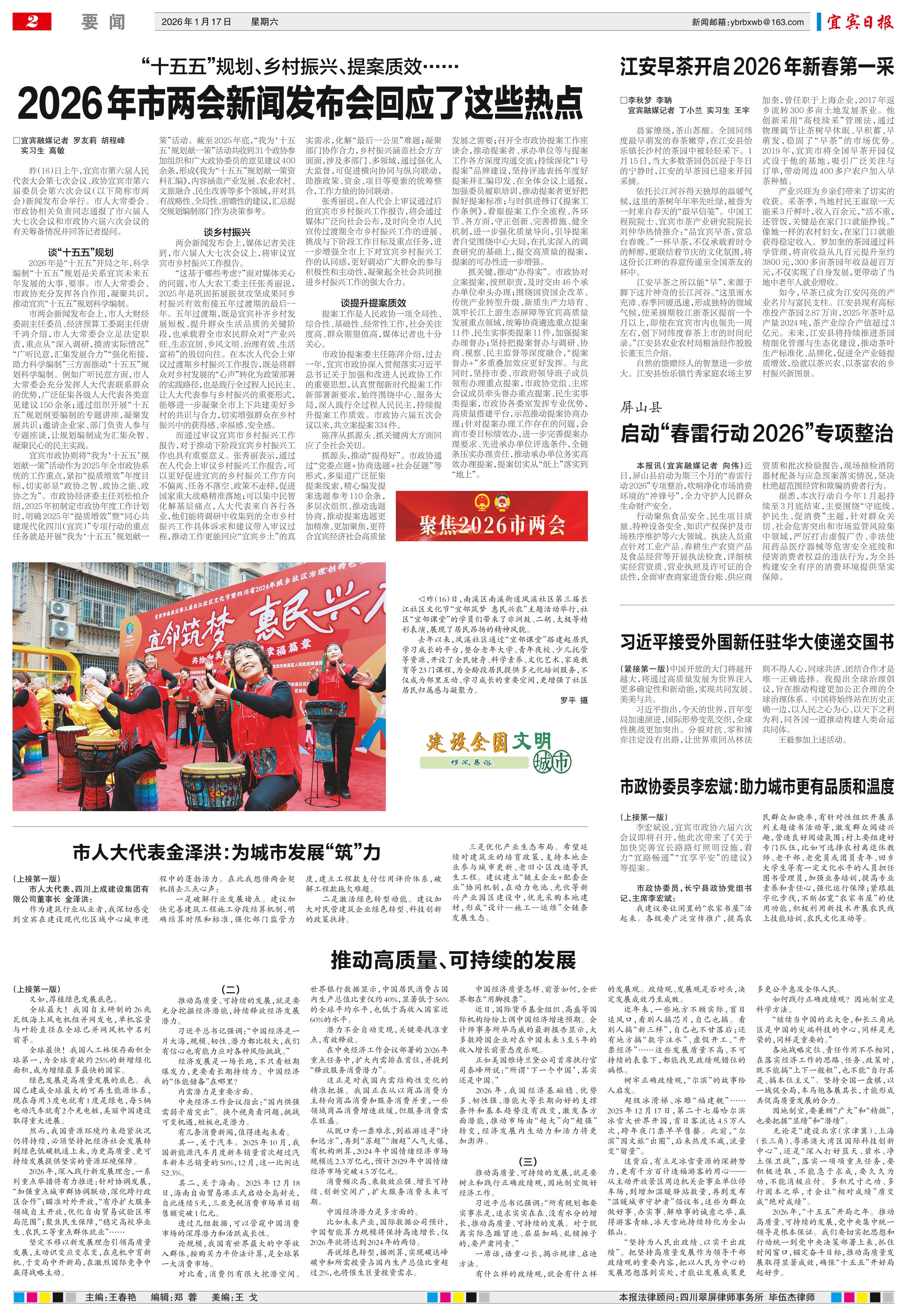 <div style='font-size: 16px!important;line-height: 28px!important;text-align: justify;color: #777!important;'>“十五五”规划、乡村振兴、提案质效……</div><div style='font-size: 22px!important;line-height: 34px!important;text-align: justify!important;color: #000!important'>2026年市两会新闻发布会回应了这些热点</div><div style='font-size: 14px!important;line-height: 22px!important;text-align: left!important;color: #777!important;margin-top: 20px;'>宜宾日报  2026-01-17</div><div><img id='paperImg' style='max-width: 100%;height: auto' src='//img.founderfx.cn/epaper/202601/17/d8eddb56f5b549d7ad9f5b5799dfd0e1/2.jpg' alt='' class='page-img'/></div><p> □宜宾融媒记者 罗友莉 胡程峰</p><p> 实习生 高敏</p><p> 昨(16)日上午,宜宾市第六届人民代表大会第七次会议、政协宜宾市第六届委员会第六次会议(以下简称市两会)新闻发布会举行。市人大常委会、市政协相关负责同志通报了市六届人大七次会议和市政协六届六次会议的有关筹备情况并回答记者提问。</p><p> 谈“十五五”规划</p><p> 2026年是“十五五”开局之年,科学编制“十五五”规划是关系宜宾未来五年发展的大事、要事。市人大常委会、市政协充分发挥各自作用,凝聚共识,推动宜宾“十五五”规划科学编制。</p><p> 市两会新闻发布会上,市人大财经委副主任委员、经济预算工委副主任唐千鸿介绍,市人大常委会立足法定职责,重点从“深入调研,摸清实际情况”“广听民意,汇集发展合力”“强化衔接,助力科学编制”三方面推动“十五五”规划科学编制。例如广听民意方面,市人大常委会充分发挥人大代表联系群众的优势,广泛征集各级人大代表各类意见建议150余条;通过组织开展“十五五”规划纲要编制的专题讲座,凝聚发展共识;邀请企业家、部门负责人参与专题座谈,让规划编制成为汇集众智、凝聚民心的民主实践。</p><p> 宜宾市政协则将“我为‘十五五’规划献一策”活动作为2025年全市政协系统的工作重点,紧扣“提质增效”年度目标,切实彰显“政协之智、政协之能、政协之为”。市政协经济委主任刘松柏介绍,2025年初制定市政协年度工作计划时,明确2025年“提质增效”暨“同心共建现代化四川(宜宾)”专项行动的重点任务就是开展“我为‘十五五’规划献一策”活动。截至2025年底,“我为‘十五五’规划献一策”活动共收到31个政协参加组织和广大政协委员的意见建议400余条,形成《我为“十五五”规划献一策资料汇编》,内容涵盖产业发展、农业农村、文旅融合、民生改善等多个领域,并对具有战略性、全局性、前瞻性的建议,汇总提交规划编制部门作为决策参考。</p><p> 谈乡村振兴</p><p> 两会新闻发布会上,媒体记者关注到,市六届人大七次会议上,将审议宜宾市乡村振兴工作报告。</p><p> “这基于哪些考虑?”面对媒体关心的问题,市人大农工委主任张秀丽说,2025年是巩固拓展脱贫攻坚成果同乡村振兴有效衔接五年过渡期的最后一年。五年过渡期,既是宜宾补齐乡村发展短板、提升群众生活品质的关键阶段,也承载着全市农民群众对“产业兴旺、生态宜居、乡风文明、治理有效、生活富裕”的殷切向往。在本次人代会上审议过渡期乡村振兴工作报告,既是将群众对乡村发展的“心声”转化为政策部署的实践路径,也是践行全过程人民民主、让人大代表参与乡村振兴的重要形式,能够进一步凝聚全市上下共建美好乡村的共识与合力,切实增强群众在乡村振兴中的获得感、幸福感、安全感。</p><p> 而通过审议宜宾市乡村振兴工作报告,对于推动下阶段宜宾乡村振兴工作也具有重要意义。张秀丽表示,通过在人代会上审议乡村振兴工作报告,可以更好促进宜宾的乡村振兴工作方向不偏离、任务不落空、政策不走样,促进国家重大战略精准落地;可以集中民智化解基层痛点,人大代表来自各行各业,他们能将调研中收集到的全市乡村振兴工作具体诉求和建议带入审议过程,推动工作更能回应“宜宾乡土”的真实需求,化解“最后一公里”难题;凝聚部门协作合力,乡村振兴涵盖社会方方面面,涉及多部门、多领域,通过强化人大监督,可促进横向协同与纵向联动,助推政策、资金、项目等要素的统筹整合,工作力量的协同联动。</p><p> 张秀丽说,在人代会上审议通过后的宜宾市乡村振兴工作报告,将会通过媒体广泛向社会公布,及时向全市人民宣传过渡期全市乡村振兴工作的进展、挑战与下阶段工作目标及重点任务,进一步增强全市上下对宜宾乡村振兴工作的认同感,更好调动广大群众的参与积极性和主动性,凝聚起全社会共同推进乡村振兴工作的强大合力。</p><p> 谈提升提案质效</p><p> 提案工作是人民政协一项全局性、综合性、基础性、经常性工作,社会关注度高、群众期望值高,媒体记者也十分关心。</p><p> 市政协提案委主任陈萍介绍,过去一年,宜宾市政协深入贯彻落实习近平总书记关于加强和改进人民政协工作的重要思想,认真贯彻新时代提案工作新部署新要求,始终围绕中心、服务大局,深入践行全过程人民民主,持续提升提案工作质效。市政协六届五次会议以来,共立案提案334件。</p><p> 陈萍从抓源头、抓关键两大方面回应了全社会关切。</p><p> 抓源头,推动“提得好”。市政协通过“党委点题+协商选题+社会征题”等形式,多渠道广泛征集提案线索,精心编发提案选题参考110余条,多层次组织、推动选题协商,推动提