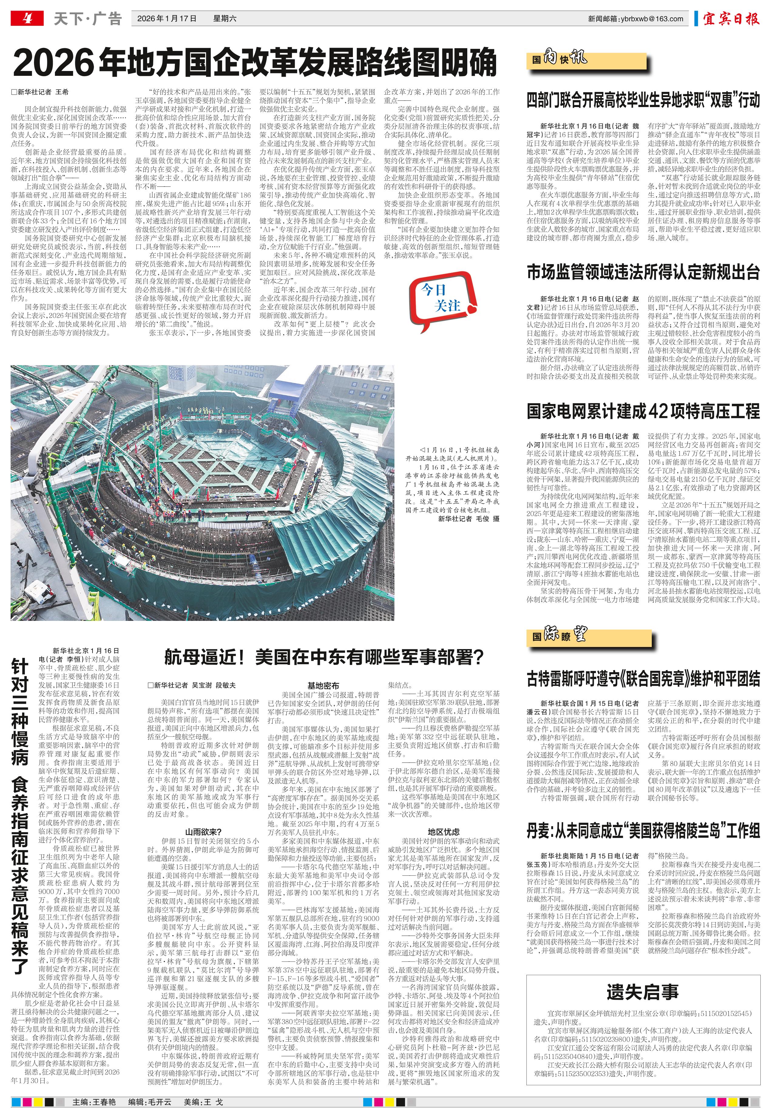 <div style='font-size: 22px!important;line-height: 34px!important;text-align: justify!important;color: #000!important'>2026年地方国企改革发展路线图明确</div><div style='font-size: 14px!important;line-height: 22px!important;text-align: left!important;color: #777!important;margin-top: 20px;'>宜宾日报  2026-01-17</div><div><img id='paperImg' style='max-width: 100%;height: auto' src='//img.founderfx.cn/epaper/202601/17/d8eddb56f5b549d7ad9f5b5799dfd0e1/4.jpg' alt='' class='page-img'/></div><p> □新华社记者 王希</p><p> 因企制宜提升科技创新能力,做强做优主业实业,深化国资国企改革……国务院国资委日前举行的地方国资委负责人会议,为新一年国资国企圈定重点任务。</p><p> 创新是企业经营最重要的品质。近年来,地方国资国企持续强化科技创新,在科技投入、创新机制、创新生态等领域打出“组合拳”——</p><p> 上海成立国资公益基金会,资助从事基础研究、应用基础研究的科研主体;在重庆,市属国企与50余所高校院所达成合作项目107个,多形式共建创新联合体33个;全国已有16个地方国资委建立研发投入产出评价制度……</p><p> 国务院国资委研究中心创新发展研究处研究员戚悦表示,当前,科技创新范式深刻变化、产业迭代周期缩短,国有企业进一步提升科技创新能力的任务艰巨。戚悦认为,地方国企具有贴近市场、贴近需求、场景丰富等优势,可以在科技攻关、成果转化等方面有更大作为。</p><p> 国务院国资委主任张玉卓在此次会议上表示,2026年国资国企要在培育科技领军企业、加快成果转化应用、培育良好创新生态等方面持续发力。</p><p> “好的技术和产品是用出来的。”张玉卓强调,各地国资委要指导企业健全产学研成果对接和产业化机制,打造一批高价值和综合性应用场景,加大首台(套)装备、首批次材料、首版次软件的采购力度,助力新技术、新产品加快迭代升级。</p><p> 国有经济布局优化和结构调整是做强做优做大国有企业和国有资本的内在要求。近年来,各地国企在聚焦实业主业、优化布局结构方面动作不断——</p><p> 山西省属企业建成智能化煤矿186座,煤炭先进产能占比超95%;山东开展战略性新兴产业培育发展三年行动等,对遴选出的项目精准赋能;在湖南,省级低空经济集团正式组建,打造低空经济产业集群;北京积极布局脑机接口、具身智能等未来产业……</p><p> 在中国社会科学院经济研究所副研究员张弛看来,加大布局结构调整优化力度,是国有企业适应产业变革、实现自身发展的需要,也是履行功能使命的必然选择。“国有企业集中在国民经济命脉等领域,传统产业比重较大,面临着转型任务,未来要精准布局在时代感更强、成长性更好的领域,努力开启增长的‘第二曲线’。”他说。</p><p> 张玉卓表示,下一步,各地国资委要以编制“十五五”规划为契机,紧紧围绕推动国有资本“三个集中”,指导企业做强做优主业实业。</p><p> 在打造新兴支柱产业方面,国务院国资委要求各地紧密结合地方产业政策、区域资源禀赋、国资国企实际,推动企业通过内生发展、整合并购等方式加力布局,培育更多能够引领产业升级、抢占未来发展制高点的新兴支柱产业。</p><p> 在优化提升传统产业方面,张玉卓说,各地要在主业管理、投资管控、业绩考核、国有资本经营预算等方面强化政策引导,推动传统产业加快高端化、智能化、绿色化发展。</p><p> “特别要高度重视人工智能这个关键变量,支持各地国企参与中央企业‘AI+’专项行动,共同打造一批高价值场景,持续深化智能工厂梯度培育行动,全方位赋能千行百业。”他强调。</p><p> 未来5年,各种不确定难预料的风险因素明显增多,统筹发展和安全任务更加艰巨。应对风险挑战,深化改革是“治本之方”。</p><p> 近年来,国企改革三年行动、国有企业改革深化提升行动接力推进,国有企业在破除深层次体制机制障碍中展现新面貌、激发新活力。</p><p> 改革如何“更上层楼”?此次会议提出,着力实施进一步深化国资国企改革方案,并划出了2026年的工作重点——</p><p> 完善中国特色现代企业制度。强化党委(党组)前置研究实质性把关,分类分层厘清各治理主体的权责事项,结合实际具体化、清单化。</p><p> 健全市场化经营机制。深化三项制度改革,持续提升经理层成员任期制契约化管理水平,严格落实管理人员末等调整和不胜任退出制度,指导科技型企业规范用好激励政策,不断提升激励的有效性和科研骨干的获得感。</p><p> 加快企业组织形态变革。各地国资委要指导企业重新审视现有的组织架构和工作流程,持续推动扁平化改造和智能化管理。</p><p> “国有企业要加快建立更加符合知识经济时代特征的企业管理体系,打造敏捷、高效的创新型组织,缩短管理链条,推动效率革命。”张玉卓说。</p>