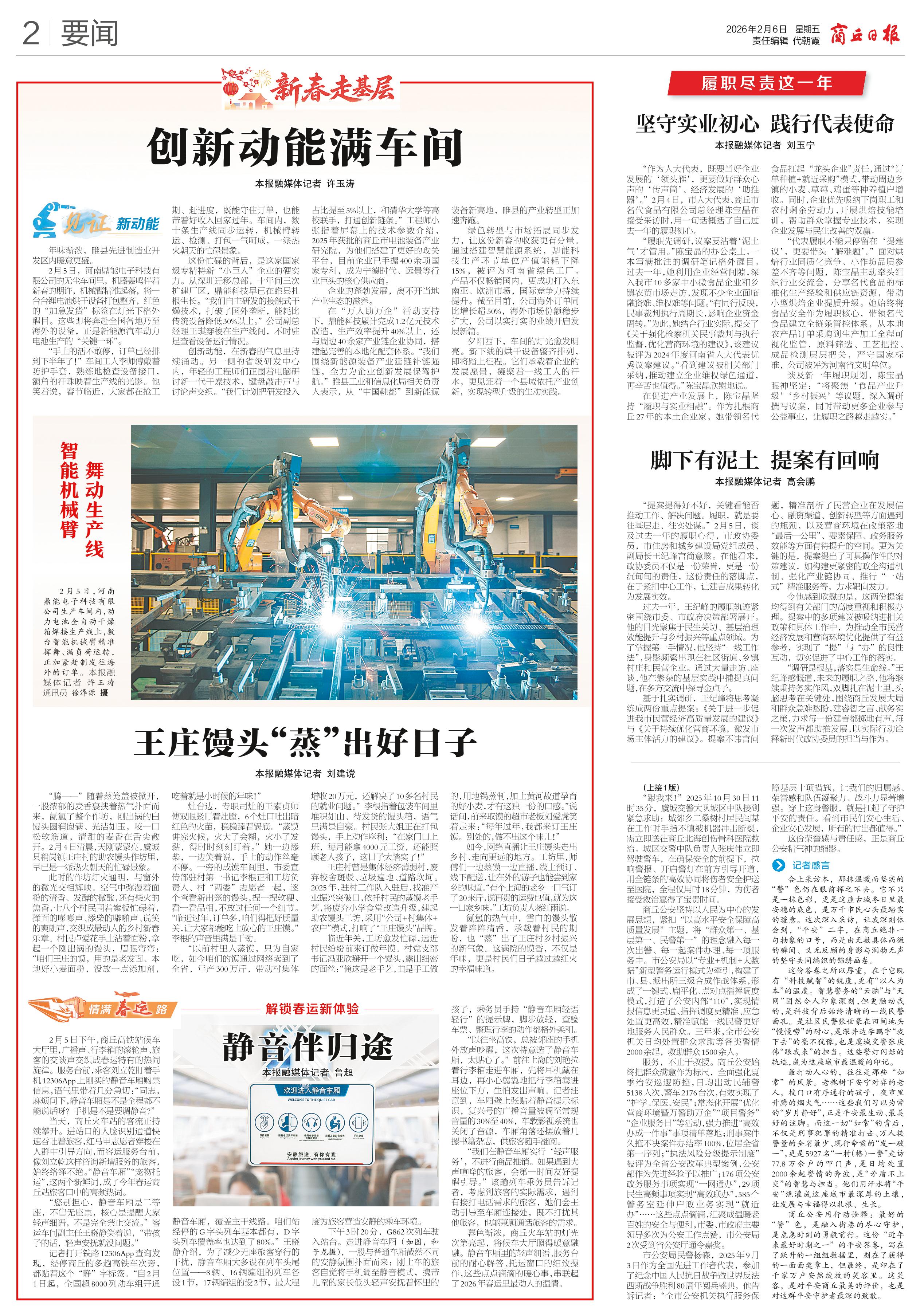 <div style='font-size: 22px!important;line-height: 34px!important;text-align: justify!important;color: #000!important'>坚守实业初心 践行代表使命</div><div style='font-size: 14px!important;line-height: 22px!important;text-align: left!important;color: #777!important;margin-top: 20px;'>商丘日报云阅读  本报融媒体记者 刘玉宁  2026-02-06</div><div><img id='paperImg' style='max-width: 100%;height: auto' src='//img.founderfx.cn/epaper/202602/06/e5f568bec1374068ab3247f19f08242a/2.jpg' alt='' class='page-img'/></div><p> “作为人大代表,既要当好企业发展的‘领头雁’,更要做好群众心声的‘传声筒’、经济发展的‘助推器’。”2月4日,市人大代表、商丘市名代食品有限公司总经理陈宝晶在接受采访时,用一句话概括了自己过去一年的履职初心。</p><p> “履职先调研,议案要沾着‘泥土气’才管用。”陈宝晶的办公桌上,一本写满批注的调研笔记格外醒目。过去一年,她利用企业经营间隙,深入我市10多家中小微食品企业和乡镇农贸市场走访,发现不少企业面临融资难、维权难等问题。“有同行反映,民事裁判执行周期长,影响企业资金周转。”为此,她结合行业实际,提交了《关于强化检察机关民事裁判与执行监督,优化营商环境的建议》,该建议被评为2024年度河南省人大代表优秀议案建议。“看到建议被相关部门采纳,推动建立企业维权绿色通道,再辛苦也值得。”陈宝晶欣慰地说。</p><p> 在促进产业发展上,陈宝晶坚持“履职与实业相融”。作为扎根商丘27年的本土企业家,她带领名代食品扛起“龙头企业”责任,通过“订单种植+就近采购”模式,带动周边乡镇的小麦、草莓、鸡蛋等种养植户增收。同时,企业优先吸纳下岗职工和农村剩余劳动力,开展烘焙技能培训,帮助群众掌握专业技术,实现企业发展与民生改善的双赢。</p><p> “代表履职不能只停留在‘提建议’,更要带头‘解难题’。”面对烘焙行业同质化竞争、小作坊品质参差不齐等问题,陈宝晶主动牵头组织行业交流会,分享名代食品的标准化生产经验和供应链资源,带动小型烘焙企业提质升级。她始终将食品安全作为履职核心,带领名代食品建立全链条管控体系,从本地农产品订单采购到生产加工全程可视化监管,原料筛选、工艺把控、成品检测层层把关,严守国家标准,公司被评为河南省文明单位。</p><p> 谈及新一年履职规划,陈宝晶眼神坚定:“将聚焦‘食品产业升级’‘乡村振兴’等议题,深入调研撰写议案,同时带动更多企业参与公益事业,让履职之路越走越实。”</p>