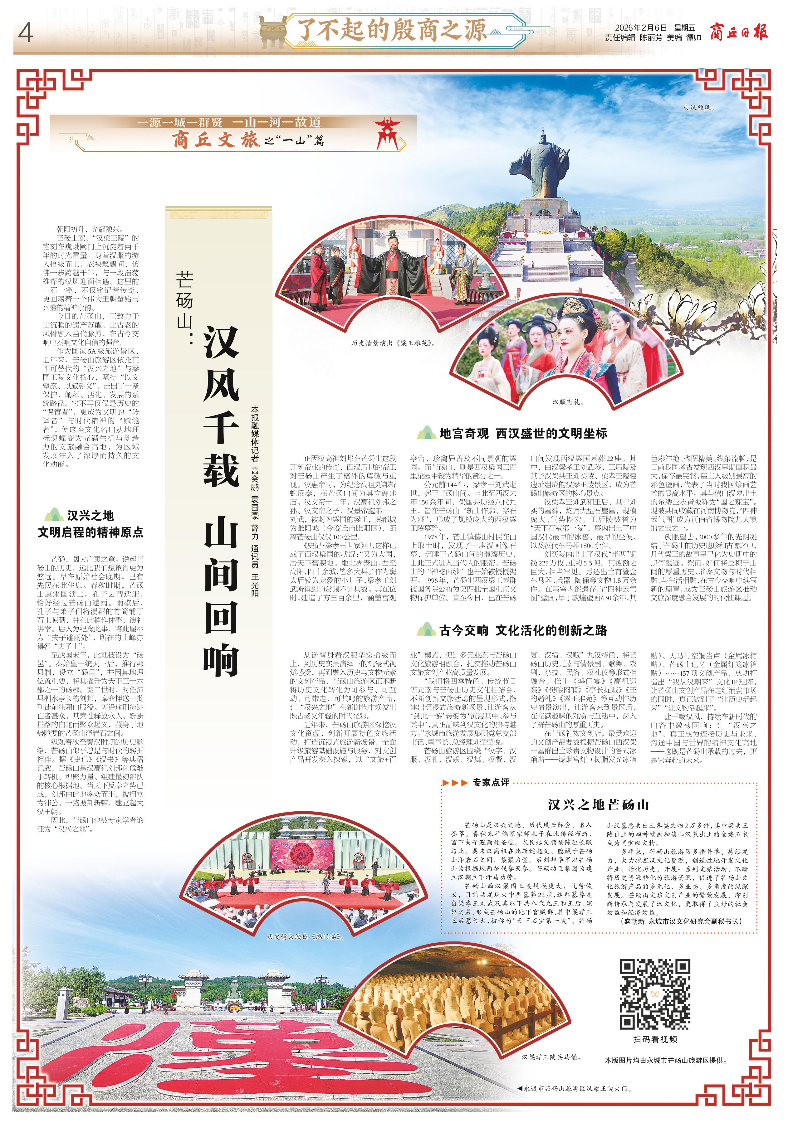 <div style='font-size: 16px!important;line-height: 28px!important;text-align: justify;color: #777!important;'>芒砀山:</div><div style='font-size: 22px!important;line-height: 34px!important;text-align: justify!important;color: #000!important'>汉风千载 山间回响</div><div style='font-size: 14px!important;line-height: 22px!important;text-align: left!important;color: #777!important;margin-top: 20px;'>商丘日报云阅读  本报融媒体记者 高会鹏 袁国豪 薛力 通讯员 王光阳 本版图片均由永城市芒砀山旅游区提供。  2026-02-06</div><div><img id='paperImg' style='max-width: 100%;height: auto' src='//img.founderfx.cn/epaper/202602/06/e5f568bec1374068ab3247f19f08242a/4.jpg' alt='' class='page-img'/></div><div style='font-size: 14px!important;line-height: 22px!important;text-align: center!important;color: #777!important;'><img src='//img.founderfx.cn/epaper/202602/06/e5f568bec1374068ab3247f19f08242a/04/0206_4a_s.jpg'style='display: block!important;margin: auto!important;max-width: 100%!important;'/> 大汉雄风。