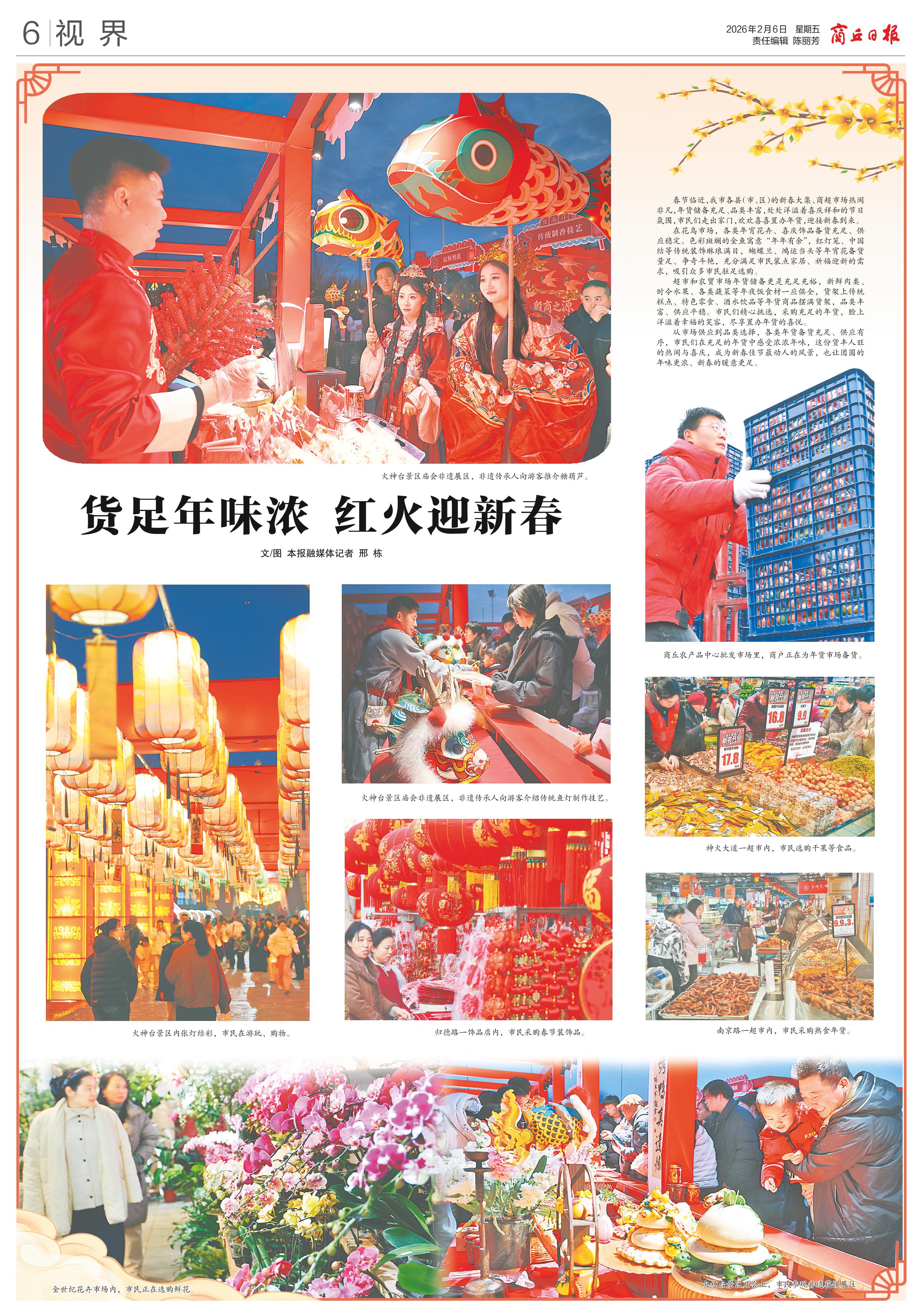 <div style='font-size: 22px!important;line-height: 34px!important;text-align: justify!important;color: #000!important'>货足年味浓 红火迎新春</div><div style='font-size: 14px!important;line-height: 22px!important;text-align: left!important;color: #777!important;margin-top: 20px;'>商丘日报云阅读  文/图 本报融媒体记者 邢 栋  2026-02-06</div><div><img id='paperImg' style='max-width: 100%;height: auto' src='//img.founderfx.cn/epaper/202602/06/e5f568bec1374068ab3247f19f08242a/6.jpg' alt='' class='page-img'/></div><div style='font-size: 14px!important;line-height: 22px!important;text-align: center!important;color: #777!important;'><img src='//img.founderfx.cn/epaper/202602/06/e5f568bec1374068ab3247f19f08242a/06/3372678_gm_1770274998999_s.jpg'style='display: block!important;margin: auto!important;max-width: 100%!important;'/> 火神台景区庙会非遗展区,非遗传承人向游客推介糖葫芦。<img src='//img.founderfx.cn/epaper/202602/06/e5f568bec1374068ab3247f19f08242a/06/0206_6b_s.jpg'style='display: block!important;margin: auto!important;max-width: 100%!important;'/> 商丘农产品中心批发市场里,商户正在为年货市场备货。<img src='//img.founderfx.cn/epaper/202602/06/e5f568bec1374068ab3247f19f08242a/06/3372642_gm_1770275526875_s.jpg'style='display: block!important;margin: auto!important;max-width: 100%!important;'/> 神火大道一超市内,市民选购干果等食品。<img src='//img.founderfx.cn/epaper/202602/06/e5f568bec1374068ab3247f19f08242a/06/3372664_gm_1770277291465_s.jpg'style='display: block!important;margin: auto!important;max-width: 100%!important;'/> 火神台景区庙会非遗展区,非遗传承人向游客介绍传统鱼灯制作技艺。<img src='//img.founderfx.cn/epaper/202602/06/e5f568bec1374068ab3247f19f08242a/06/3372627_gm_1770280005342_s.jpg'style='display: block!important;margin: auto!important;max-width: 100%!important;'/> 火神台景区内张灯结彩,市民在游玩、购物。<img src='//img.founderfx.cn/epaper/202602/06/e5f568bec1374068ab3247f19f08242a/06/3372625_gm_1770275477253_s.jpg'style='display: block!important;margin: auto!important;max-width: 100%!important;'/> 归德路一饰品店内,市民采购春节装饰品。<img src='//img.founderfx.cn/epaper/202602/06/e5f568bec1374068ab3247f19f08242a/06/3372623_gm_1770275704143_s.jpg'style='display: block!important;margin: auto!important;max-width: 100%!important;'/> 南京路一超市内,市民采购熟食年货。<img src='//img.founderfx.cn/epaper/202602/06/e5f568bec1374068ab3247f19f08242a/06/0206_6a_s.jpg'style='display: block!important;margin: auto!important;max-width: 100%!important;'/> 金世纪花卉市场内,市民正在选购鲜花。