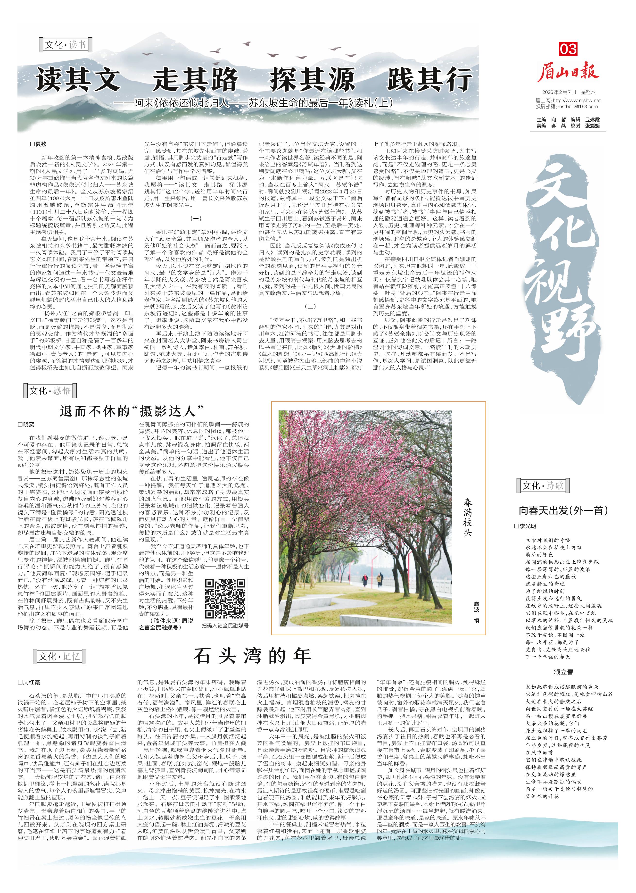 <div style='font-size: 22px!important;line-height: 34px!important;text-align: justify!important;color: #000!important'>退而不休的“摄影达人”</div><div style='font-size: 14px!important;line-height: 22px!important;text-align: left!important;color: #777!important;margin-top: 20px;'>眉山日报  2026-02-07</div><div><img id='paperImg' style='max-width: 100%;height: auto' src='//img.founderfx.cn/epaper/202602/07/b38b4e266ac749eab6685cddfb436d85/3.jpg' alt='' class='page-img'/></div><div style='font-size: 14px!important;line-height: 22px!important;text-align: center!important;color: #777!important;'><img src='//img.founderfx.cn/epaper/202602/07/b38b4e266ac749eab6685cddfb436d85/03/2500907d-1_s.jpg'style='display: block!important;margin: auto!important;max-width: 100%!important;'/> 扫码入驻全民融媒号</div><p> □晓奕</p><p> 在我们融媒圈的微信群里,逸灵老师是个可爱的存在。他用镜头记录的日常,总能在不经意间,勾起大家对生活本真的共鸣。我与他素未谋面,所有认知都来源于群里的动态分享。</p><p> 他的摄影题材,始终聚焦于眉山的烟火寻常——三苏祠售票窗口那抹标志性的东坡式微笑,镜头捕捉得恰到好处,既有工作人员的干练姿态,又能让人透过画面感受到那份发自内心的真诚,仿佛能听到她对游客耐心答疑的温和语气;金秋时节的三苏祠,在他的镜头下满是“橙黄橘绿”的诗意,阳光透过枝叶洒在青石板上的斑驳光影,落在飞檐翘角上的余晖,都被定格,没有刻意摆拍的痕迹,却尽显古建与自然交融的韵味。</p><p> 眉山第二届文艺新作大赛期间,他连续几天在群里更新现场照片。舞台上舞者跳跃旋转的瞬间,灯光下舒展的肢体线条,观众席里专注的神情,都被他精准捕捉。群里有同行评论:“抓瞬间的能力太绝了,很有感染力。”他只简单回复:“现场氛围好,随手记录而已。”没有丝毫炫耀,透着一种纯粹的记录热忱。还有一次,他分享了一组“旗袍香风氤氲竹林”的团建照片,画面里的人身着旗袍,在竹林间舒展身姿,既有古典韵味,又不失生活气息,群里不少人感慨:“原来日常团建也能拍出这么有质感的画面。”</p><p> 除了摄影,群里偶尔也会看到他分享广场舞的动态。不是专业的舞蹈视频,而是他在跳舞间隙抓拍的同伴们的瞬间——舒展的舞姿、开怀的笑容、休息时的闲谈,都被他一一收入镜头。他在群里说:“退休了,总得找点事儿做,跳舞锻炼身体,拍照留住快乐,两全其美。”简单的一句话,道出了他退休生活的状态。从他的分享中能看出,他不仅自己享受这份乐趣,还愿意把这份快乐通过镜头传递给更多人。</p><p> 在快节奏的生活里,逸灵老师的存在像一种提醒。我们每天忙于追逐宏大的选题、策划复杂的活动,却常常忽略了身边最真实的烟火气息。而他用最朴素的方式,用镜头记录着这座城市的细微变化,记录着普通人的喜怒哀乐,这种不掺杂功利心的记录,反而更具打动人心的力量。就像群里一位前辈说的:“逸灵老师的作品,让我们重新思考,传播的本质是什么?或许就是对生活最本真的呈现。”</p><p> 我至今不知道逸灵老师的具体年龄,也不清楚他退休前的职业经历,但这并不影响我对他的认可。在这个微信群里,他更像一个符号,代表着一种积极的生活态度——退休不是人生的终点,而是另一种生活的开始。他用摄影和广场舞,把退休生活过得充实而有意义,这种对生活的热爱,不分年龄,不分职业,具有最朴素的感染力。</p><p> (稿件来源:眉说之言全民融媒号)</p>