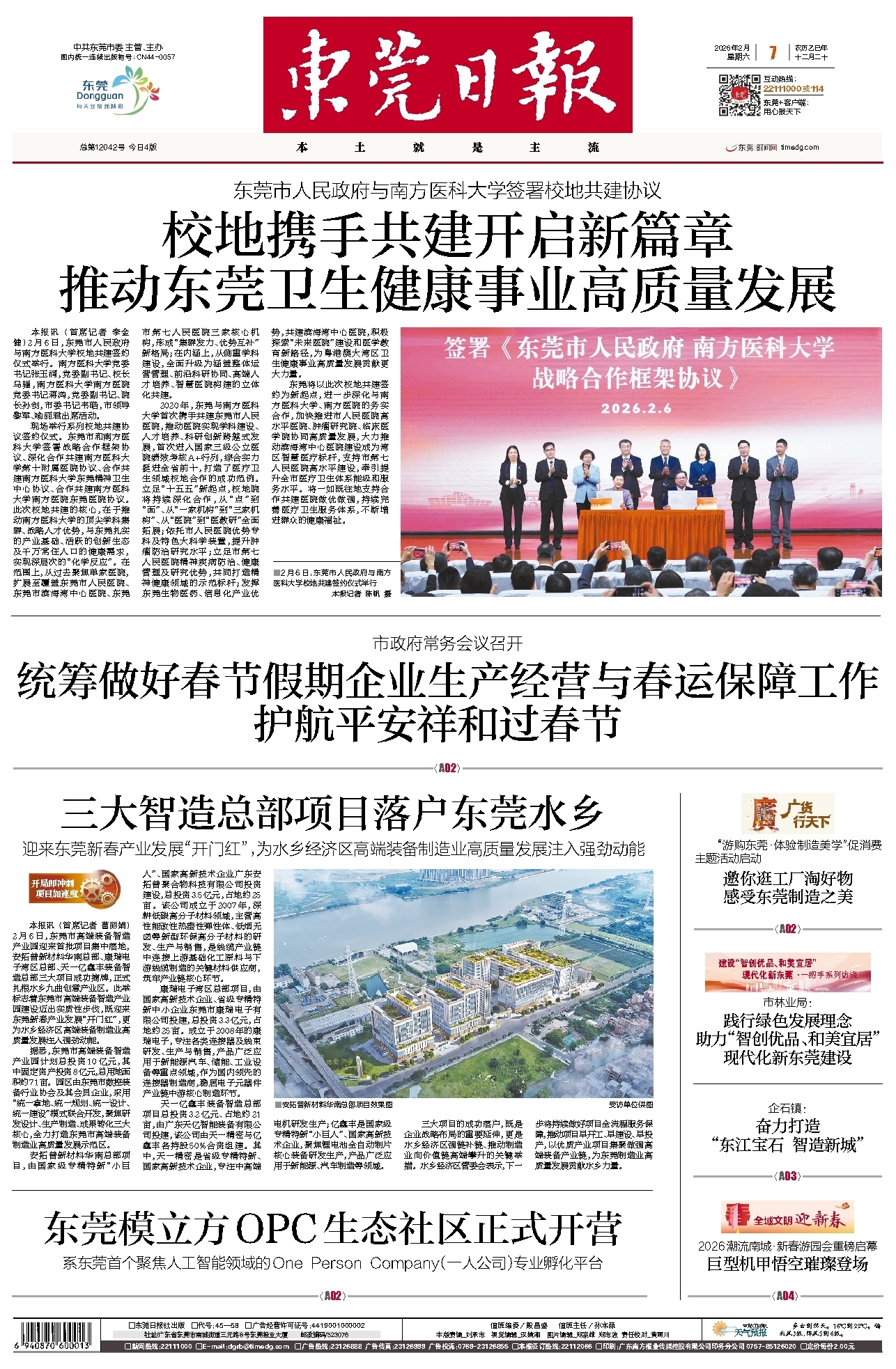 <div style='font-size: 16px!important;line-height: 28px!important;text-align: justify;color: #777!important;'>东莞市人民政府与南方医科大学签署校地共建协议</div><div style='font-size: 22px!important;line-height: 34px!important;text-align: justify!important;color: #000!important'>校地携手共建开启新篇章 推动东莞卫生健康事业高质量发展</div><div style='font-size: 14px!important;line-height: 22px!important;text-align: left!important;color: #777!important;margin-top: 20px;'>东莞日报  首席记者 李金健  2026-02-07</div><div><img id='paperImg' style='max-width: 100%;height: auto' src='//img.founderfx.cn/epaper/202602/07/655fa86f4d8d432e9a1fa8a25e9be40c/1.jpg' alt='' class='page-img'/></div><div style='font-size: 14px!important;line-height: 22px!important;text-align: center!important;color: #777!important;'><img src='//img.founderfx.cn/epaper/202602/07/655fa86f4d8d432e9a1fa8a25e9be40c/A01/21650223_sm1_1770381662692_s.jpg'style='display: block!important;margin: auto!important;max-width: 100%!important;'/> ■2月6日,东莞市人民政府与南方医科大学校地共建签约仪式举行