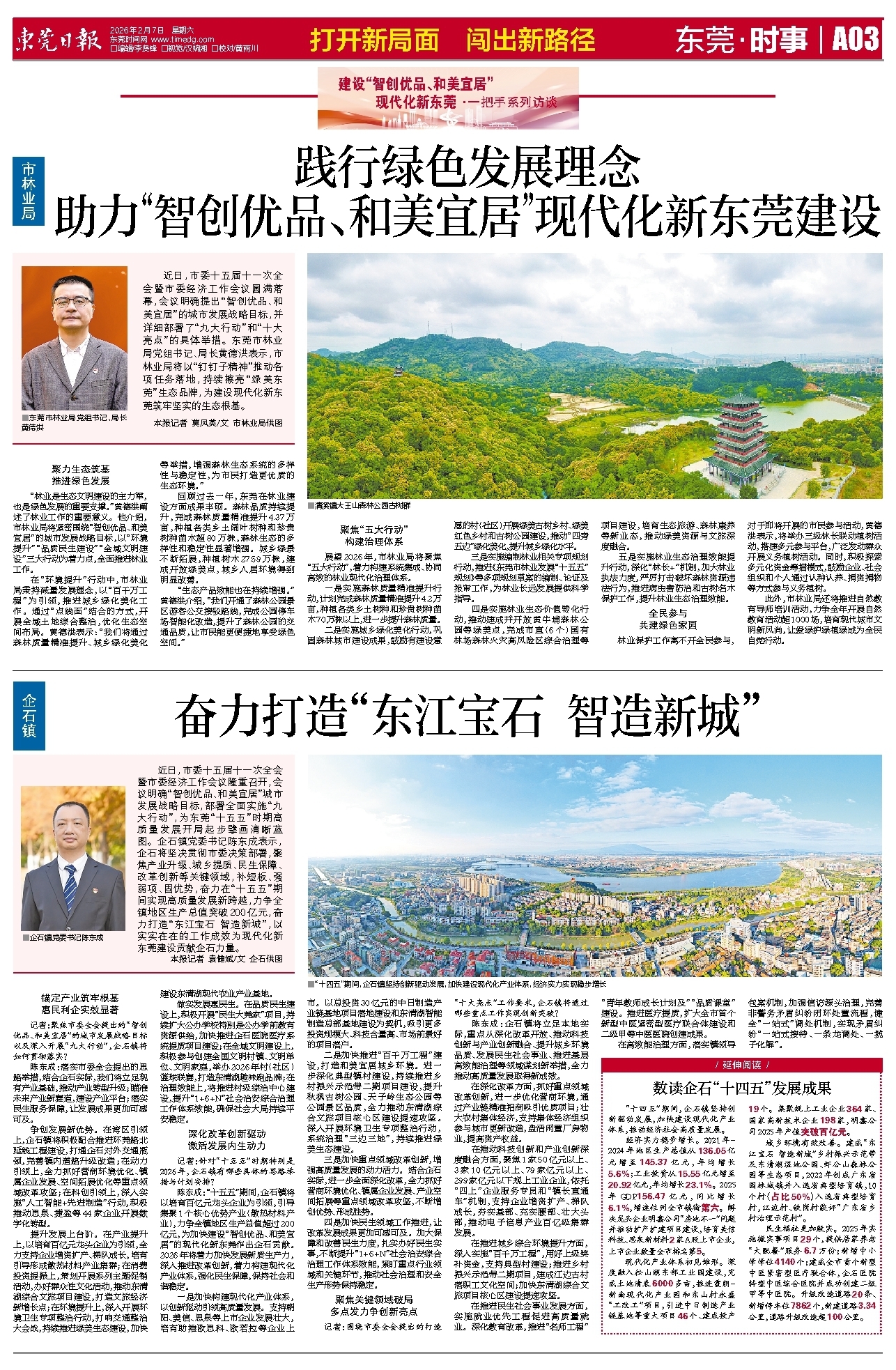 <div style='font-size: 22px!important;line-height: 34px!important;text-align: justify!important;color: #000!important'>市林业局 践行绿色发展理念 助力“智创优品、和美宜居”现代化新东莞建设</div><div style='font-size: 14px!important;line-height: 22px!important;text-align: left!important;color: #777!important;margin-top: 20px;'>东莞日报  本报记者 莫凤英/文 市林业局供图  2026-02-07</div><div><img id='paperImg' style='max-width: 100%;height: auto' src='//img.founderfx.cn/epaper/202602/07/655fa86f4d8d432e9a1fa8a25e9be40c/3.jpg' alt='' class='page-img'/></div><div style='font-size: 14px!important;line-height: 22px!important;text-align: center!important;color: #777!important;'><img src='//img.founderfx.cn/epaper/202602/07/655fa86f4d8d432e9a1fa8a25e9be40c/A03/21649774_sm1_1770381571562_s.jpg'style='display: block!important;margin: auto!important;max-width: 100%!important;'/> ■东莞市林业局党组书记、局长黄德洪<img src='//img.founderfx.cn/epaper/202602/07/655fa86f4d8d432e9a1fa8a25e9be40c/A03/21649778_sm1_1770381585562_s.jpg'style='display: block!important;margin: auto!important;max-width: 100%!important;'/> ■清溪镇大王山森林公园古树群</div><p> 近日,市委十五届十一次全会暨市委经济工作会议圆满落幕,会议明确提出“智创优品、和美宜居”的城市发展战略目标,并详细部署了“九大行动”和“十大亮点”的具体举措。东莞市林业局党组书记、局长黄德洪表示,市林业局将以“钉钉子精神”推动各项任务落地,持续擦亮“绿美东莞”生态品牌,为建设现代化新东莞筑牢坚实的生态根基。</p><p> </p><p> 聚力生态筑基</p><p> 推进绿色发展</p><p> “林业是生态文明建设的主力军,也是绿色发展的重要支撑。”黄德洪阐述了林业工作的重要意义。他介绍,市林业局将紧密围绕“智创优品、和美宜居”的城市发展战略目标,以“环境提升”“品质民生建设”“全域文明建设”三大行动为着力点,全面推进林业工作。</p><p> 在“环境提升”行动中,市林业局秉持减量发展理念,以“百千万工程”为引领,推进城乡绿化美化工作。通过“点线面”结合的方式,开展全域土地综合整治,优化生态空间布局。黄德洪表示:“我们将通过森林质量精准提升、城乡绿化美化等举措,增强森林生态系统的多样性与稳定性,为市民打造更优质的生态环境。”</p><p> 回顾过去一年,东莞在林业建设方面成果丰硕。森林品质持续提升,完成森林质量精准提升4.37万亩,种植各类乡土阔叶树种和珍贵树种苗木超80万株,森林生态的多样性和稳定性显著增强。城乡绿景不断拓展,种植树木27.59万株,建成开放绿美点,城乡人居环境得到明显改善。</p><p> “生态产品效能也在持续增强。”黄德洪介绍,“我们开通了森林公园景区游客公交接驳路线,完成公园停车场智能化改造,提升了森林公园的交通品质,让市民能更便捷地享受绿色空间。”</p><p> 聚焦“五大行动”</p><p> 构建治理体系</p><p> 展望2026年,市林业局将聚焦“五大行动”,着力构建系统集成、协同高效的林业现代化治理体系。</p><p> 一是实施森林质量精准提升行动,计划完成森林质量精准提升4.2万亩,种植各类乡土树种和珍贵树种苗木70万株以上,进一步提升森林质量。</p><p> 二是实施城乡绿化美化行动,巩固森林城市建设成果,鼓励有建设意愿的村(社区)开展绿美古树乡村、绿美红色乡村和古树公园建设,推动“四旁五边”绿化美化,提升城乡绿化水平。</p><p> 三是实施编制林业相关专项规划行动,推进《东莞市林业发展“十五五”规划》等多项规划草案的编制、论证及报审工作,为林业长远发展提供科学指导。</p><p> 四是实施林业生态价值转化行动,推动建成并开放黄牛埔森林公园等绿美点,完成市直(6个)国有林场森林火灾高风险区综合治理等项目建设,培育生态旅游、森林康养等新业态,推动绿美资源与文旅深度融合。</p><p> 五是实施林业生态治理效能提升行动,深化“林长+”机制,加大林业执法力度,严厉打击破坏森林资源违法行为,推进病虫害防治和古树名木保护工作,提升林业生态治理效能。</p><p> 全民参与</p><p> 共建绿色家园</p><p> 林业保护工作离不开全民参与,对于即将开展的市民参与活动,黄德洪表示,将举办三级林长联动植树活动,搭建多元参与平台,广泛发动群众开展义务植树活动。同时,积极探索多元化资金筹措模式,鼓励企业、社会组织和个人通过认种认养、捐资捐物等方式参与义务植树。</p><p> 此外,市林业局还将推进自然教育导师培训活动,力争全年开展自然教育活动超1000场,培育现代城市文明新风尚,让爱绿护绿植绿成为全民自觉行动。</p>