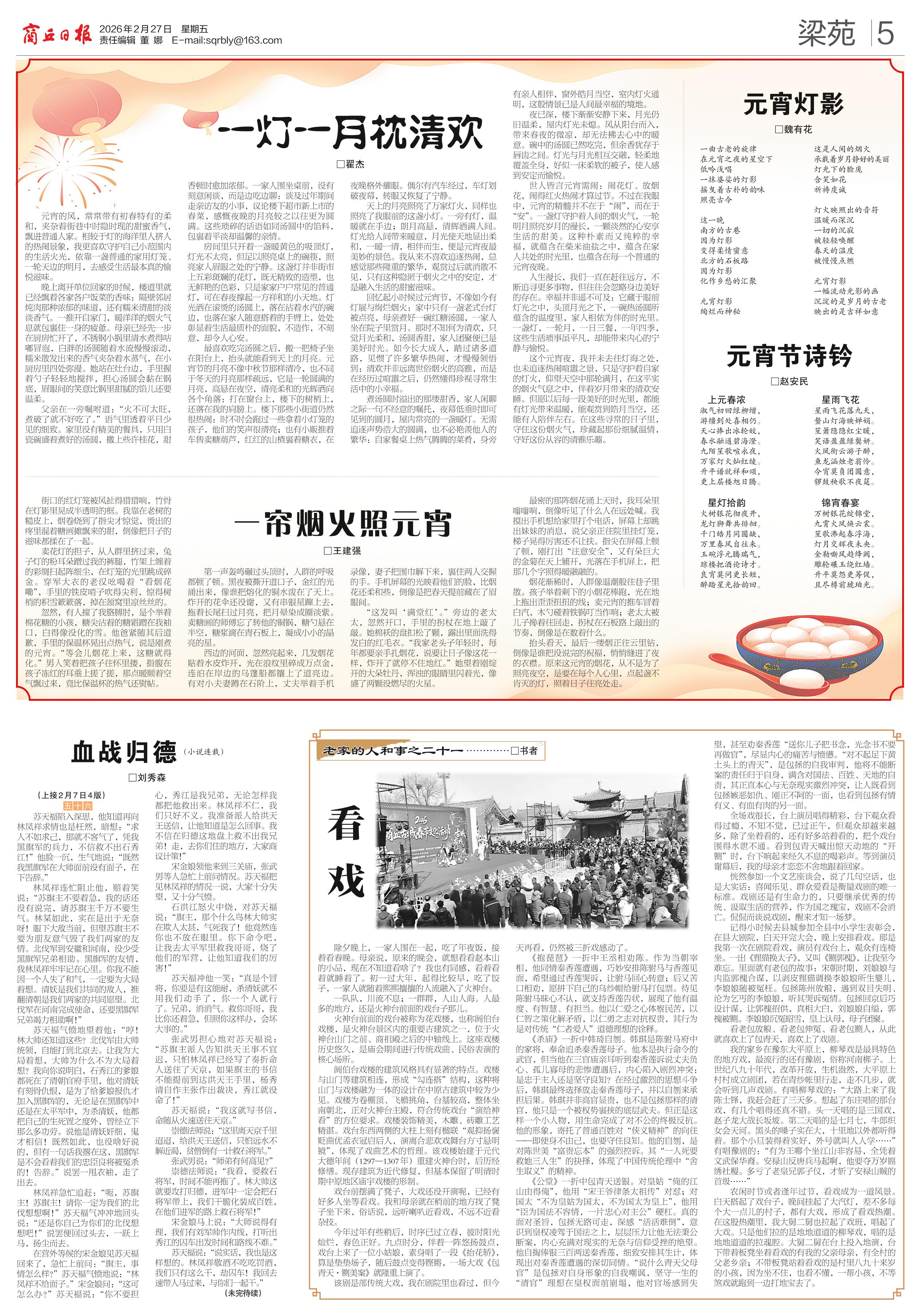 <div style='font-size: 22px!important;line-height: 34px!important;text-align: justify!important;color: #000!important'>元宵灯影</div><div style='font-size: 14px!important;line-height: 22px!important;text-align: left!important;color: #777!important;margin-top: 20px;'>商丘日报云阅读  魏有花  2026-02-27</div><div><img id='paperImg' style='max-width: 100%;height: auto' src='//img.founderfx.cn/epaper/202602/27/d8aac696a9d641588ffd775277f17638/5.jpg' alt='' class='page-img'/></div><p> 一曲古老的旋律</p><p> 在元宵之夜的星空下</p><p> 低吟浅唱</p><p> 一抹婆娑的灯影</p><p> 摇曳着古朴的韵味</p><p> 照亮古今</p><p> </p><p> 这一晚</p><p> 南方的古巷</p><p> 因为灯影</p><p> 变得柔情蜜意</p><p> 北方的石板路</p><p> 因为灯影</p><p> 化作乡愁的汇聚</p><p> </p><p> 元宵灯影</p><p> 绚烂而神秘</p><p> 这是人间的烟火</p><p> 承载着岁月静好的美丽</p><p> 灯光下的脸庞</p><p> 含笑如花</p><p> 祈祷虔诚</p><p> </p><p> 灯火映照出的音符</p><p> 温暖而深沉</p><p> 一切的沉寂</p><p> 被轻轻唤醒</p><p> 春天的温度</p><p> 被慢慢点燃</p><p> </p><p> 元宵灯影</p><p> 一幅流动光影的画</p><p> 沉淀的是岁月的古老</p><p> 映出的是吉祥如意</p>