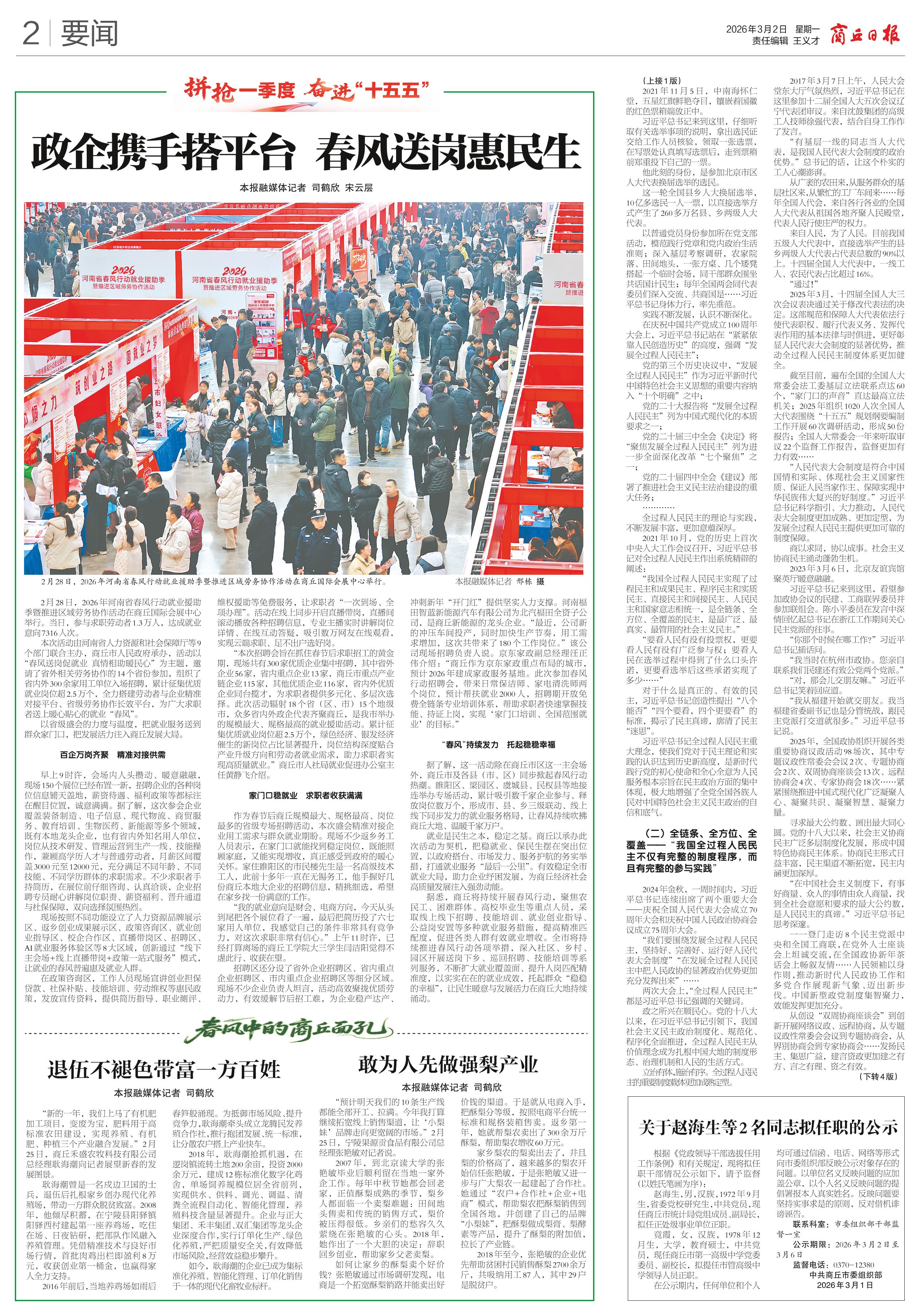 <div style='font-size: 22px!important;line-height: 34px!important;text-align: justify!important;color: #000!important'>“国家一切权力属于人民”</div><div style='font-size: 16px!important;line-height: 28px!important;text-align: justify;color: #777!important;margin-top: 20px;'>——习近平总书记全过程人民民主重大理念的生动实践</div><div style='font-size: 14px!important;line-height: 22px!important;text-align: left!important;color: #777!important;margin-top: 20px;'>商丘日报云阅读  新华社记者  2026-03-02</div><div><img id='paperImg' style='max-width: 100%;height: auto' src='//img.founderfx.cn/epaper/202603/01/23b30c7debb84137843c12250fb2265f/2.jpg' alt='' class='page-img'/></div><p> (上接1版)</p><p> 2021年11月5日,中南海怀仁堂,五星红旗鲜艳夺目,镶嵌着国徽的红色票箱端放正中。</p><p> 习近平总书记来到这里,仔细听取有关选举事项的说明,拿出选民证交给工作人员核验,领取一张选票,在写票处认真填写选票后,走到票箱前郑重投下自己的一票。</p><p> 他此刻的身份,是参加北京市区人大代表换届选举的选民。</p><p> 这一轮全国县乡人大换届选举,10亿多选民一人一票,以直接选举方式产生了260多万名县、乡两级人大代表。</p><p> 以普通党员身份参加所在党支部活动,模范践行党章和党内政治生活准则;深入基层考察调研,农家院落、田间地头,一张方桌、几个矮凳搭起一个临时会场,同干部群众围坐共话国计民生;每年全国两会同代表委员们深入交流、共商国是……习近平总书记身体力行,率先垂范。</p><p> 实践不断发展,认识不断深化。</p><p> 在庆祝中国共产党成立100周年大会上,习近平总书记站在“紧紧依靠人民创造历史”的高度,强调“发展全过程人民民主”;</p><p> 党的第三个历史决议中,“发展全过程人民民主”作为习近平新时代中国特色社会主义思想的重要内容纳入“十个明确”之中;</p><p> 党的二十大报告将“发展全过程人民民主”列为中国式现代化的本质要求之一;</p><p> 党的二十届三中全会《决定》将“聚焦发展全过程人民民主”列为进一步全面深化改革“七个聚焦”之一;</p><p> 党的二十届四中全会《建议》部署了推进社会主义民主法治建设的重大任务;</p><p> …………</p><p> 全过程人民民主的理论与实践,不断发展丰富,更加意蕴深厚。</p><p> 2021年10月,党的历史上首次中央人大工作会议召开,习近平总书记对全过程人民民主作出系统精辟的阐述:</p><p> “我国全过程人民民主实现了过程民主和成果民主、程序民主和实质民主、直接民主和间接民主、人民民主和国家意志相统一,是全链条、全方位、全覆盖的民主,是最广泛、最真实、最管用的社会主义民主。”</p><p> “要看人民有没有投票权,更要看人民有没有广泛参与权;要看人民在选举过程中得到了什么口头许诺,更要看选举后这些承诺实现了多少……”</p><p> 对于什么是真正的、有效的民主,习近平总书记创造性提出“八个能否”“四个要看,四个更要看”的标准,揭示了民主真谛,廓清了民主“迷思”。</p><p> 习近平总书记全过程人民民主重大理念,使我们党对于民主理论和实践的认识达到历史新高度,是新时代践行党的初心使命和全心全意为人民服务根本宗旨在民主政治方面的集中体现,极大地增强了全党全国各族人民对中国特色社会主义民主政治的自信和底气。</p><p> </p><p> (二)全链条、全方位、全覆盖——“我国全过程人民民主不仅有完整的制度程序,而且有完整的参与实践”</p><p> </p><p> 2024年金秋,一周时间内,习近平总书记连续出席了两个重要大会——庆祝全国人民代表大会成立70周年大会和庆祝中国人民政治协商会议成立75周年大会。</p><p> “我们要围绕发展全过程人民民主,坚持好、完善好、运行好人民代表大会制度”“在发展全过程人民民主中把人民政协的显著政治优势更加充分发挥出来”……</p><p> 两次大会上,“全过程人民民主”都是习近平总书记强调的关键词。</p><p> 政之所兴在顺民心。党的十八大以来,在习近平总书记引领下,我国社会主义民主政治制度化、规范化、程序化全面推进,全过程人民民主从价值理念成为扎根中国大地的制度形态、治理机制和人民的生活方式。</p><p> 立治有体,施治有序。全过程人民民主的重要制度载体更加成熟定型。</p><p> 2017年3月7日上午,人民大会堂东大厅气氛热烈,习近平总书记在这里参加十二届全国人大五次会议辽宁代表团审议。来自沈鼓集团的高级工人技师徐强代表,结合自身工作作了发言。</p><p> “有基层一线的同志当人大代表,是我国人民代表大会制度的政治优势。”总书记的话,让这个朴实的工人心潮澎湃。</p><p> 从广袤的农田来,从服务群众的基层社区来,从繁忙的工厂车间来……每年全国人代会,来自各行各业的全国人大代表从祖国各地齐聚人民殿堂,代表人民行使庄严的权力。</p><p> 来自人民,为了人民。目前我国五级人大代表中,直接选举产生的县乡两级人大代表占代表总数的90%以上。十四届全国人大代表中,一线工人、农民代表占比超过16%。</p><p> “通过!”</p><p> 2025年3月,十四届全国人大三次会议表决通过关于修改代表法的决定。这部规范和保障人大代表依法行使代表职权、履行代表义务、发挥代表作用的基本法律与时俱进,更好彰显人民代表大会制度的显著优势,推动全过程人民民主制度体系更加健全。</p><p> 截至目前,遍布全国