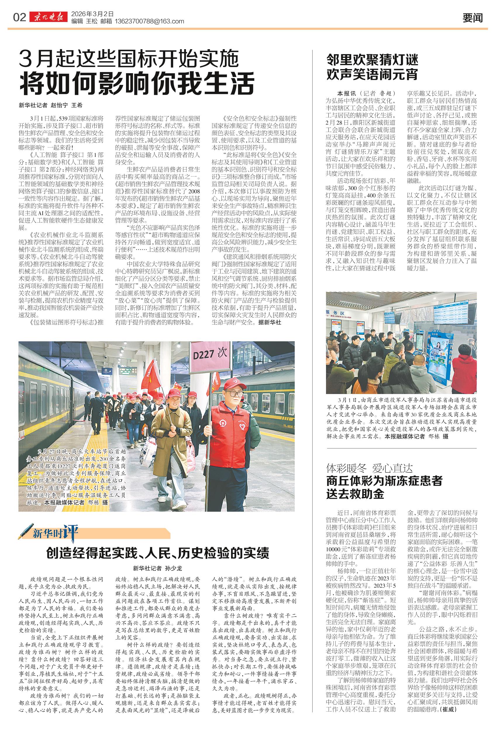 <div style='font-size: 16px!important;line-height: 28px!important;text-align: justify;color: #777!important;'>3月起这些国标开始实施</div><div style='font-size: 22px!important;line-height: 34px!important;text-align: justify!important;color: #000!important'>将如何影响你我生活</div><div style='font-size: 14px!important;line-height: 22px!important;text-align: left!important;color: #777!important;margin-top: 20px;'>京九晚报云阅读  新华社记者 赵怡宁 王希  2026-03-02</div><div><img id='paperImg' style='max-width: 100%;height: auto' src='//img.founderfx.cn/epaper/202603/01/e5d50d7061b547bd99714c8623284b7a/2.jpg' alt='' class='page-img'/></div><p> 3月1日起,539项国家标准将开始实施,涉及算子接口、超市销售生鲜农产品管理、安全色和安全标志等领域。我们的生活将受到哪些影响?一起来看!</p><p> 《人工智能 算子接口 第1部分:基础数学类》和《人工智能 算子接口 第2部分:神经网络类》两项推荐性国家标准,分别对面向人工智能领域的基础数学类和神经网络类算子接口的参数信息、接口一致性等内容作出规定。据了解,标准的实施将提升软件与各种不同主流AI处理器之间的适配性,促进人工智能软硬件生态健康发展。</p><p> 《农业机械作业北斗监测系统》推荐性国家标准规定了农业机械作业北斗监测系统的组成、终端要求等。《农业机械北斗自动驾驶系统》推荐性国家标准规定了农业机械北斗自动驾驶系统的组成、技术要求等。据市场监管总局介绍,这两项标准的实施有助于规范相关农业机械产品的研发、配置、安装与检测,提高农机作业精度与效率,推动我国智能农机装备产业快速发展。</p><p> 《包装储运图形符号标志》推荐性国家标准规定了储运包装图形符号标志的名称、样式等。标准的实施将提升包装物在储运过程中的稳定性,减少因包装不当导致的破损、泄漏等安全事故,保障产品安全和运输人员及消费者的人身安全。</p><p> 生鲜农产品是消费者日常生活中购买频率最高的商品之一。《超市销售生鲜农产品管理技术规范》推荐性国家标准替代了2008年发布的《超市销售生鲜农产品基本要求》,规定了超市销售生鲜农产品的环境布局、设施设备、经营管理等要求。</p><p> “光色不应影响产品真实色泽等感官性状”“超市购物通道应保持各方向畅通,做到宽度适宜、通行便利”……上述技术规范作出明确要求。</p><p> 中国农业大学特殊食品研究中心特聘研究员吴广枫说,新标准细化了产品分区分类等要求,禁止“美颜灯”、接入全国农产品质量安全追溯系统等要求为消费者买到“放心菜”“放心肉”提供了保障。同时,新修订的标准增加了生鲜区面积占比、购物通道宽度等内容,有助于提升消费者的购物体验。</p><p> 《安全色和安全标志》强制性国家标准规定了传递安全信息的颜色表征、安全标志的类型及其设置、使用要求,以及工业管道的基本识别色和识别符号。</p><p> “此标准是将《安全色》《安全标志及其使用导则》和《工业管道的基本识别色、识别符号和安全标识》三项标准整合修订而成。”市场监管总局相关司局负责人说。据介绍,本次修订以事故预防为核心、以现场实用为导向,聚焦近年来安全生产事故特点,精准辨识生产经营活动中的风险点,从实际使用需求出发,对标准内容进行了系统性优化。标准的实施将进一步规范安全色和安全标志的使用,提高公众风险辨识能力,减少安全生产事故的发生。</p><p> 《建筑通风和排烟系统用防火阀门》强制性国家标准规定了适用于工业与民用建筑、地下建筑的通风和空气调节系统、厨房排油烟系统中的防火阀门,其分类、材料、配件等内容。标准的实施将为相关防火阀门产品的生产与检验提供技术依据,有助于提升产品质量,切实保障火灾发生时人民群众的生命与财产安全。据新华社</p>