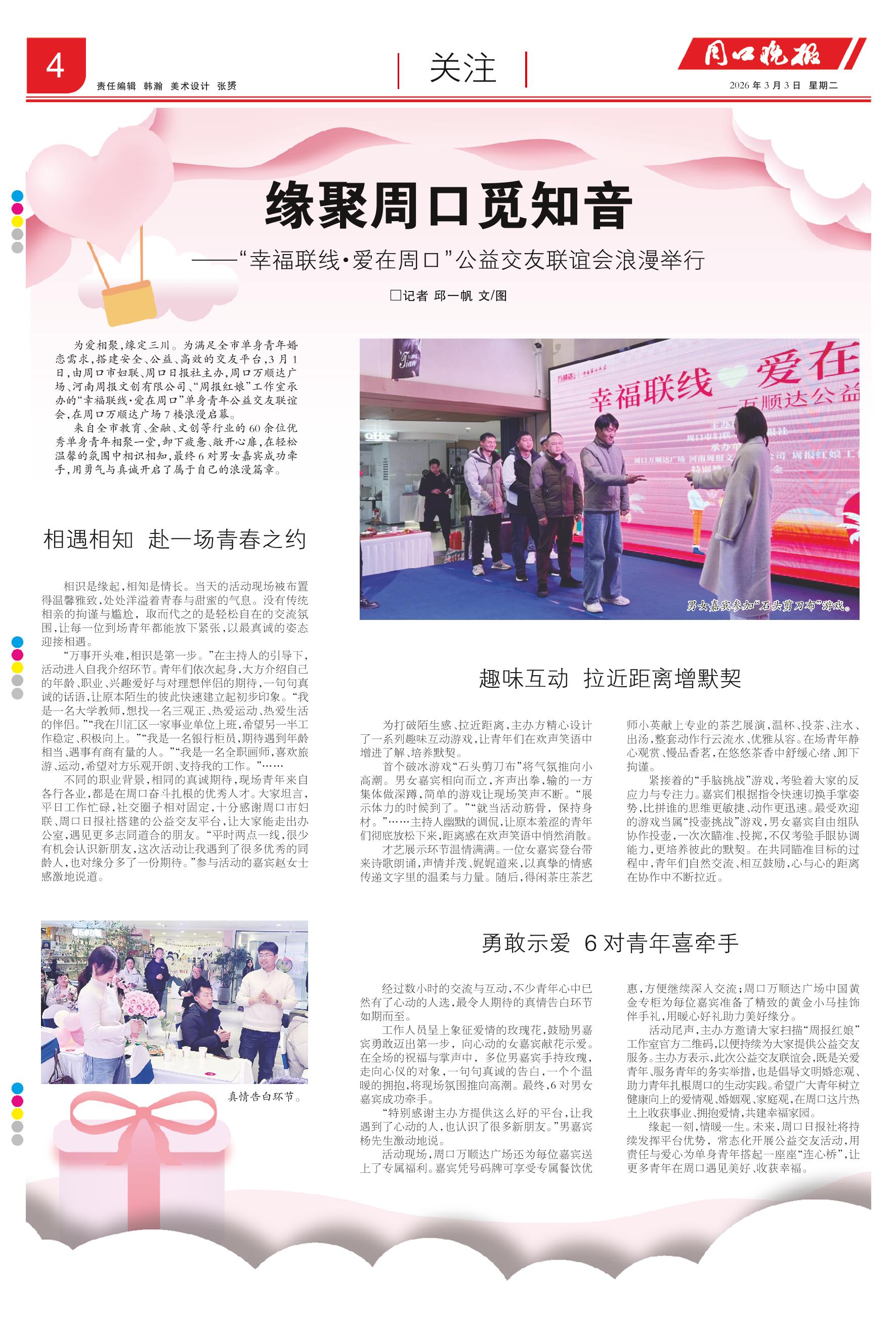 <div style='font-size: 22px!important;line-height: 34px!important;text-align: justify!important;color: #000!important'>缘聚周口觅知音</div><div style='font-size: 16px!important;line-height: 28px!important;text-align: justify;color: #777!important;margin-top: 20px;'>——“幸福联线·爱在周口”公益交友联谊会浪漫举行</div><div style='font-size: 14px!important;line-height: 22px!important;text-align: left!important;color: #777!important;margin-top: 20px;'>周口晚报  2026-03-03</div><div><img id='paperImg' style='max-width: 100%;height: auto' src='//img.founderfx.cn/epaper/202603/02/f20889583d104a66afa3834873527d5f/4.jpg' alt='' class='page-img'/></div><div style='font-size: 14px!important;line-height: 22px!important;text-align: center!important;color: #777!important;'><img src='//img.founderfx.cn/epaper/202603/02/f20889583d104a66afa3834873527d5f/04/762a960f3afbfce373a67678829ce8a8_5_s.jpg'style='display: block!important;margin: auto!important;max-width: 100%!important;'/> 男女嘉宾参加“石头剪刀布”游戏。<img src='//img.founderfx.cn/epaper/202603/02/f20889583d104a66afa3834873527d5f/04/762a960f3afbfce373a67678829ce8a8_12_s.jpg'style='display: block!important;margin: auto!important;max-width: 100%!important;'/> 真情告白环节。</div><p> □记者 邱一帆 文/图</p><p> 为爱相聚,缘定三川。为满足全市单身青年婚恋需求,搭建安全、公益、高效的交友平台,3月1日,由周口市妇联、周口日报社主办,周口万顺达广场、河南周报文创有限公司、“周报红娘”工作室承办的“幸福联线·爱在周口”单身青年公益交友联谊会,在周口万顺达广场7楼浪漫启幕。</p><p> 来自全市教育、金融、文创等行业的60余位优秀单身青年相聚一堂,卸下疲惫、敞开心扉,在轻松温馨的氛围中相识相知,最终6对男女嘉宾成功牵手,用勇气与真诚开启了属于自己的浪漫篇章。</p><p> 相遇相知 赴一场青春之约</p><p> 相识是缘起,相知是情长。当天的活动现场被布置得温馨雅致,处处洋溢着青春与甜蜜的气息。没有传统相亲的拘谨与尴尬,取而代之的是轻松自在的交流氛围,让每一位到场青年都能放下紧张,以最真诚的姿态迎接相遇。</p><p> “万事开头难,相识是第一步。”在主持人的引导下,活动进入自我介绍环节。青年们依次起身,大方介绍自己的年龄、职业、兴趣爱好与对理想伴侣的期待,一句句真诚的话语,让原本陌生的彼此快速建立起初步印象。“我是一名大学教师,想找一名三观正、热爱运动、热爱生活的伴侣。”“我在川汇区一家事业单位上班,希望另一半工作稳定、积极向上。”“我是一名银行柜员,期待遇到年龄相当、遇事有商有量的人。”“我是一名全职画师,喜欢旅游、运动,希望对方乐观开朗、支持我的工作。”……</p><p> 不同的职业背景,相同的真诚期待,现场青年来自各行各业,都是在周口奋斗扎根的优秀人才。大家坦言,平日工作忙碌,社交圈子相对固定,十分感谢周口市妇联、周口日报社搭建的公益交友平台,让大家能走出办公室,遇见更多志同道合的朋友。“平时两点一线,很少有机会认识新朋友,这次活动让我遇到了很多优秀的同龄人,也对缘分多了一份期待。”参与活动的嘉宾赵女士感激地说道。</p><p> 趣味互动 拉近距离增默契</p><p> 为打破陌生感、拉近距离,主办方精心设计了一系列趣味互动游戏,让青年们在欢声笑语中增进了解、培养默契。</p><p> 首个破冰游戏“石头剪刀布”将气氛推向小高潮。男女嘉宾相向而立,齐声出拳,输的一方集体做深蹲,简单的游戏让现场笑声不断。“展示体力的时候到了。”“就当活动筋骨,保持身材。”……主持人幽默的调侃,让原本羞涩的青年们彻底放松下来,距离感在欢声笑语中悄然消散。</p><p> 才艺展示环节温情满满。一位女嘉宾登台带来诗歌朗诵,声情并茂、娓娓道来,以真挚的情感传递文字里的温柔与力量。随后,得闲茶庄茶艺师小英献上专业的茶艺展演,温杯、投茶、注水、出汤,整套动作行云流水、优雅从容。在场青年静心观赏、慢品香茗,在悠悠茶香中舒缓心绪、卸下拘谨。</p><p> 紧接着的“手脑挑战”游戏,考验着大家的反应力与专注力。嘉宾们根据指令快速切换手掌姿势,比拼谁的思维更敏捷、动作更迅速。最受欢迎的游戏当属“投壶挑战”游戏,男女嘉宾自由组队协作投壶,一次次瞄准、投掷,不仅考验手眼协调能力,更培养彼此的默契。在共同瞄准目标的过程中,青年们自然交流、相互鼓励,心与心的距离在协作中不断拉近。</p><p> 勇敢示爱 6对青年喜牵手</p><p> 经过数小时的交流与互动,不少青年心中已然有了心动的人选,最令人期待的真情告白环节如期而至。</p><p> 工作人员呈上象征爱情的玫瑰花,鼓励男嘉宾勇敢迈出第一步,向心动的女嘉宾献花示爱。在全场的祝福与掌声中,多位男嘉宾手持玫瑰,走向心仪的对象,一句句真诚的告白,一个个温暖的拥抱,将现场氛围推向高潮。最终,6对男女嘉宾成功牵手。</p><p> “特别感谢主办方提供这么好的平台,让我遇到了心动的人,也认识了很多新朋友。”男嘉宾杨先生激动地说。</p><p> 活动现场,周口万顺达广场还为每位嘉宾送上了专属福利。嘉宾凭号码牌可享受专属餐饮优惠,方便继续深入交流;周口万顺达广场中国黄金专柜为每位嘉宾准备了精致的黄金小马挂饰伴手礼,用暖心好礼助力美好缘分。</p><p> 活动尾声,主办方邀请大家扫描“周报红娘”工作室官方二维码,以便持续为大家提供公益交友服务。主办方表示,