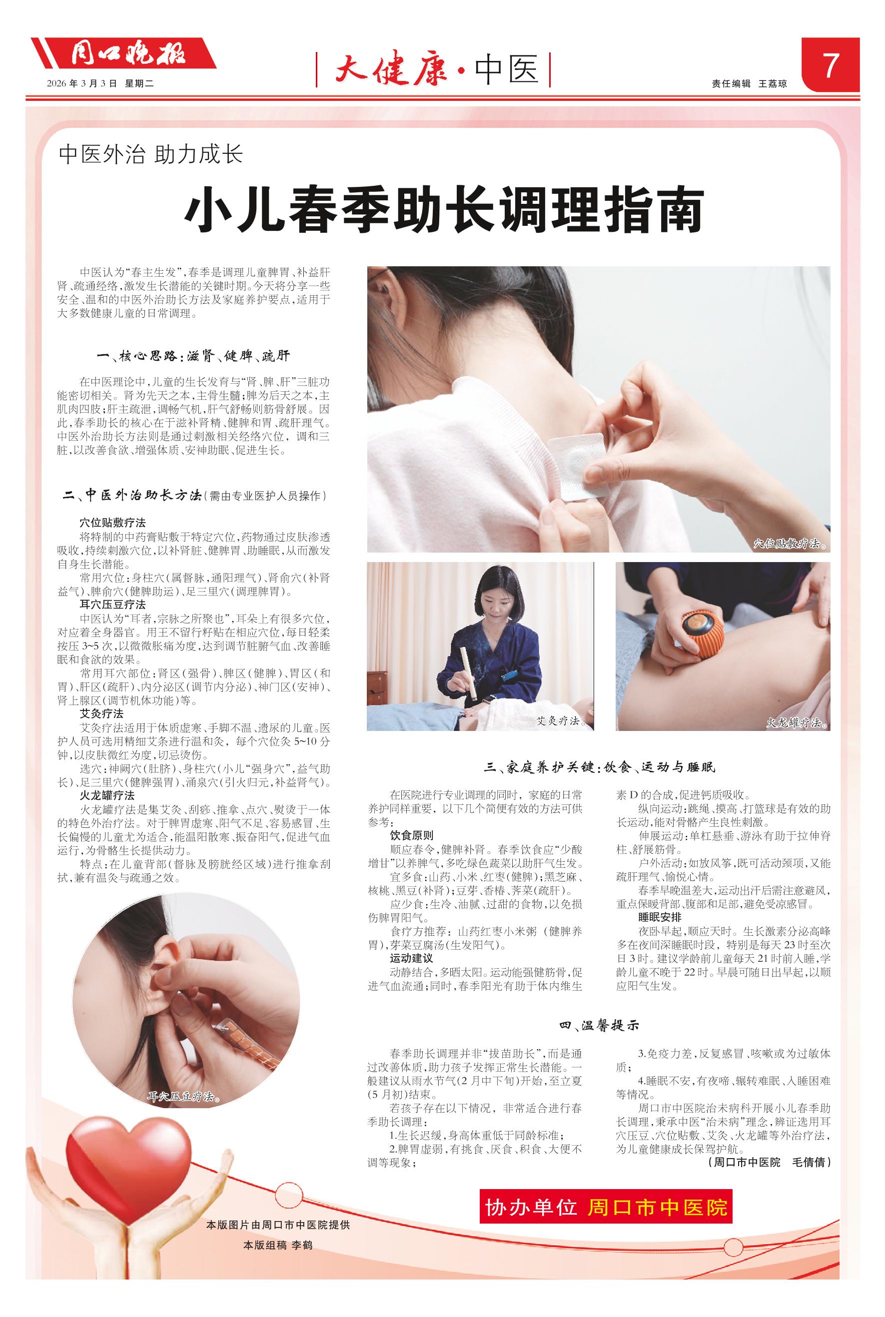 <div style='font-size: 16px!important;line-height: 28px!important;text-align: justify;color: #777!important;'>中医外治 助力成长</div><div style='font-size: 22px!important;line-height: 34px!important;text-align: justify!important;color: #000!important'>小儿春季助长调理指南</div><div style='font-size: 14px!important;line-height: 22px!important;text-align: left!important;color: #777!important;margin-top: 20px;'>周口晚报  2026-03-03</div><div><img id='paperImg' style='max-width: 100%;height: auto' src='//img.founderfx.cn/epaper/202603/02/f20889583d104a66afa3834873527d5f/7.jpg' alt='' class='page-img'/></div><div style='font-size: 14px!important;line-height: 22px!important;text-align: center!important;color: #777!important;'><img src='//img.founderfx.cn/epaper/202603/02/f20889583d104a66afa3834873527d5f/07/ad26cb731410766b70244666d3166e0f_s.jpg'style='display: block!important;margin: auto!important;max-width: 100%!important;'/> 穴位贴敷疗法。<img src='//img.founderfx.cn/epaper/202603/02/f20889583d104a66afa3834873527d5f/07/a227a8d66466dcadd7fbae075443885a_s.jpg'style='display: block!important;margin: auto!important;max-width: 100%!important;'/> 火龙罐疗法。<img src='//img.founderfx.cn/epaper/202603/02/f20889583d104a66afa3834873527d5f/07/41fd15e4e2cdeb0c1724fafd4a83c9b4_s.jpg'style='display: block!important;margin: auto!important;max-width: 100%!important;'/> 艾灸疗法。<img src='//img.founderfx.cn/epaper/202603/02/f20889583d104a66afa3834873527d5f/07/ea3b1dafdb100363430243554061bb56_s.jpg'style='display: block!important;margin: auto!important;max-width: 100%!important;'/> 耳穴压豆疗法。</div><p> 中医认为“春主生发”,春季是调理儿童脾胃、补益肝肾、疏通经络,激发生长潜能的关键时期。今天将分享一些安全、温和的中医外治助长方法及家庭养护要点,适用于大多数健康儿童的日常调理。</p><p> 一、核心思路:滋肾、健脾、疏肝</p><p> 在中医理论中,儿童的生长发育与“肾、脾、肝”三脏功能密切相关。肾为先天之本,主骨生髓;脾为后天之本,主肌肉四肢;肝主疏泄,调畅气机,肝气舒畅则筋骨舒展。因此,春季助长的核心在于滋补肾精、健脾和胃、疏肝理气。中医外治助长方法则是通过刺激相关经络穴位,调和三脏,以改善食欲、增强体质、安神助眠、促进生长。</p><p> 二、中医外治助长方法(需由专业医护人员操作)</p><p> 穴位贴敷疗法</p><p> 将特制的中药膏贴敷于特定穴位,药物通过皮肤渗透吸收,持续刺激穴位,以补肾脏、健脾胃、助睡眠,从而激发自身生长潜能。</p><p> 常用穴位:身柱穴(属督脉,通阳理气)、肾俞穴(补肾益气)、脾俞穴(健脾助运)、足三里穴(调理脾胃)。</p><p> 耳穴压豆疗法</p><p> 中医认为“耳者,宗脉之所聚也”,耳朵上有很多穴位,对应着全身器官。用王不留行籽贴在相应穴位,每日轻柔按压3~5次,以微微胀痛为度,达到调节脏腑气血、改善睡眠和食欲的效果。</p><p> 常用耳穴部位:肾区(强骨)、脾区(健脾)、胃区(和胃)、肝区(疏肝)、内分泌区(调节内分泌)、神门区(安神)、肾上腺区(调节机体功能)等。</p><p> 艾灸疗法</p><p> 艾灸疗法适用于体质虚寒、手脚不温、遗尿的儿童。医护人员可选用精细艾条进行温和灸,每个穴位灸5~10分钟,以皮肤微红为度,切忌烫伤。</p><p> 选穴:神阙穴(肚脐)、身柱穴(小儿“强身穴”,益气助长)、足三里穴(健脾强胃)、涌泉穴(引火归元,补益肾气)。</p><p> 火龙罐疗法</p><p> 火龙罐疗法是集艾灸、刮痧、推拿、点穴、熨烫于一体的特色外治疗法。对于脾胃虚寒、阳气不足、容易感冒、生长偏慢的儿童尤为适合,能温阳散寒、振奋阳气,促进气血运行,为骨骼生长提供动力。</p><p> 特点:在儿童背部(督脉及膀胱经区域)进行推拿刮拭,兼有温灸与疏通之效。</p><p> 三、家庭养护关键:饮食、运动与睡眠</p><p> 在医院进行专业调理的同时,家庭的日常养护同样重要,以下几个简便有效的方法可供参考:</p><p> 饮食原则</p><p> 顺应春令,健脾补肾。春季饮食应“少酸增甘”以养脾气,多吃绿色蔬菜以助肝气生发。</p><p> 宜多食:山药、小米、红枣(健脾);黑芝麻、核桃、黑豆(补肾);豆芽、香椿、荠菜(疏肝)。</p><p> 应少食:生冷、油腻、过甜的食物,以免损伤脾胃阳气。</p><p> 食疗方推荐:山药红枣小米粥(健脾养胃),芽菜豆腐汤(生发阳气)。</p><p> 运动建议</p><p> 动静结合,多晒太阳。运动能强健筋骨,促进气血流通;同时,春季阳光有助于体内维生素D的合成,促进钙质吸收。</p><p> 纵向运动:跳绳、摸高、打篮球是有效的助长运动,能对骨骼产生良性刺激。</p><p> 伸展运动:单杠悬垂、游泳有助于拉伸脊柱、舒展筋骨。</p><p> 户外活动:如放风筝,既可活动颈项,又能疏肝理气、愉悦心情。</p><p> 春季早晚温差大,运动出汗后需注意避风,重点保暖背部、腹部和足部,避免受凉感冒。</p><p> 睡眠安排</p><p> 夜卧早起,顺应天时。生长激素分泌高峰多在夜间深睡眠时段,特别是每天23时至次日3时。建议学龄前儿童每天21时前入睡,学龄儿童不晚于22时。早晨可随日出早起,以顺应阳气生发。</p><p> 四、温馨提示</p><p> 春季助长调理并非“拔苗助长”,而是通过改善体质,助力孩子发挥正常生长潜能。一般建议从雨水节气(2月中下旬)开始,至立夏(5月初)结束。</p><p> 若孩子存在以下情况,非常适合进行春季助长调理:</p><p> 1.生长迟缓,身高体重低于同龄标准;</p><p> 2.脾胃虚弱,有挑食、厌食、积食、大便不调等现象;</p><p> 3.免疫力差,反复感冒、咳嗽或为过敏体质;</p><p> 4.睡眠不安,有夜啼、辗转