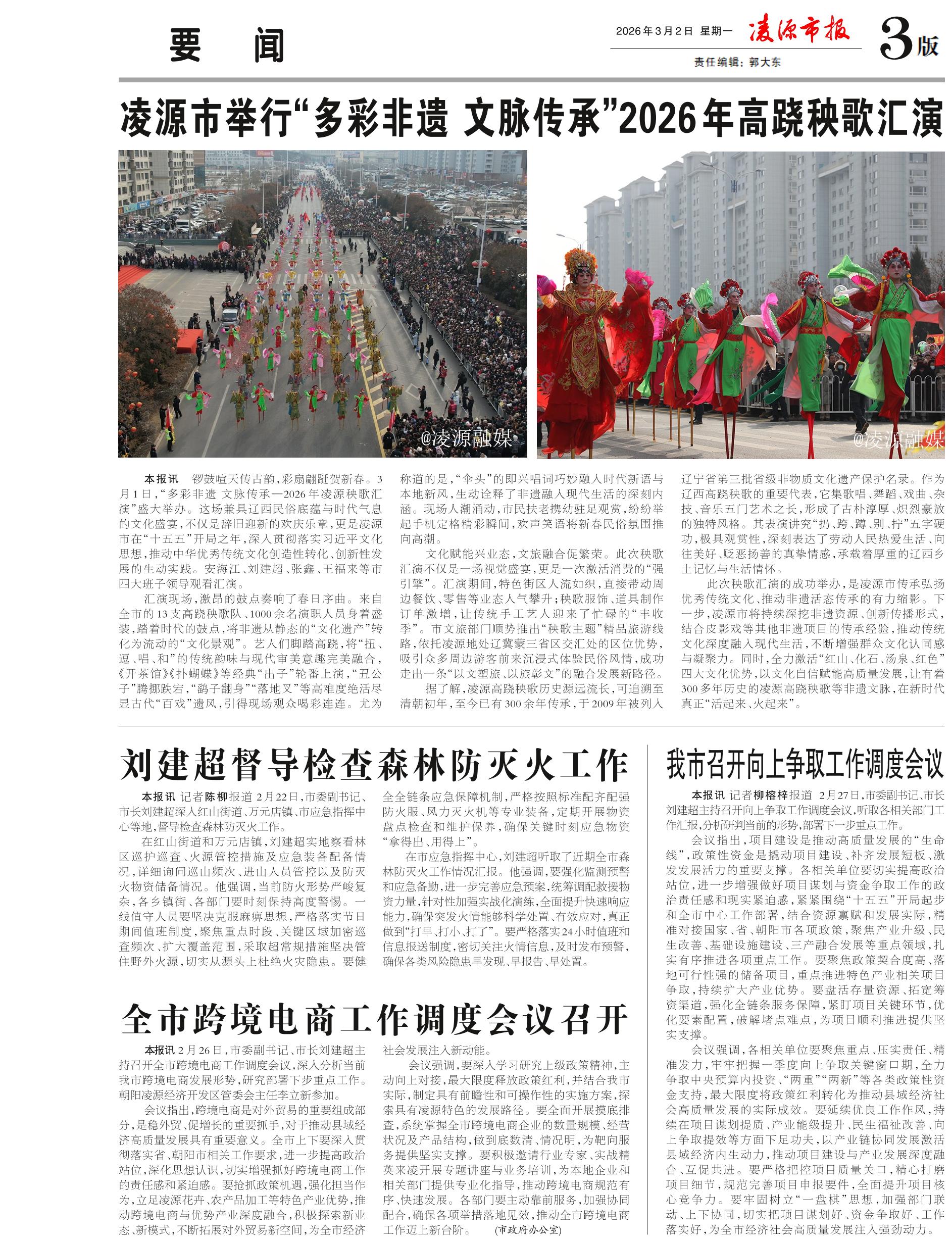 <div style='font-size: 22px!important;line-height: 34px!important;text-align: justify!important;color: #000!important'>我市召开向上争取工作调度会议</div><div style='font-size: 14px!important;line-height: 22px!important;text-align: left!important;color: #777!important;margin-top: 20px;'>凌源市报  2026-03-02</div><div><img id='paperImg' style='max-width: 100%;height: auto' src='//img.founderfx.cn/epaper/202603/03/9df84e1a61344a18b0cff523521f3798/3.jpg' alt='' class='page-img'/></div><p>本报讯 记者柳榕梓报道 2月27日,市委副书记、市长刘建超主持召开向上争取工作调度会议,听取各相关部门工作汇报,分析研判当前的形势,部署下一步重点工作。</p><p>会议指出,项目建设是推动高质量发展的“生命线”,政策性资金是撬动项目建设、补齐发展短板、激发发展活力的重要支撑。各相关单位要切实提高政治站位,进一步增强做好项目谋划与资金争取工作的政治责任感和现实紧迫感,紧紧围绕“十五五”开局起步和全市中心工作部署,结合资源禀赋和发展实际,精准对接国家、省、朝阳市各项政策,聚焦产业升级、民生改善、基础设施建设、三产融合发展等重点领域,扎实有序推进各项重点工作。要聚焦政策契合度高、落地可行性强的储备项目,重点推进特色产业相关项目争取,持续扩大产业优势。要盘活存量资源、拓宽筹资渠道,强化全链条服务保障,紧盯项目关键环节,优化要素配置,破解堵点难点,为项目顺利推进提供坚实支撑。</p><p>会议强调,各相关单位要聚焦重点、压实责任、精准发力,牢牢把握一季度向上争取关键窗口期,全力争取中央预算内投资、“两重”“两新”等各类政策性资金支持,最大限度将政策红利转化为推动县域经济社会高质量发展的实际成效。要延续优良工作作风,持续在项目谋划提质、产业能级提升、民生福祉改善、向上争取提效等方面下足功夫,以产业链协同发展激活县域经济内生动力,推动项目建设与产业发展深度融合、互促共进。要严格把控项目质量关口,精心打磨项目细节,规范完善项目申报要件,全面提升项目核心竞争力。要牢固树立“一盘棋”思想,加强部门联动、上下协同,切实把项目谋划好、资金争取好、工作落实好,为全市经济社会高质量发展注入强劲动力。</p>