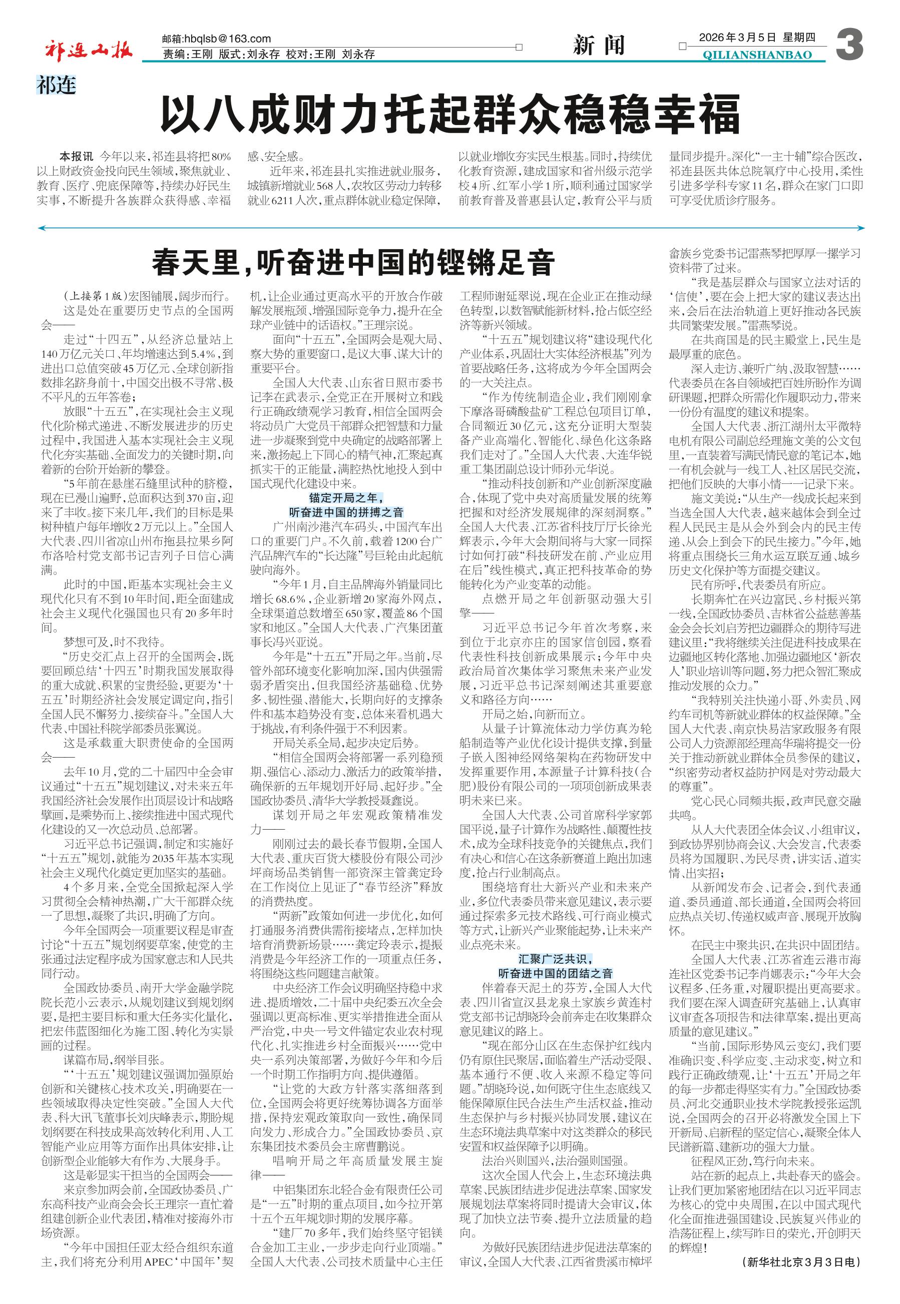 <div style='font-size: 22px!important;line-height: 34px!important;text-align: justify!important;color: #000!important'>春天里,听奋进中国的铿锵足音</div><div style='font-size: 14px!important;line-height: 22px!important;text-align: left!important;color: #777!important;margin-top: 20px;'>祁连山报  2026-03-05</div><div><img id='paperImg' style='max-width: 100%;height: auto' src='//img.founderfx.cn/epaper/202603/04/337046000c984d47ac86549e2f1578c1/3.jpg' alt='' class='page-img'/></div><p> (上接第1版)宏图铺展,阔步而行。</p><p> 这是处在重要历史节点的全国两会——</p><p> 走过“十四五”,从经济总量站上140万亿元关口、年均增速达到5.4%,到进出口总值突破45万亿元、全球创新指数排名跻身前十,中国交出极不寻常、极不平凡的五年答卷;</p><p> 放眼“十五五”,在实现社会主义现代化阶梯式递进、不断发展进步的历史过程中,我国进入基本实现社会主义现代化夯实基础、全面发力的关键时期,向着新的台阶开始新的攀登。</p><p> “5年前在悬崖石缝里试种的脐橙,现在已漫山遍野,总面积达到370亩,迎来了丰收。接下来几年,我们的目标是果树种植户每年增收2万元以上。”全国人大代表、四川省凉山州布拖县拉果乡阿布洛哈村党支部书记吉列子日信心满满。</p><p> 此时的中国,距基本实现社会主义现代化只有不到10年时间,距全面建成社会主义现代化强国也只有20多年时间。</p><p> 梦想可及,时不我待。</p><p> “历史交汇点上召开的全国两会,既要回顾总结‘十四五’时期我国发展取得的重大成就、积累的宝贵经验,更要为‘十五五’时期经济社会发展定调定向,指引全国人民不懈努力、接续奋斗。”全国人大代表、中国社科院学部委员张翼说。</p><p> 这是承载重大职责使命的全国两会——</p><p> 去年10月,党的二十届四中全会审议通过“十五五”规划建议,对未来五年我国经济社会发展作出顶层设计和战略擘画,是乘势而上、接续推进中国式现代化建设的又一次总动员、总部署。</p><p> 习近平总书记强调,制定和实施好“十五五”规划,就能为2035年基本实现社会主义现代化奠定更加坚实的基础。</p><p> 4个多月来,全党全国掀起深入学习贯彻全会精神热潮,广大干部群众统一了思想,凝聚了共识,明确了方向。</p><p> 今年全国两会一项重要议程是审查讨论“十五五”规划纲要草案,使党的主张通过法定程序成为国家意志和人民共同行动。</p><p> 全国政协委员、南开大学金融学院院长范小云表示,从规划建议到规划纲要,是把主要目标和重大任务实化量化,把宏伟蓝图细化为施工图、转化为实景画的过程。</p><p> 谋篇布局,纲举目张。</p><p> “‘十五五’规划建议强调加强原始创新和关键核心技术攻关,明确要在一些领域取得决定性突破。”全国人大代表、科大讯飞董事长刘庆峰表示,期盼规划纲要在科技成果高效转化利用、人工智能产业应用等方面作出具体安排,让创新型企业能够大有作为、大展身手。</p><p> 这是彰显实干担当的全国两会——</p><p> 来京参加两会前,全国政协委员、广东高科技产业商会会长王理宗一直忙着组建创新企业代表团,精准对接海外市场资源。</p><p> “今年中国担任亚太经合组织东道主,我们将充分利用APEC‘中国年’契机,让企业通过更高水平的开放合作破解发展瓶颈、增强国际竞争力,提升在全球产业链中的话语权。”王理宗说。</p><p> 面向“十五五”,全国两会是观大局、察大势的重要窗口,是议大事、谋大计的重要平台。</p><p> 全国人大代表、山东省日照市委书记李在武表示,全党正在开展树立和践行正确政绩观学习教育,相信全国两会将动员广大党员干部群众把智慧和力量进一步凝聚到党中央确定的战略部署上来,激扬起上下同心的精气神,汇聚起真抓实干的正能量,满腔热忱地投入到中国式现代化建设中来。</p><p> 锚定开局之年,</p><p> 听奋进中国的拼搏之音</p><p> 广州南沙港汽车码头,中国汽车出口的重要门户。不久前,载着1200台广汽品牌汽车的“长达隆”号巨轮由此起航驶向海外。</p><p> “今年1月,自主品牌海外销量同比增长68.6%,企业新增20家海外网点,全球渠道总数增至650家,覆盖86个国家和地区。”全国人大代表、广汽集团董事长冯兴亚说。</p><p> 今年是“十五五”开局之年。当前,尽管外部环境变化影响加深,国内供强需弱矛盾突出,但我国经济基础稳、优势多、韧性强、潜能大,长期向好的支撑条件和基本趋势没有变,总体来看机遇大于挑战,有利条件强于不利因素。</p><p> 开局关系全局,起步决定后势。</p><p> “相信全国两会将部署一系列稳预期、强信心、添动力、激活力的政策举措,确保新的五年规划开好局、起好步。”全国政协委员、清华大学教授聂鑫说。</p><p> 谋划开局之年宏观政策精准发力——</p><p> 刚刚过去的最长春节假期,全国人大代表、重庆百货大楼股份有限公司沙坪商场品类销售一部资深主管龚定玲在工作岗位上见证了“春节经济”释放的消费热度。</p><p> “两新”政策如何进一步优化,如何打通服务消费供需衔接堵点,怎样加快培育消费新场景……龚定玲表示,提振消费是今年经济工作的一项重点任务,将围绕这些问题建言献策。</p><p> 中央经济工作会议明确坚持稳中求进、提质增效,二十届中央纪委五次全会强调以更高标准、更实举措推进全面从严治党,中央一号文件锚定农业农村现代化、扎实推进乡