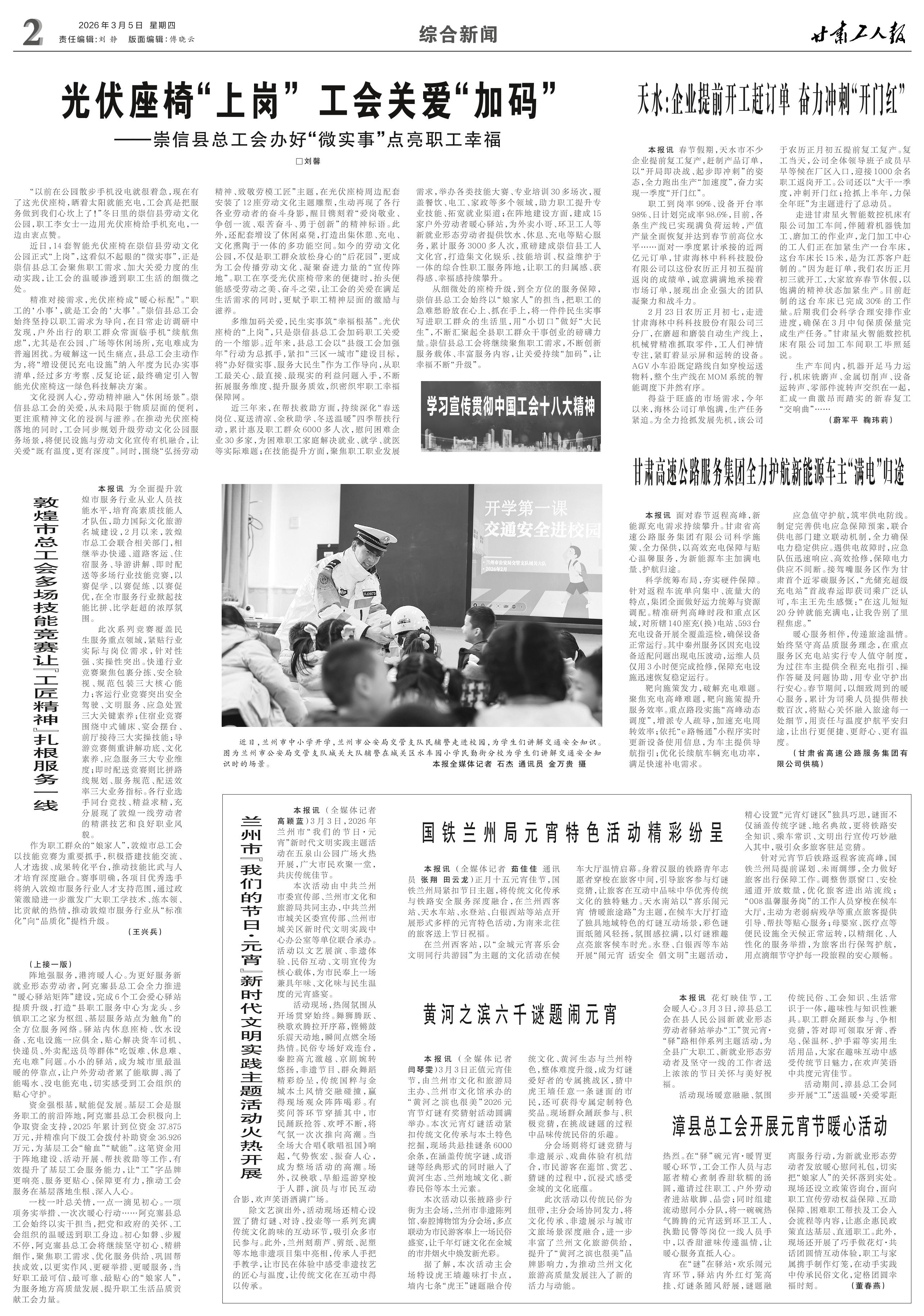<div style='font-size: 22px!important;line-height: 34px!important;text-align: justify!important;color: #000!important'>敦煌市总工会多场技能竞赛让“工匠精神”扎根服务一线</div><div style='font-size: 14px!important;line-height: 22px!important;text-align: left!important;color: #777!important;margin-top: 20px;'>甘肃工人报  2026-03-05</div><div><img id='paperImg' style='max-width: 100%;height: auto' src='//img.founderfx.cn/epaper/202603/05/ed64d52f72b747fe9ac7e924034d908d/2.jpg' alt='' class='page-img'/></div><p>本报讯 为全面提升敦煌市服务行业从业人员技能水平,培育高素质技能人才队伍,助力国际文化旅游名城建设,2月以来,敦煌市总工会联合相关部门,相继举办快递、道路客运、住宿服务、导游讲解、即时配送等多场行业技能竞赛,以赛促学、以赛促练、以赛促优,在全市服务行业掀起技能比拼、比学赶超的浓厚氛围。</p><p>此次系列竞赛覆盖民生服务重点领域,紧贴行业实际与岗位需求,针对性强、实操性突出。快递行业竞赛聚焦包裹分拣、安全验视、规范包装三大核心能力;客运行业竞赛突出安全驾驶、文明服务、应急处置三大关键素养;住宿业竞赛围绕中式铺床、宴会摆台、前厅接待三大实操技能;导游竞赛侧重讲解功底、文化素养、应急服务三大专业维度;即时配送竞赛则比拼路线规划、服务规范、配送效率三大业务指标。各行业选手同台竞技、精益求精,充分展现了敦煌一线劳动者的精湛技艺和良好职业风貌。</p><p>作为职工群众的“娘家人”,敦煌市总工会以技能竞赛为重要抓手,积极搭建技能交流、人才选拔、成果转化平台,推动技能比武与人才培育深度融合。赛事明确,各项目优秀选手将纳入敦煌市服务行业人才支持范围,通过政策激励进一步激发广大职工学技术、练本领、比贡献的热情,推动敦煌市服务行业从“标准化”向“品质化”提档升级。</p><p> (王兴兵)</p>
