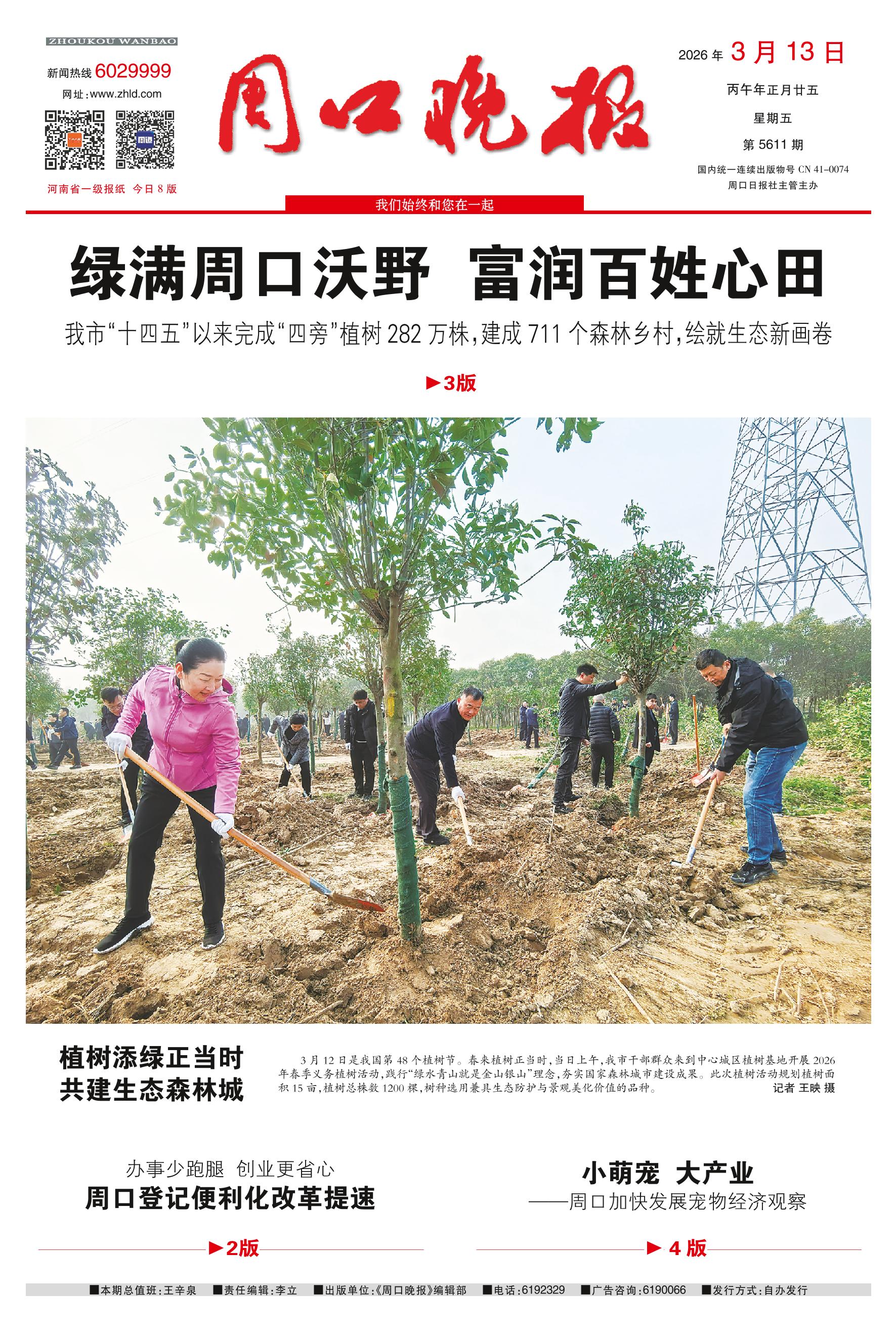 <div style='font-size: 22px!important;line-height: 34px!important;text-align: justify!important;color: #000!important'>植树添绿正当时 共建生态森林城</div><div style='font-size: 14px!important;line-height: 22px!important;text-align: left!important;color: #777!important;margin-top: 20px;'>周口晚报  2026-03-13</div><div><img id='paperImg' style='max-width: 100%;height: auto' src='//img.founderfx.cn/epaper/202603/13/411d8ab5e02748ecaab0d04cdc8a0737/1.jpg' alt='' class='page-img'/></div><div style='font-size: 14px!important;line-height: 22px!important;text-align: center!important;color: #777!important;'><img src='//img.founderfx.cn/epaper/202603/13/411d8ab5e02748ecaab0d04cdc8a0737/01/739bbf92ca113417c47c8af264f520f3_5_s.jpg'style='display: block!important;margin: auto!important;max-width: 100%!important;'/></div><p> 3月12日是我国第48个植树节。春来植树正当时,当日上午,我市干部群众来到中心城区植树基地开展2026年春季义务植树活动,践行“绿水青山就是金山银山”理念,夯实国家森林城市建设成果。此次植树活动规划植树面积15亩,植树总株数1200棵,树种选用兼具生态防护与景观美化价值的品种。记者 王映 摄</p>