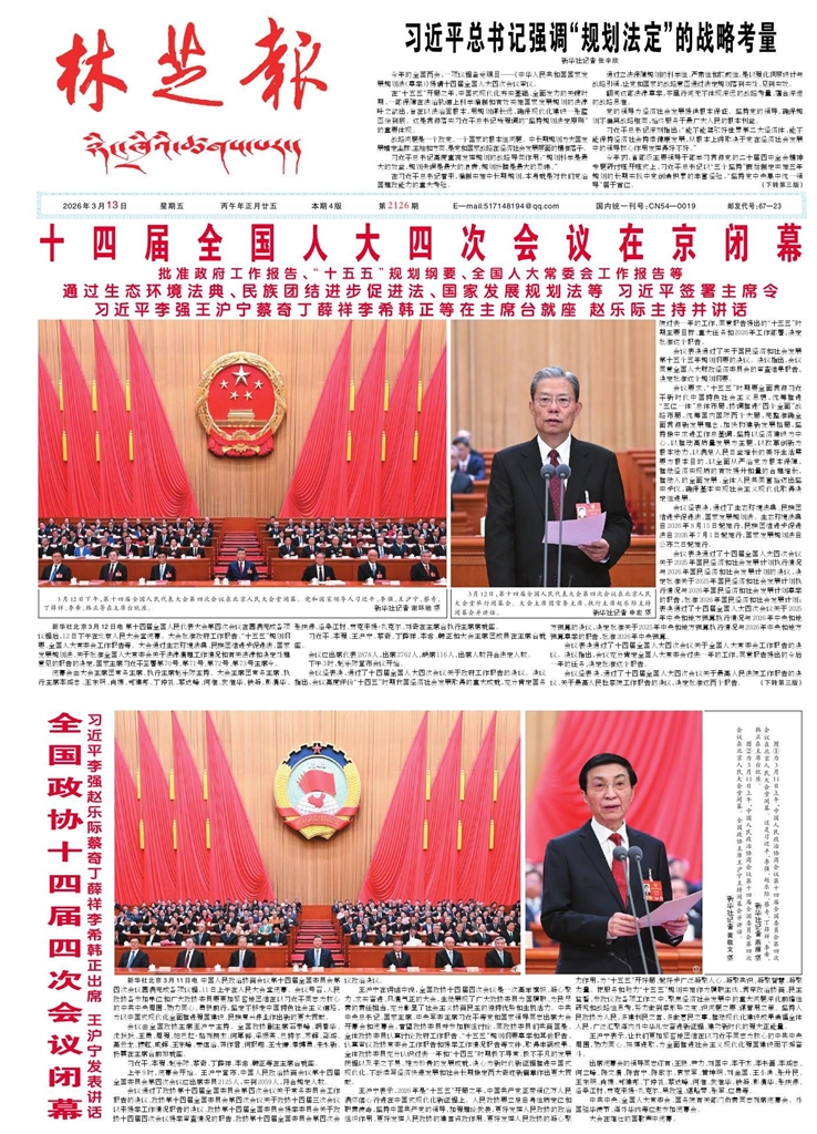 <div style='font-size: 22px!important;line-height: 34px!important;text-align: justify!important;color: #000!important'>十四届全国人大四次会议在京闭幕</div><div style='font-size: 16px!important;line-height: 28px!important;text-align: justify;color: #777!important;margin-top: 20px;'>批准政府工作报告、“十五五”规划纲要、全国人大常委会工作报告等</div><div style='font-size: 14px!important;line-height: 22px!important;text-align: left!important;color: #777!important;margin-top: 20px;'>林芝报-汉文版  2026-03-13</div><div><img id='paperImg' style='max-width: 100%;height: auto' src='//img.founderfx.cn/epaper/202603/13/cc07c1736ec04b36ba632646b346ed1f/1.jpg' alt='' class='page-img'/></div><div style='font-size: 14px!important;line-height: 22px!important;text-align: center!important;color: #777!important;'><img src='//img.founderfx.cn/epaper/202603/13/cc07c1736ec04b36ba632646b346ed1f/01/111039_chenyl_1773362854933_s.jpg'style='display: block!important;margin: auto!important;max-width: 100%!important;'/>3月12日下午,第十四届全国人民代表大会第四次会议在北京人民大会堂闭幕。党和国家领导人习近平、李强、王沪宁、蔡奇、丁薛祥、李希、韩正等在主席台就座。新华社记者 谢环驰 摄<img src='//img.founderfx.cn/epaper/202603/13/cc07c1736ec04b36ba632646b346ed1f/01/111040_chenyl_1773362855204_s.jpg'style='display: block!important;margin: auto!important;max-width: 100%!important;'/>3月12日,第十四届全国人民代表大会第四次会议在北京人民大会堂举行闭幕会。大会主席团常务主席、执行主席赵乐际主持闭幕会并讲话。新华社记者 申宏 摄</div><p>通过生态环境法典、民族团结进步促进法、国家发展规划法等 习近平签署主席令</p><p>习近平李强王沪宁蔡奇丁薛祥李希韩正等在主席台就座 赵乐际主持并讲话</p><p>新华社北京3月12日电 第十四届全国人民代表大会第四次会议在圆满完成各项议程后,12日下午在北京人民大会堂闭幕。大会批准政府工作报告、“十五五”规划纲要、全国人大常委会工作报告等。大会通过生态环境法典、民族团结进步促进法、国家发展规划法、关于批准全国人大常委会关于法律清理工作情况和有关法律和决定处理意见的报告的决定,国家主席习近平签署第70号、第71号、第72号、第73号主席令。</p><p>闭幕会由大会主席团常务主席、执行主席赵乐际主持。大会主席团常务主席、执行主席李鸿忠、王东明、肖捷、郑建邦、丁仲礼、蔡达峰、何维、武维华、铁凝、彭清华、张庆伟、洛桑江村、雪克来提·扎克尔、刘奇在主席台执行主席席就座。</p><p>习近平、李强、王沪宁、蔡奇、丁薛祥、李希、韩正和大会主席团成员在主席台就座。</p><p>会议应出席代表2878人,出席2762人,缺席116人,出席人数符合法定人数。</p><p>下午3时,赵乐际宣布会议开始。</p><p>会议经表决,通过了十四届全国人大四次会议关于政府工作报告的决议。决议指出,会议高度评价“十四五”时期我国经济社会发展取得的重大成就,充分肯定国务院过去一年的工作,同意报告提出的“十五五”时期主要目标、重大任务和2026年工作部署,决定批准这个报告。</p><p>会议表决通过了关于国民经济和社会发展第十五个五年规划纲要的决议。决议指出,会议同意全国人大财政经济委员会的审查结果报告,决定批准这个规划纲要。</p><p>会议要求,“十五五”时期要全面贯彻习近平新时代中国特色社会主义思想,统筹推进“五位一体”总体布局,协调推进“四个全面”战略布局,统筹国内国际两个大局,完整准确全面贯彻新发展理念,加快构建新发展格局,坚持稳中求进工作总基调,坚持以经济建设为中心,以推动高质量发展为主题,以改革创新为根本动力,以满足人民日益增长的美好生活需要为根本目的,以全面从严治党为根本保障,推动经济实现质的有效提升和量的合理增长,推动人的全面发展、全体人民共同富裕迈出坚实步伐,确保基本实现社会主义现代化取得决定性进展。</p><p>会议经表决,通过了生态环境法典、民族团结进步促进法、国家发展规划法。生态环境法典自2026年8月15日起施行,民族团结进步促进法自2026年7月1日起施行,国家发展规划法自公布之日起施行。</p><p>会议表决通过了十四届全国人大四次会议关于2025年国民经济和社会发展计划执行情况与2026年国民经济和社会发展计划的决议,决定批准关于2025年国民经济和社会发展计划执行情况与2026年国民经济和社会发展计划草案的报告,批准2026年国民经济和社会发展计划;表决通过了十四届全国人大四次会议关于2025年中央和地方预算执行情况与2026年中央和地方预算的决议,决定批准关于2025年中央和地方预算执行情况与2026年中央和地方预算草案的报告,批准2026年中央预算。</p><p>会议表决通过了十四届全国人大四次会议关于全国人大常委会工作报告的决议。决议指出,会议充分肯定全国人大常委会过去一年的工作,同意报告提出的今后一年的任务,决定批准这个报告。</p><p>会议经表决,通过了十四届全国人大四次会议关于最高人民法院工作报告的决议、关于最高人民检察院工作报告的决议,决定批准这两个报告。</p><p>会议表决通过了十四届全国人大四次会议关于批准全国人大常委会关于法律清理工作情况和有关法律和决定处理意见的报告的决定。</p><p>随后,赵乐际发表讲话。他说,十四届全国人大四次会议圆满完成了各项议程。会议坚持发扬民主、集