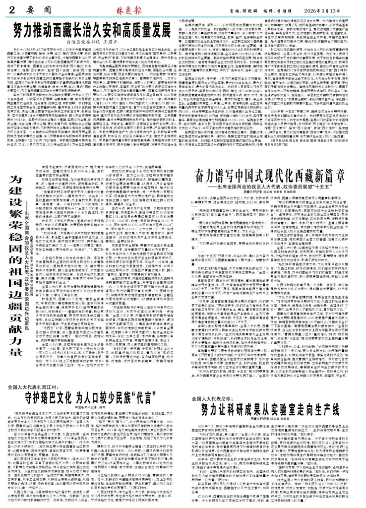 <div style='font-size: 22px!important;line-height: 34px!important;text-align: justify!important;color: #000!important'>努力推动西藏长治久安和高质量发展</div><div style='font-size: 16px!important;line-height: 28px!important;text-align: justify;color: #777!important;margin-top: 20px;'>自治区党委书记王君正</div><div style='font-size: 14px!important;line-height: 22px!important;text-align: left!important;color: #777!important;margin-top: 20px;'>林芝报-汉文版  2026-03-13</div><div><img id='paperImg' style='max-width: 100%;height: auto' src='//img.founderfx.cn/epaper/202603/13/cc07c1736ec04b36ba632646b346ed1f/2.jpg' alt='' class='page-img'/></div><p>党的十八大以来,以习近平同志为核心的党中央高度重视西藏工作,为西藏明确“稳定、发展、生态、强边”四件大事,形成并不断丰富发展了新时代党的治藏方略,为推动西藏长治久安和高质量发展、建设社会主义现代化新西藏指明了前进方向,提供了根本遵循。西藏自治区党委深刻领悟“两个确立”的决定性意义,增强“四个意识”、坚定“四个自信”、做到“两个维护”,认真贯彻党的二十大和二十届历次全会精神,全面贯彻落实习近平总书记关于西藏工作的重要指示和新时代党的治藏方略,坚持以习近平总书记考察西藏时的重要讲话精神统揽西藏经济社会发展全局,统筹推进“稳定、发展、生态、强边”四件大事落实,努力推动西藏经济社会发展不断取得新进步。</p><p>坚定不移巩固团结稳定的政治和社会局面,为长治久安打下坚实基础。习近平总书记强调,治藏稳藏兴藏,首先是要保持西藏的政治安定、社会稳定、民族团结、宗教和顺。我们牢固树立总体国家安全观,坚持警钟长鸣、警惕常在,以科学化机制和常态化、法治化理念把维护社会稳定工作做在日常、做到经常、落实在基层,社会大局保持持续和谐稳定,群众安全感满意度达99%以上。坚持夯实社会治理这个基础,坚持系统治理、依法治理、综合治理、源头治理,强化党建引领,加强社会治安整体防控体系和能力建设,不断提升社会治理体系和社会治理能力现代化水平。扎实推进中华民族共同体建设,持续开展全国民族团结进步模范区创建,深入开展铸牢中华民族共同体意识教育,各族群众“五个认同”不断增进。积极推动西藏与相关省份经济、文化、人员双向交流,2025年全区组织5万余名各族群众赴区外参访学习,3700余名高校毕业生到区外就业创业。全面贯彻党的宗教工作基本方针,常态化推进“国家意识、公民意识、法治意识”教育,不断完善宗教事务治理体系,提升宗教治理法治化水平,藏传佛教与社会主义社会日趋适应。</p><p>完整准确全面贯彻新发展理念,因地制宜推动高原经济高质量发展。西藏发展不是单纯的经济问题,而是政治问题、经济问题、社会问题、民生问题的辩证统一。我们坚持把“所有发展都要赋予民族团结进步的意义,都要赋予维护统一、反对分裂的意义,都要赋予改善民生、凝聚人心的意义,都要有利于提升各族群众获得感、幸福感、安全感”的总要求贯穿经济社会发展始终,努力推动经济社会高质量发展。西藏经济保持良好发展势头,主要经济指标增速连续几年位居全国前列,2025年地区生产总值增长7%、固定资产投资增长17.2%、一般公共预算收入增长14.7%、城乡居民人均可支配收入分别增长6%和7.4%。服务保障国家重大工程实施,雅下水电工程开工建设,川藏铁路全线加快推进,拉萨八廓古城保护与旧城改造提升工程有序推进,重大项目对经济发展的支撑作用越来越突显。立足西藏资源禀赋,重点发展高原特色优势产业,加快推动特色农牧业、高原轻工业、绿色矿业、藏医药、资源加工业等产业发展,深入推进文化旅游、边贸物流等现代服务业发展,产业结构持续优化。积极发展新质生产力,优化提升传统产业,积极培育发展清洁能源、数字经济、低空经济等新兴产业,推动产业提质升级。聚焦制约高质量发展的体制机制障碍,统筹推进深层次改革和高水平开放,服务和融入新发展格局,发展动力和社会活力持续增强。</p><p>坚持改善民生、凝聚人心,不断巩固党在西藏的执政基础。人心是最大的政治。我们坚持以人民为中心的发展思想,把群众身边的小事当作党委、政府的大事来抓,深入实施“十大民生工程”,用心用情用力办好就业、教育、医疗、社保等民生实事。应届高校毕业生就业率超过95%。全区职工和城乡居民基本医疗保险实现省级统筹,三甲医院实现七地(市)全覆盖。建设高原和美乡村1000个,所有乡镇和90%以上的行政村通硬化路。稳步推进城乡供暖供氧工程,全区海拔5000米以上乡镇、农牧区供暖实现全覆盖。脱贫攻坚成果持续巩固拓展,脱贫地区农牧民收入增速持续高于全区农牧民平均水平。科学高效有序开展定日抗震救灾和恢复重建工作,在高原缺氧、建材短缺、施工力量薄弱的地震灾区,实现了“当年受灾、当年入住”的工作目标。</p><p>坚持生态优先、保护第一,努力打造国家生态文明高地。西藏是重要的国家生态安全屏障,最大的价值在生态,最大的责任在生态,最大的潜力也在生态。我们深入贯彻落实习近平生态文明思想,牢固树立和践行“两山”理念,深入实施《中华人民共和国青藏高原生态保护法》,协同推进降碳、减污、扩绿、增长,不断筑牢国家生态安全屏障。持续打好蓝天、碧水、净土保卫战,让西藏的天更蓝、水更清