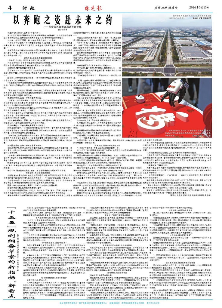 <div style='font-size: 22px!important;line-height: 34px!important;text-align: justify!important;color: #000!important'>以奔跑之姿赴未来之约</div><div style='font-size: 16px!important;line-height: 28px!important;text-align: justify;color: #777!important;margin-top: 20px;'>——从全国两会看开局之年新步伐</div><div style='font-size: 14px!important;line-height: 22px!important;text-align: left!important;color: #777!important;margin-top: 20px;'>林芝报-汉文版  2026-03-13</div><div><img id='paperImg' style='max-width: 100%;height: auto' src='//img.founderfx.cn/epaper/202603/13/cc07c1736ec04b36ba632646b346ed1f/4.jpg' alt='' class='page-img'/></div><div style='font-size: 14px!important;line-height: 22px!important;text-align: center!important;color: #777!important;'><img src='//img.founderfx.cn/epaper/202603/13/cc07c1736ec04b36ba632646b346ed1f/04/111012_chenyl_1773281286405_s.jpg'style='display: block!important;margin: auto!important;max-width: 100%!important;'/>图为2026年2月25日在江苏太仓拍摄的德企聚集区(无人机照片)。新华社记者 季春鹏 摄<img src='//img.founderfx.cn/epaper/202603/13/cc07c1736ec04b36ba632646b346ed1f/04/111013_chenyl_1773281286659_s.jpg'style='display: block!important;margin: auto!important;max-width: 100%!important;'/>图为2026年2月24日,人形机器人在湖北“全省加快建成中部地区崛起的重要战略支点推进大会”现场展示抓取豆腐。新华社记者 肖艺九 摄</div><p>新华社记者</p><p>中国的“两会时间”,世界的“中国时间”。</p><p>当“十五五”规划纲要草案绘出五年发展新画卷,当提请审议的政府工作报告亮出今年发展路线图,世界的目光聚焦中国盛会,探寻东方大国的发展密码。</p><p>2026年,“十五五”开局之年,恰逢中国共产党成立105周年。</p><p>习近平总书记强调:“我们要锚定目标任务,坚定信心、乘势而上,扎实推动高质量发展,进一步全面深化改革开放,推进全体人民共同富裕,续写中国奇迹新篇章。”</p><p>当世界经济在不确定性中徘徊,中国以高质量发展的确定性,为全球经济持续注入信心与力量。在以习近平同志为核心的党中央坚强领导下,亿万人民正以奔跑之姿共赴未来之约。</p><p>谋局开篇,锚定高质量发展新图景</p><p>“火车头”怎么跑?经济大省如何抓“新”创“高”?</p><p>习近平总书记5日下午参加江苏代表团审议时强调,江苏等经济大省处在改革开放前沿,要在研究新情况、解决新问题上下功夫、出经验。</p><p>开局起跑,锚定高质量发展新图景。</p><p>经济增长4.5%-5%,在实际工作中努力争取更好结果;居民消费价格涨幅2%左右;粮食产量1.4万亿斤左右;单位国内生产总值二氧化碳排放降低3.8%左右……</p><p>翻开约1.9万字的政府工作报告,一揽子年度发展新目标,向世界展现大变局下中国坚定有力的发展新步伐。</p><p>“中国确定的发展目标稳健有力,高质量发展的中国经济将给世界带来更多新机遇。”旁听十四届全国人大四次会议开幕会的尼加拉瓜驻华大使孔乐然对记者说。</p><p>“更加突出为‘十五五’开好局,今年政府工作报告注定承载着特殊分量。”中共中央党校(国家行政学院)教授韩保江委员表示,唯有锚定高质量发展主题,方能为后续更好发展打牢基础、积蓄动能。</p><p>把准起跑方向,让每一步奔跑都更有价值。</p><p>“从锚定一个数字到稳住一个区间,4.5%—5%的增长目标设定更加理性务实,总体衔接了2035年远景目标,有利于引导各方面把精力聚焦到高质量发展上来。”南方科技大学副校长金李委员表示。</p><p>“十四五”时期,我国经济总量跃上140万亿元新台阶,年均增速达到5.4%,人均国内生产总值连续3年超过1.3万美元。</p><p>党的十九届五中全会明确提出,到2035年我国人均国内生产总值达到中等发达国家水平。据专家研究测算,“十五五”和“十六五”时期我国经济年均增长4.17%以上就可以实现这个目标。</p><p>“区间意味着弹性。开局之年,我们有信心争取更好的结果,推动南通经济实力迈上新台阶。”江苏省南通市委书记吴新明代表说。</p><p>经济体量越大,向前发展就需要更大的推动力。</p><p>政府工作报告中,一系列新举措勾勒出“进”的方向:“着力建设强大国内市场”位列今年十大任务之首;以更多篇幅着墨“加紧培育壮大新动能”;加快推动全面绿色转型,今年将设立国家低碳转型基金……</p><p>“今年政府工作报告提出的碳排放指标,显示我国积极稳妥推进碳达峰碳中和、增强绿色发展动能的坚定决心。”隆基绿能董事长钟宝申代表说,“十五五”的一个目标,是推进非化石能源安全可靠有序替代化石能源,新能源仍然具有广阔的前景。</p><p>守护民生温度,让每一步奔跑都更有底气。</p><p>乍暖还寒时节,武陵山区腹地的重庆市酉阳土家族苗族自治县天山堡村里一片繁忙景象:村民的数百亩高山蔬菜陆续采收,中药材特色种植有声有色……昔日贫困村迎来新发展。</p><p>“今年是过渡期结束后转向常态化帮扶的第一年,我们将从产业、就业、民生三维发力,健全防返贫监测帮扶机制,接续推进乡村全面振兴。”天山堡村党支部书记冉慧代表说。</p><p>城镇新增就业1200万人以上,居民收入增长和经济增长同步,启动新一轮“双一流”建设,完善免费学前教育政策,扩大普惠养老服务供给,加强初婚初育家庭住房保障……</p><p>新的一年,更有温度的民生“清单”,把百姓期待转化为可感可及的幸福。</p><p>向新破局,充分挖掘经济潜能</p><p>外部环境变化影响加深