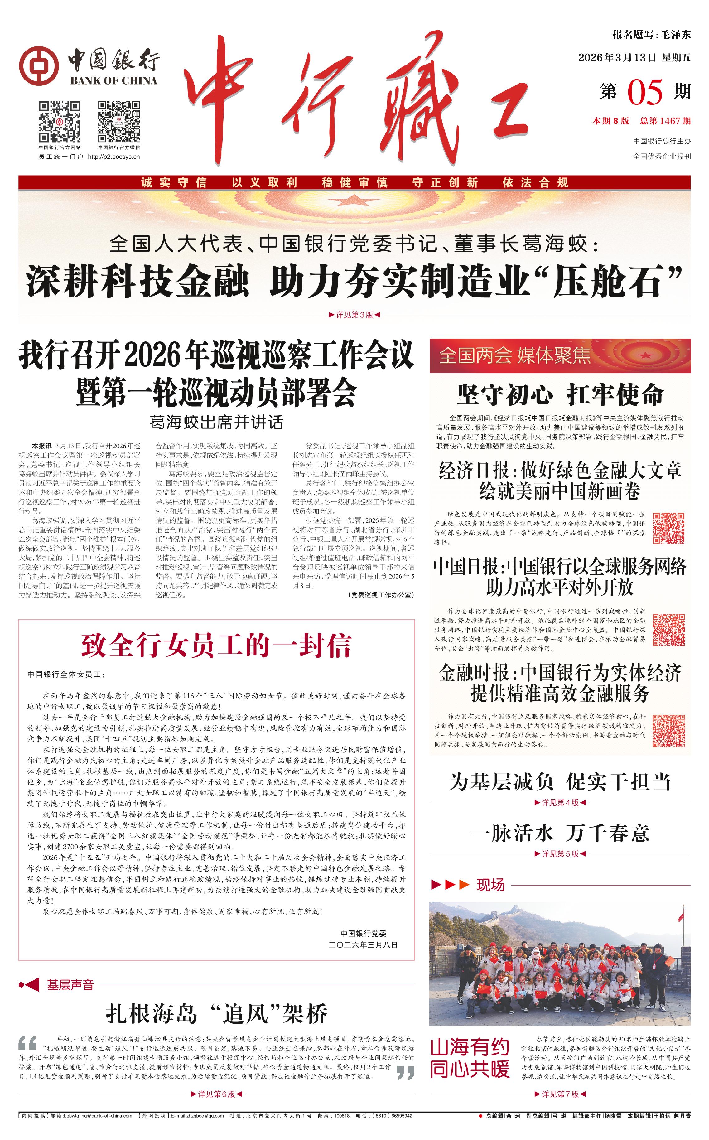 <div style='font-size: 22px!important;line-height: 34px!important;text-align: justify!important;color: #000!important'>我行召开2026年巡视巡察工作会议暨第一轮巡视动员部署会</div><div style='font-size: 16px!important;line-height: 28px!important;text-align: justify;color: #777!important;margin-top: 20px;'>葛海蛟出席并讲话</div><div style='font-size: 14px!important;line-height: 22px!important;text-align: left!important;color: #777!important;margin-top: 20px;'>中行职工报  2026-03-13</div><div><img id='paperImg' style='max-width: 100%;height: auto' src='//img.founderfx.cn/epaper/202603/15/fbb085ecf5ab4d5bb31490c859645195/1.jpg' alt='' class='page-img'/></div><p> 本报讯 3月13日,我行召开2026年巡视巡察工作会议暨第一轮巡视动员部署会,党委书记、巡视工作领导小组组长葛海蛟出席并作动员讲话。会议深入学习贯彻习近平总书记关于巡视工作的重要论述和中央纪委五次全会精神,研究部署全行巡视巡察工作,对2026年第一轮巡视进行动员。</p><p> 葛海蛟强调,要深入学习贯彻习近平总书记重要讲话精神,全面落实中央纪委五次全会部署,聚焦“两个维护”根本任务,做深做实政治巡视。坚持围绕中心、服务大局,紧扣党的二十届四中全会精神,将巡视巡察与树立和践行正确政绩观学习教育结合起来,发挥巡视政治保障作用。坚持问题导向、严的基调,进一步提升巡视震慑力穿透力推动力。坚持系统观念、发挥综合监督作用,实现系统集成、协同高效。坚持实事求是、依规依纪依法,持续提升发现问题精准度。</p><p> 葛海蛟要求,要立足政治巡视监督定位,围绕“四个落实”监督内容,精准有效开展监督。要围绕加强党对金融工作的领导,突出对贯彻落实党中央重大决策部署、树立和践行正确政绩观、推进高质量发展情况的监督。围绕以更高标准、更实举措推进全面从严治党,突出对履行“两个责任”情况的监督。围绕贯彻新时代党的组织路线,突出对班子队伍和基层党组织建设情况的监督。围绕压实整改责任,突出对推动巡视、审计、监管等问题整改情况的监督。要提升监督能力,敢于动真碰硬,坚持同题共答,严明纪律作风,确保圆满完成巡视任务。</p><p> 党委副书记、巡视工作领导小组副组长刘进宣布第一轮巡视组组长授权任职和任务分工,驻行纪检监察组组长、巡视工作领导小组副组长苗雨峰主持会议。</p><p> 总行各部门、驻行纪检监察组办公室负责人,党委巡视组全体成员,被巡视单位班子成员,各一级机构巡察工作领导小组成员参加会议。</p><p> 根据党委统一部署,2026年第一轮巡视将对江苏省分行、湖北省分行、深圳市分行、中银三星人寿开展常规巡视,对6个总行部门开展专项巡视。巡视期间,各巡视组将通过值班电话、邮政信箱和内网平台受理反映被巡视单位领导干部的来信来电来访,受理信访时间截止到2026年5月8日。(党委巡视工作办公室)</p>