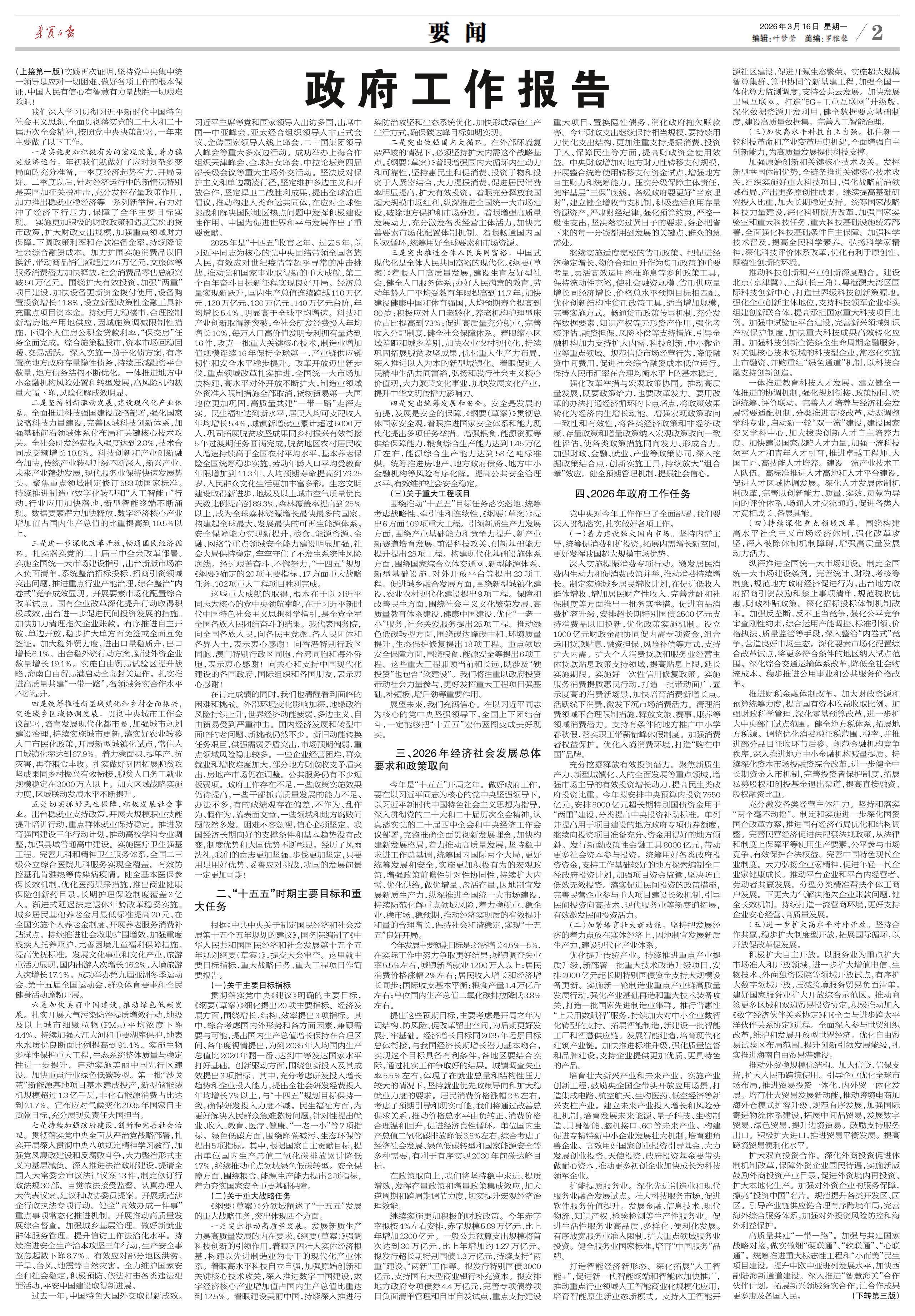 <div style='font-size: 22px!important;line-height: 34px!important;text-align: justify!important;color: #000!important'>政府工作报告</div><div style='font-size: 16px!important;line-height: 28px!important;text-align: justify;color: #777!important;margin-top: 20px;'>——2026年3月5日在第十四届全国人民代表大会第四次会议上</div><div style='font-size: 14px!important;line-height: 22px!important;text-align: left!important;color: #777!important;margin-top: 20px;'>来宾日报   国务院总理 李 强  2026-03-16</div><div><img id='paperImg' style='max-width: 100%;height: auto' src='//img.founderfx.cn/epaper/202603/15/93e5b40472ae48c29469ae6e61ab3278/2.jpg' alt='' class='page-img'/></div><p> 各位代表:</p><p> 现在,我代表国务院,向大会作政府工作报告,请予审议,并请全国政协委员提出意见。</p><p> 一、2025年工作回顾</p><p> 2025年是很不平凡的一年。党的二十届四中全会胜利召开,擘画了未来五年我国发展的宏伟蓝图。我们隆重纪念中国人民抗日战争暨世界反法西斯战争胜利80周年,设立台湾光复纪念日,极大振奋民族精神、激发爱国热情、凝聚奋斗力量。面对国内外形势深刻复杂的变化,以习近平同志为核心的党中央团结带领全国各族人民迎难而上、奋力拼搏,坚定不移贯彻新发展理念、推动高质量发展,统筹国内国际两个大局,全年经济社会发展主要目标任务顺利完成,“十四五”圆满收官,中国式现代化迈出新的坚实步伐。</p><p> 一年来,我国经济顶压前行、展现强大韧性。经济运行总体平稳、稳中有进,国内生产总值增长5%,总量达到140.19万亿元。就业总体稳定,城镇新增就业1267万人,城镇调查失业率平均为5.2%。对外贸易较快增长,出口多元化成效明显,国际收支基本平衡。民生保障更加有力,居民收入增长和经济增长同步,脱贫攻坚成果巩固拓展,实施学前一年免费教育政策、惠及1400万儿童,全面实施育儿补贴制度、惠及3000多万婴幼儿。粮食产量达到1.43万亿斤。重点领域风险化解取得积极进展,社会大局保持稳定。</p><p> 一年来,我国发展向新向优、彰显蓬勃活力。新质生产力稳步发展,科技创新成果丰硕,人工智能、生物医药、机器人、量子科技等研发应用走在世界前列,芯片自主研发有了新突破,天问二号开启“追星”之旅,北斗规模应用全面拓展,雅下水电工程开工建设,首艘国产电磁弹射型航母福建舰正式入列,国产大模型引领全球开源生态。产业结构持续优化,高技术制造业、装备制造业增加值分别增长9.4%、9.2%,工业机器人、集成电路产量分别增长28%、10.9%,新能源汽车年产量超过1600万辆,电动汽车充电设施突破2000万个。单位国内生产总值能耗降低5.1%,生态环境质量持续改善。</p><p> 过去一年取得的成绩来之不易。我们面对的是多年少有的外部冲击挑战和国内两难多难问题交织叠加的复杂严峻形势。国际经贸环境急剧变化,单边主义、保护主义陡然升级,市场预期受到频繁扰动,对外贸易明显承压。国内经济深刻转型,深层次结构性矛盾问题持续显现,消费、投资增长动力不足。以习近平同志为核心的党中央带领我们沉着应对、勇毅前行,对外有理有力有效开展经贸斗争,坚定维护我国利益,中美5轮经贸磋商取得积极成果,两国元首釜山会晤达成重要共识,为经贸合作注入更多稳定性;对内打好政策“组合拳”,加强宏观政策逆周期调节,着力稳就业、稳企业、稳市场、稳预期,集中力量办好自己的事。我们从最坏处打算,向最好处努力,不仅稳住了宏观经济大盘,推动高质量发展取得新成效,而且极大提振了全社会的士气和信心。在这个过程中,我们进一步认识到,做好新形势下经济工作必须充分挖掘经济潜能、必须坚持政策支持和改革创新并举、必须做到既“放得活”又“管得好”、必须坚持投资于物和投资于人紧密结合、必须以苦练内功来应对外部挑战。实践再次证明,坚持党中央集中统一领导是应对一切困难、做好各项工作的根本保证,中国人民有信心有智慧有力量战胜一切艰难险阻!</p><p> 我们深入学习贯彻习近平新时代中国特色社会主义思想,全面贯彻落实党的二十大和二十届历次全会精神,按照党中央决策部署,一年来主要做了以下工作。</p><p> 一是实施更加积极有为的宏观政策,着力稳定经济运行。年初我们就做好了应对复杂多变局面的充分准备,一季度经济起势有力、开局良好。二季度以后,针对经济运行中的新情况特别是美国加征关税冲击,充分发挥存量政策作用,加力推出稳就业稳经济等一系列新举措,有力对冲了经济下行压力,保障了全年主要目标实现。 实施更加积极的财政政策和适度宽松的货币政策,扩大财政支出规模,加强重点领域财力保障,下调政策利率和存款准备金率,持续降低社会综合融资成本。加力扩围实施消费品以旧换新,带动商品销售额超过2.6万亿元,文旅体等服务消费潜力加快释放,社会消费品零售总额突破50万亿元。围绕扩大有效投资,加强“两重”项目建设,加快设备更新资金拨付使用,设备购置投资增长11.8%,设立新型政策性金融工具补充重点项目资本金。持续用力稳楼市,合理控制新增</p><p> 房地产用地供应,因城施策调减限制性措施,下调个人住房公积金贷款利率,“保交房”任务全面完成。综合施策稳股市,资本市场回稳回暖、交易活跃。深入实施一揽子化债方案,有序置换地方政府存量隐性债务,持续压减融资平台数量,地方债务结构不断优化。一